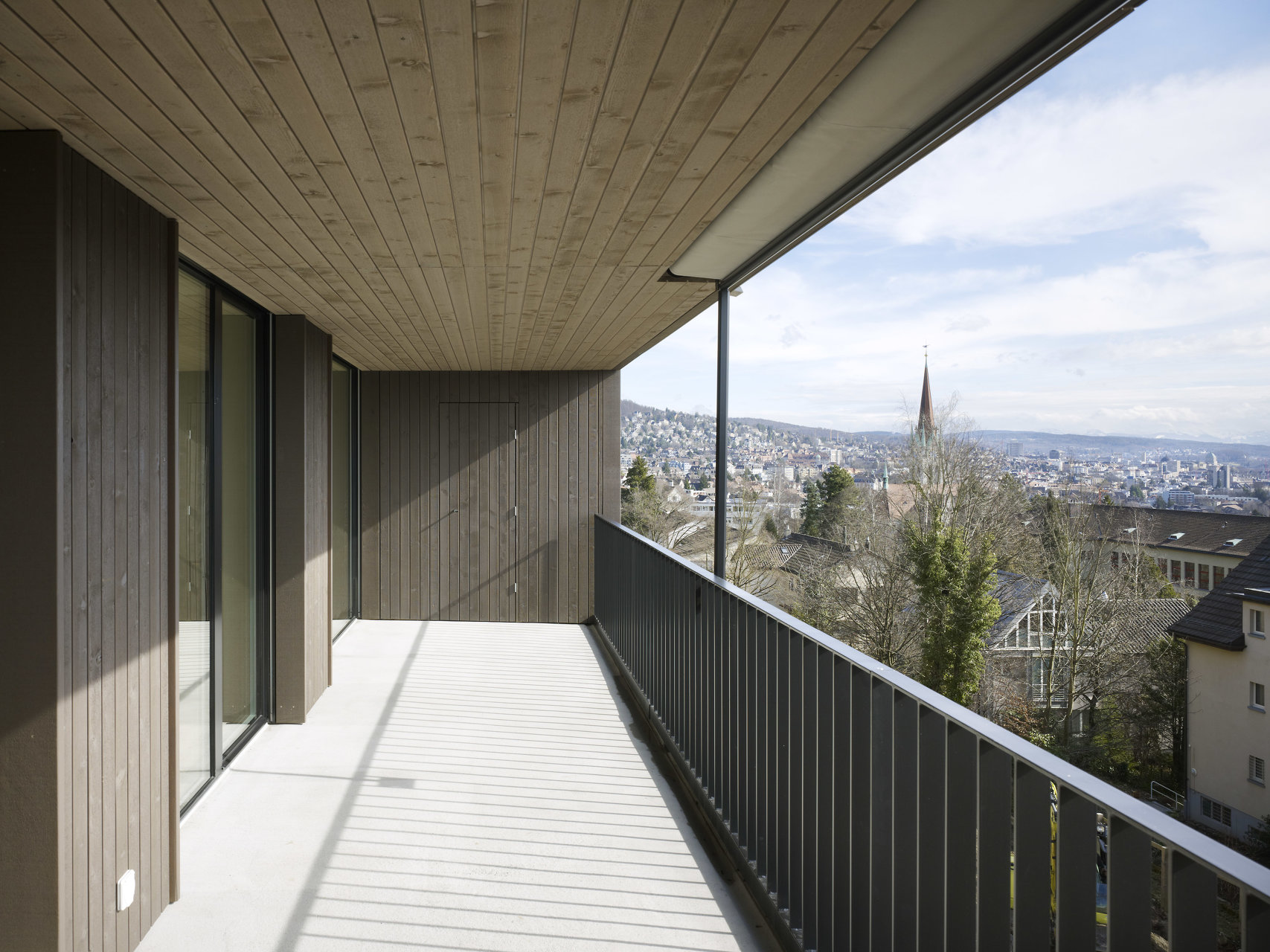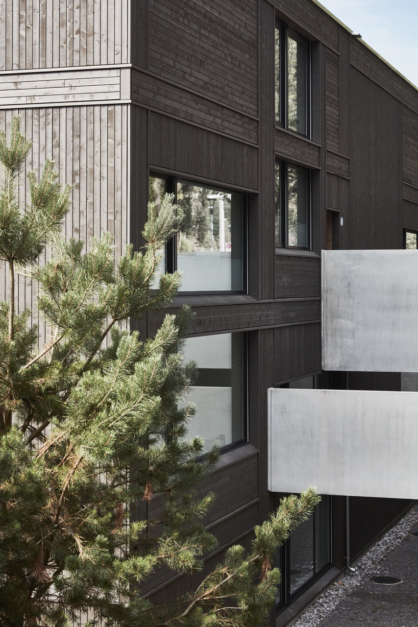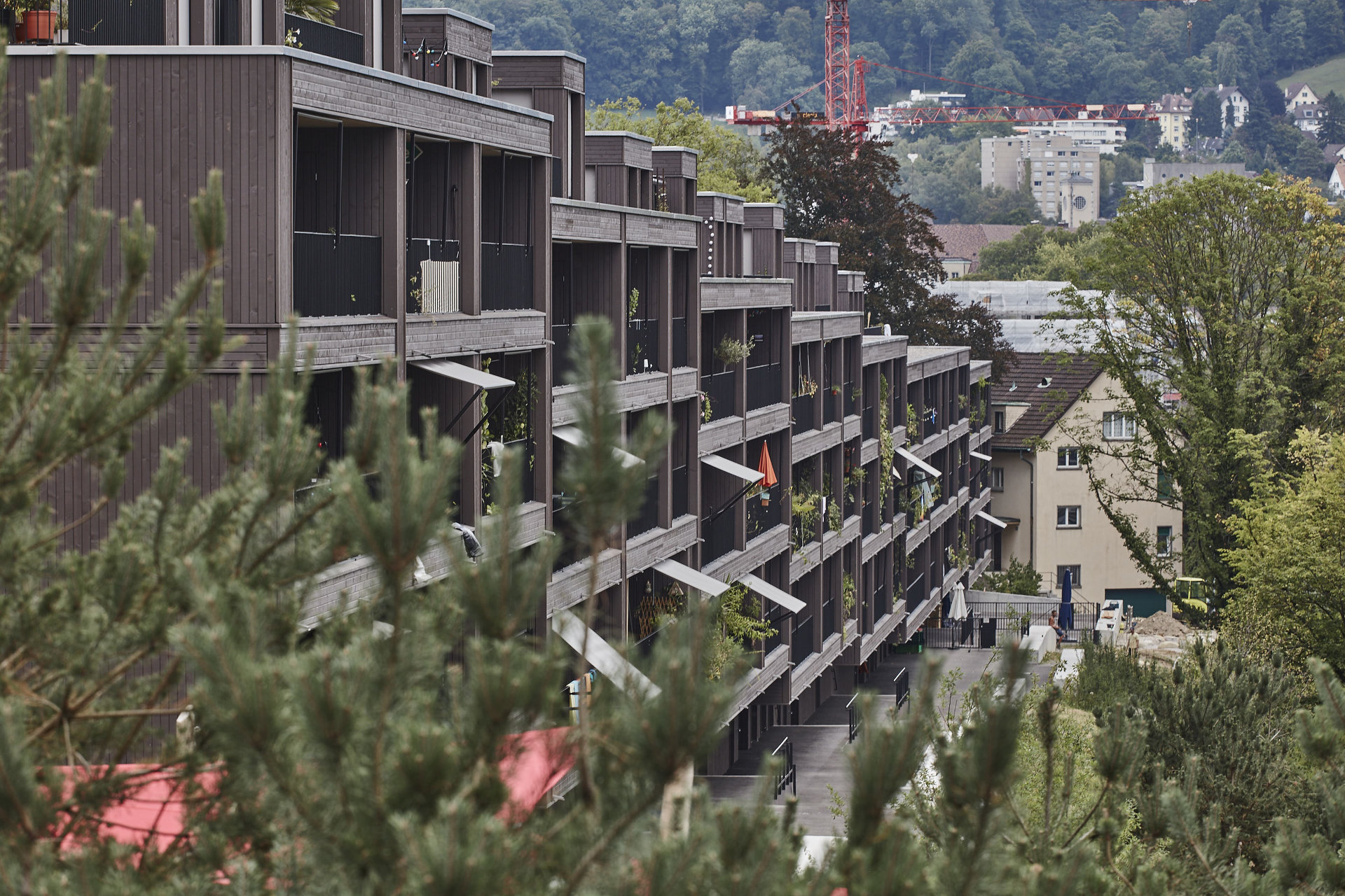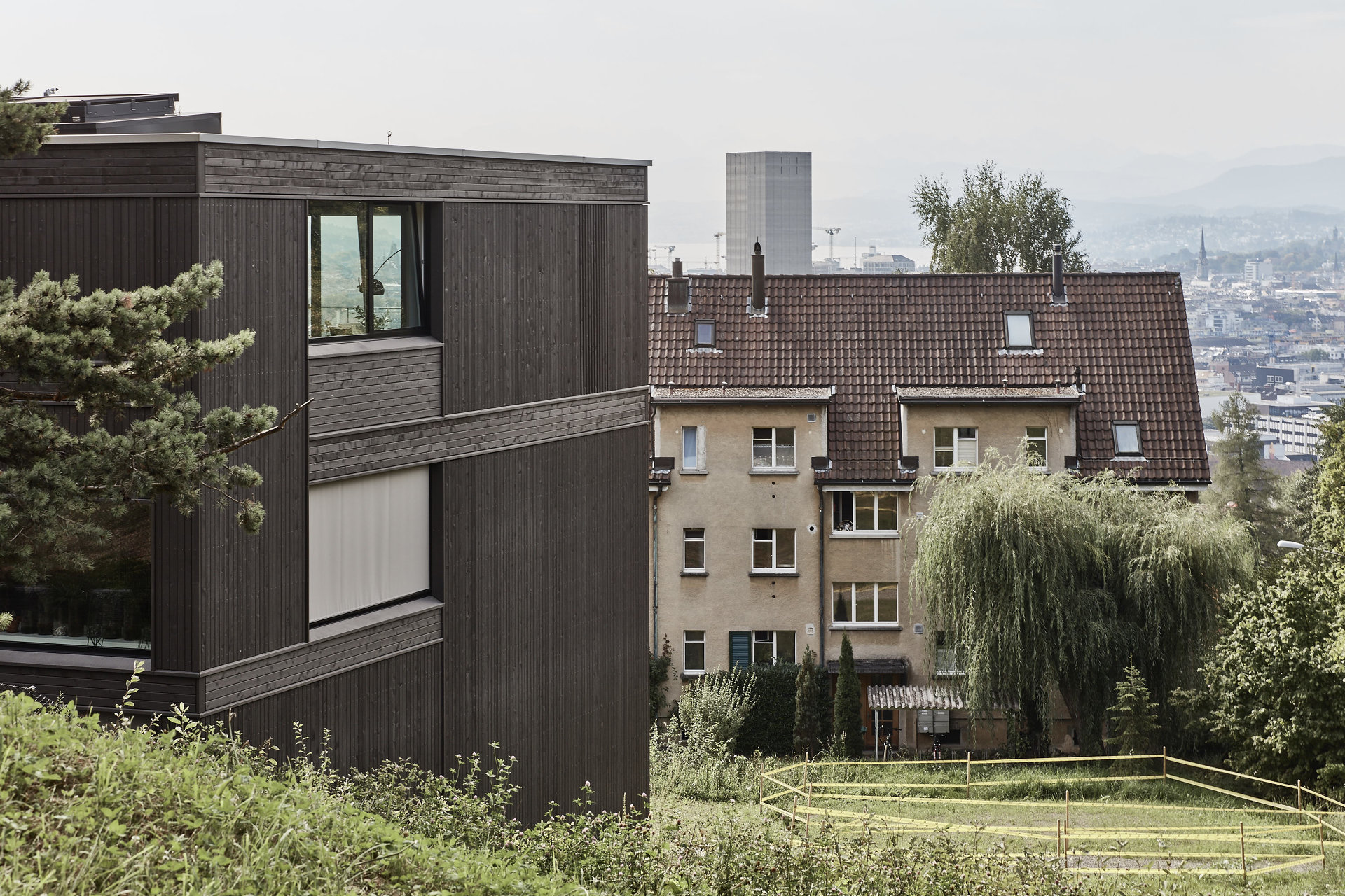 Beide Gebäude sind leicht abgetreppt und erhalten ihre Form durch den topografischen Verlauf, die Erschliessung und die Strasse. Der Genossenschaftsteil wird parallel zum Anstieg der Strasse gestaffelt. Die untere Hangetage erhält gemeinschaftliche Bereiche wie Hobbyräume, Farradabstellplätze und Kinderkrippen sowie eine vorgelagerte, gedeckte Zone für die Begegnungen der Bewohner. In der inneren Organisation ermöglichen Abstufung und horizontale Verschiebung unterschiedliche Wohntypen. Sämtliche Schlafzimmer sind südseitig orientiert und erhalten Zugang zur durchlaufenden Balkonschicht. Der viergeschossige Eigentumsteil wird linear auf der Anhöhe entwickelt und horizontal über Brücken erschlossen. Zentrales räumliches Element ist der beidseitig orientierte Wohn-Ess-Raum. Dieser wird gegen Norden überhoch ausgebildet und schliesst gegen Süden mit einer Loggia ab. Die dunkel gestrichene, sägerohe Holzfassade tritt als Geflecht mit vertikalen und horizontalen Elementen in Erscheinung, die ein variantenreiches Wechselspiel prägt. Dieses Geflecht lässt das Ensemble, das aus vielen einzelnen Häusern besteht, dennoch als eine Ganzheit erscheinen. Gleichzeitig verleiht die gewebte Fassade dieser Einheit Leichtigkeit. Die Erstellung in Holzbauweise mit einer inneren tragenden Betonstruktur gewährleistet bei einem kompakten Wandaufbau einen hochwertigen Wärmeschutz. (Text: Architekten)