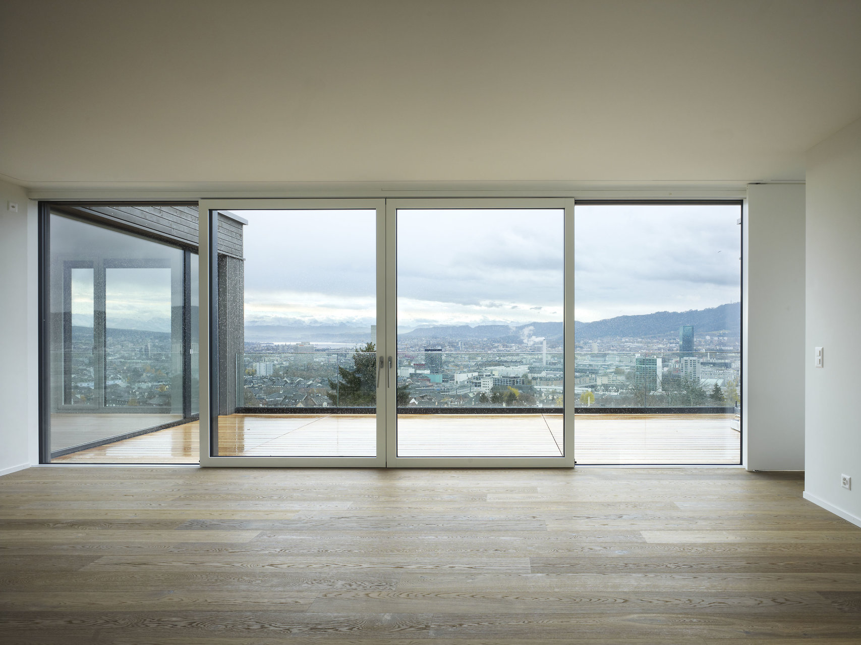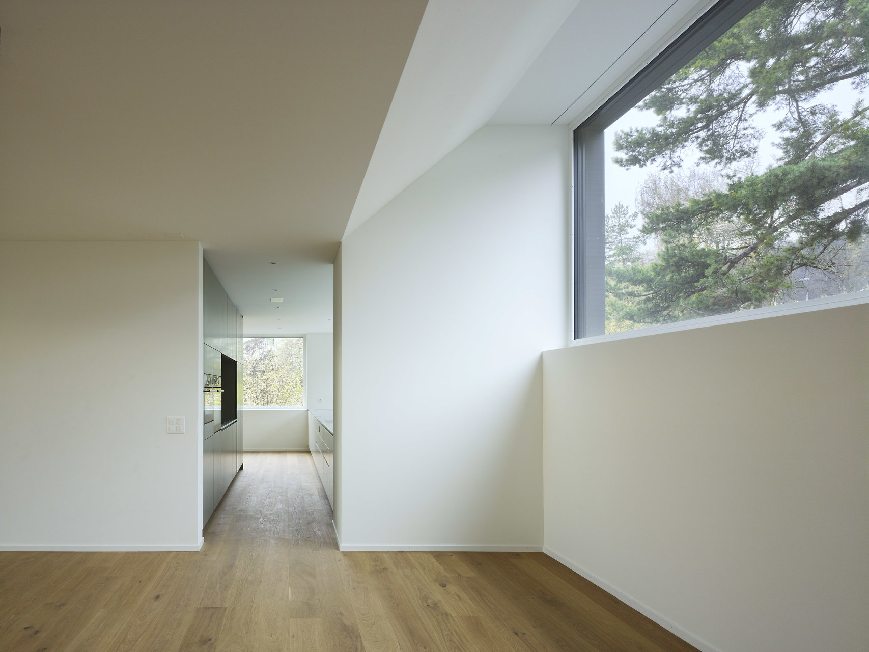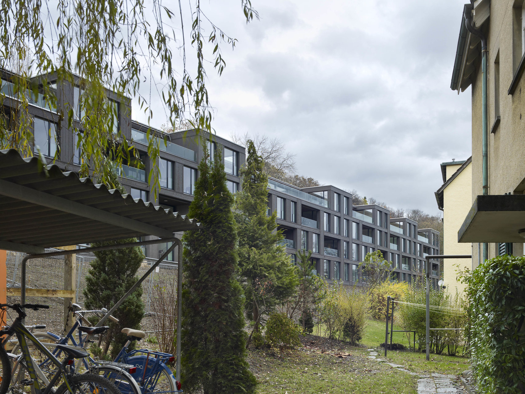 Der städtebauliche Lösungsansatz sieht zum einen Kontinuität zur Stadt vor, zum anderen deren Auflösung zugunsten starker landschaftlicher Bezüge. Zwei gerade Längskörper bilden eine interessante räumliche Sequenz aus Bauten und Freiraum. Der erste langestreckte Genossenschaftsbau begleitet den topografischen Anstieg, löst sich von der schön gekurvten Strassenführung und spannt einen Grünraum auf, der sich in der Folge schliesst und das Haus aus dem Hang auftauchen lässt. Im anschliessenden Zwischenraum stellt die Magerwiese als Landschaftsfuge grossräumige Bezüge her und sichert die Weiterführung der Grünräume von Gartensiedlung und Käferberg. Das zweite Haus, der Eigentumsteil, wird minimal abgedreht auf den Grat gesetzt und tritt, wie schon der andere Bau, als kompaktes Volumen auf, das mit Loggien und Terrassen nach Süden perforiert ist.