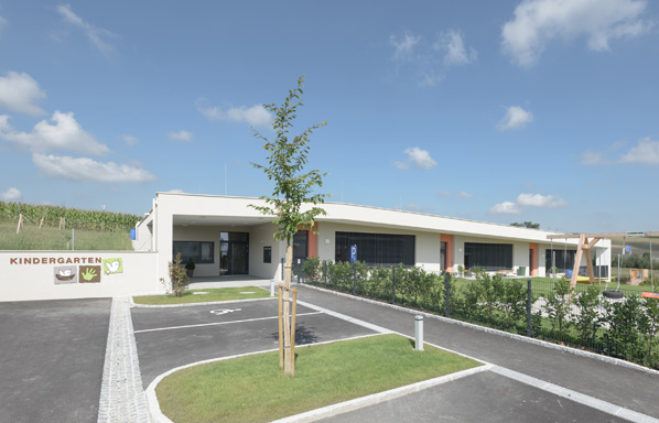 Das Grundstück weist eine nordseitige Hanglage auf. So wurde der neue Kindergarten auf mehreren Ebenen, dem Hang folgend geplant, um einerseits große Erdbewegungen zu vermeiden und andererseits den Baukörper harmonisch in die Umgebung einzufügen. Besonderer Wert wurde auf das Öffnen der Räume durch größtmögliche Gruppenraumverglasungen gelegt.