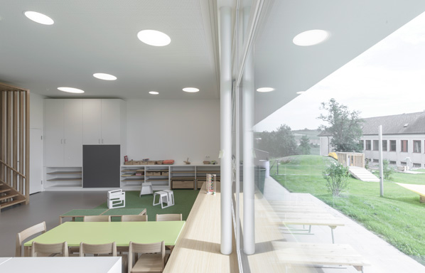 Durch die gewählte Massivbauweise, die reduzierte Material- und Farbkonzeption der Gesamtgestaltung entstand gestalterische Qualität mit dem Ziel, langfristig die Anforderungen an einen Kindergarten erfüllen. Die erforderliche Flexibilität wird durch diese bauliche Einfachheit bestmöglich gewährleistet. (Text: Architekten)