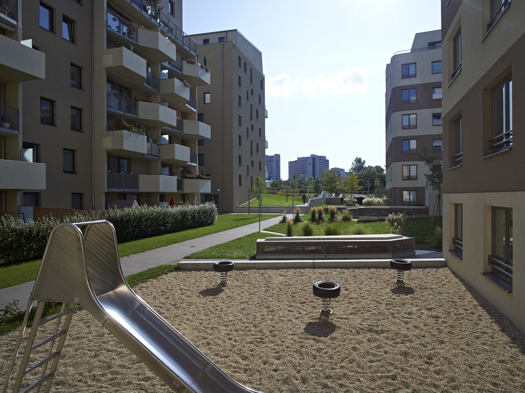 Der Kinderspielplatz ist zum Teil am Kinderspielraum im Durchgangsbereich als auch bauplatzübergreifend mit Bauplatz 1 situiert. Die gelungene Integration der Garagenentlüftungskörper durch das Architekturbüro Krischanitz trägt wesentlich zu dem stimmigen Gesamtbild im Hofbereich bei. Die Vorzone zur Strasse ist entsprechend der Freiraumkoordination von Gräserstreifen durchzogen. Eine besondere Herausforderung stellte die Abwicklung des Höhenunterschieds zum Park dar, welche mit hangbefestigenden Efeupflanzungen ausgeführt wurde.