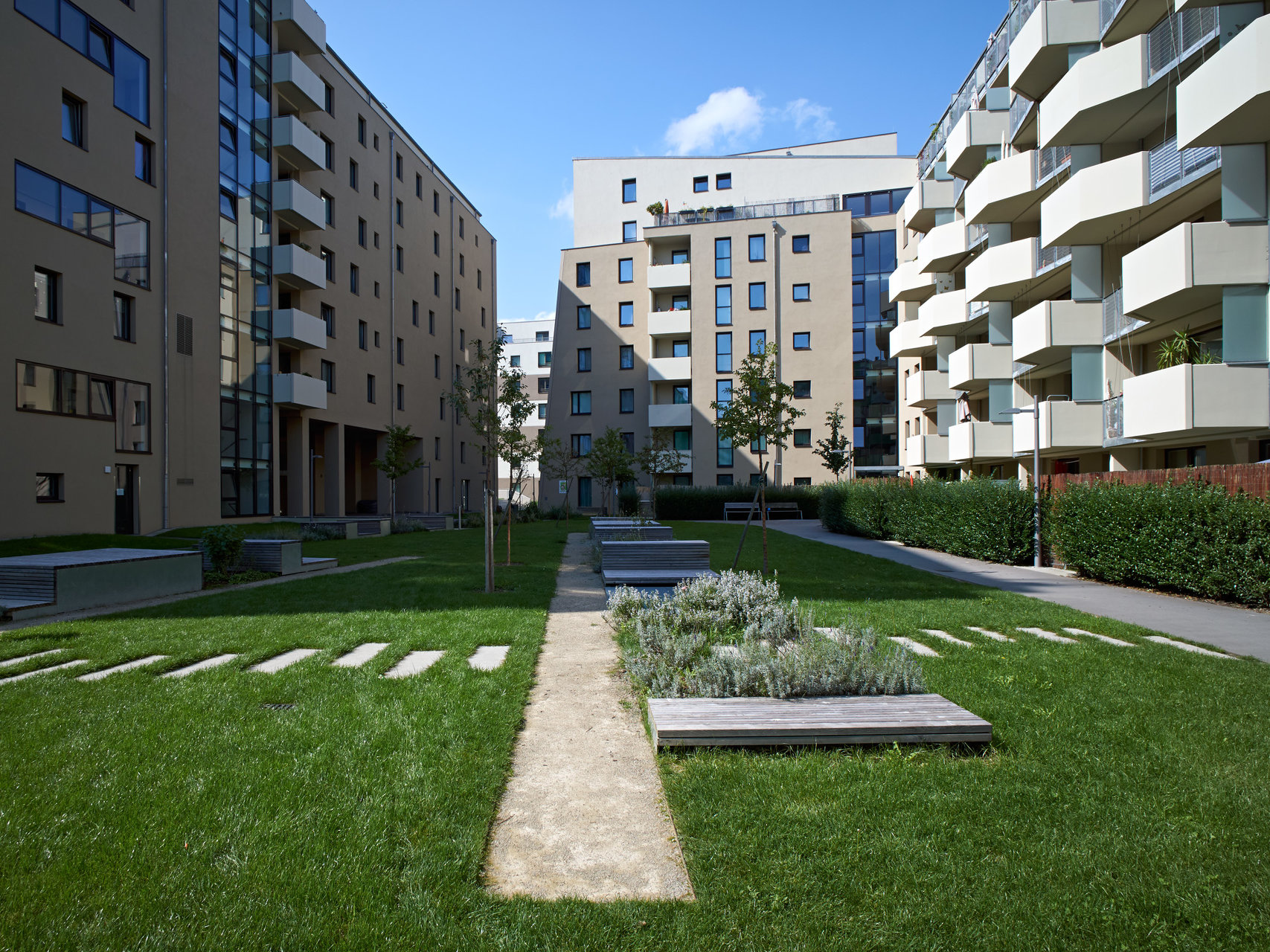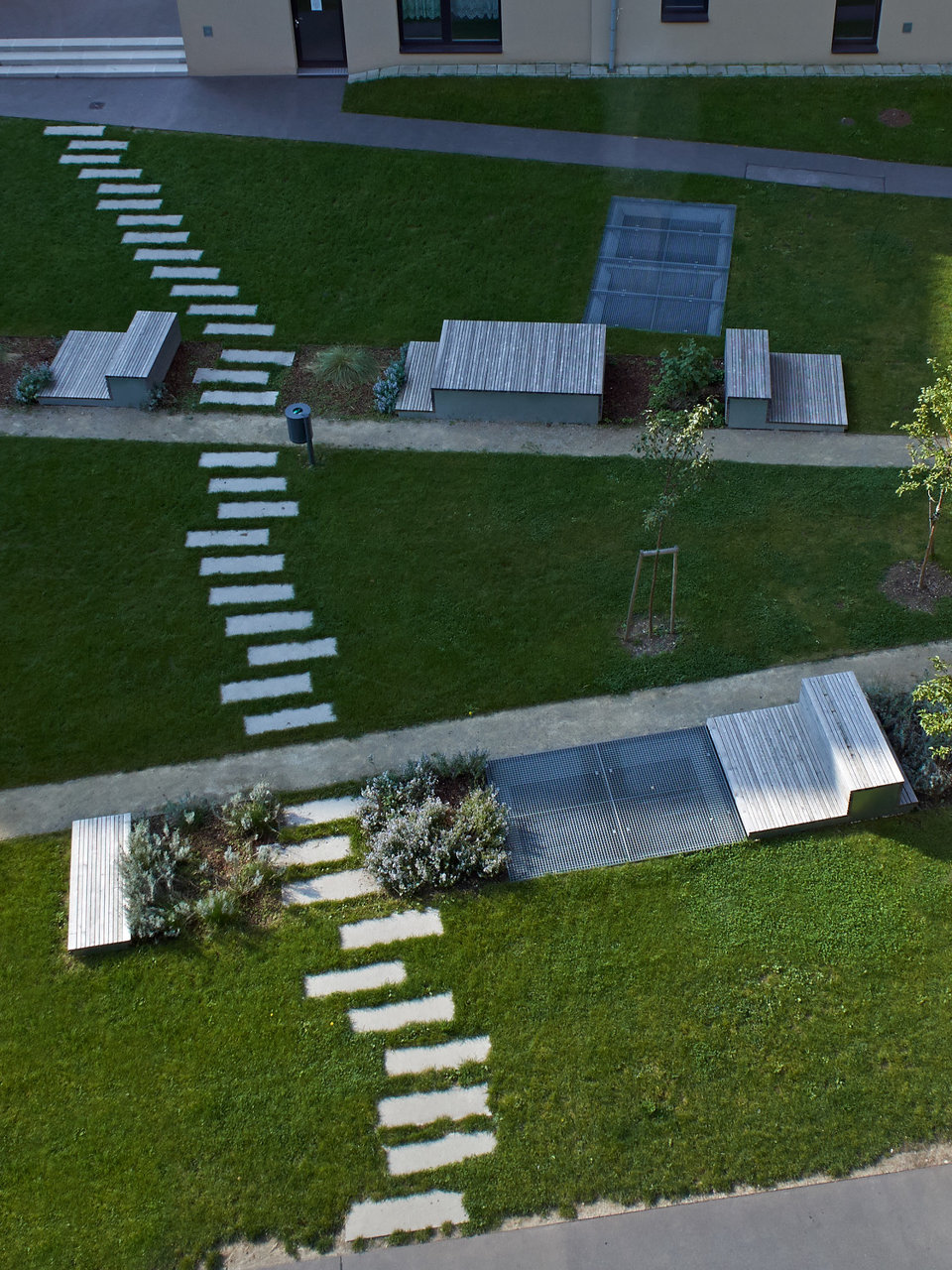Durch die Anordnung der Baukörper ergeben sich zwei großzügig dimensionierte Freiraumbereiche auf verschiedenen Niveaus. Der tiefer liegende Wohnhof ist den gemeinschaftlichen Aktivitäten gewidmet. Durch seine Konzeption und die Lage der Gemeinschaftsräume wird Kommunikation verstärkt und die Teilnahme am Leben im Hof unterstützt.