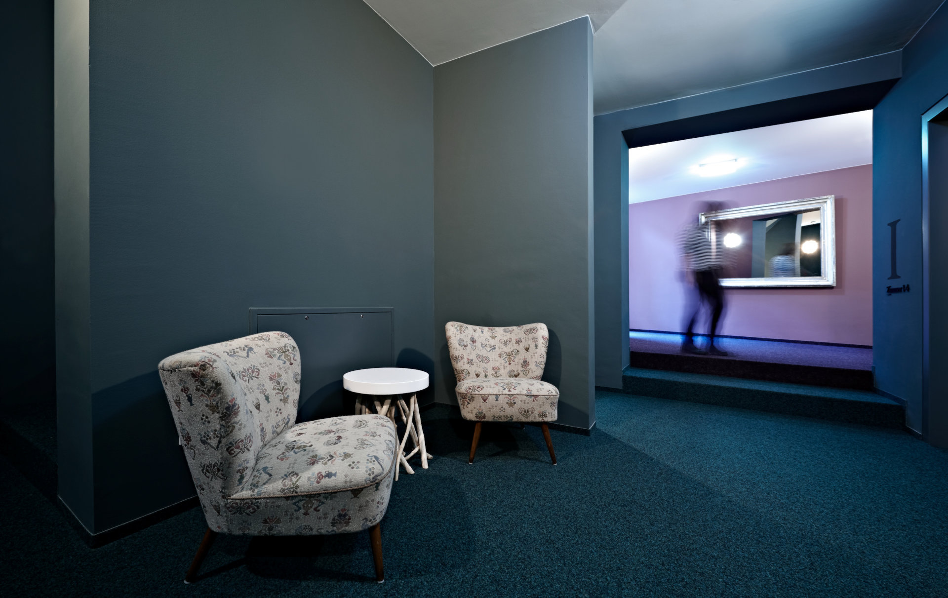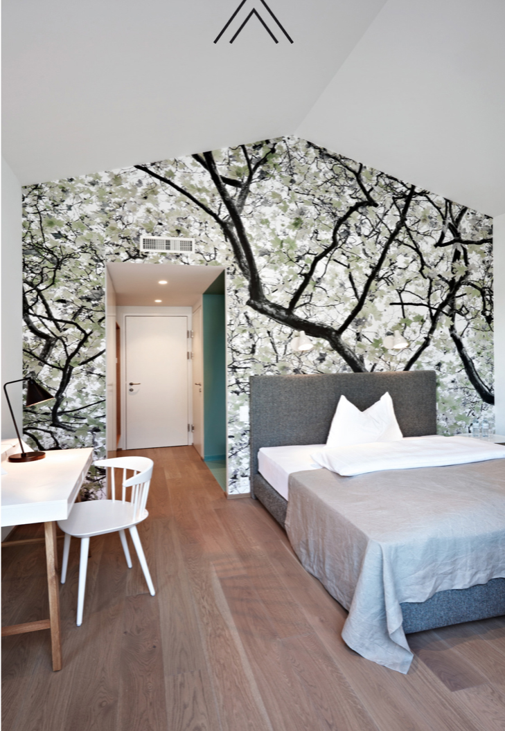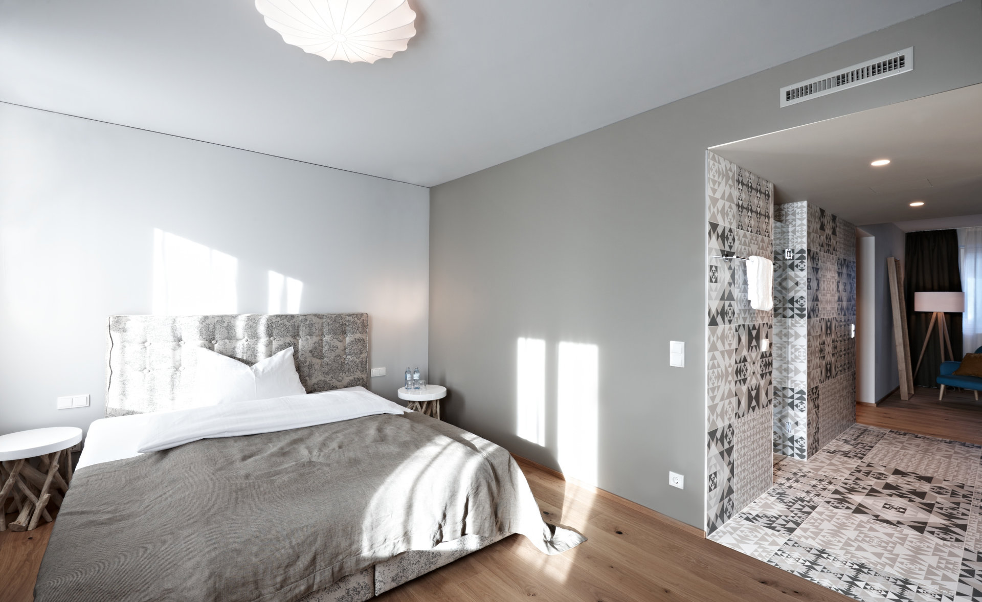 Der neue Baukörper im Hinterhof ist schmal und langgestreckt und entspricht der historischen Stadtstruktur. Die Zimmer bilden übereinandergestapelt „Häuser“ mit aneinandergereihten Satteldächern und Giebeln. Der Hofanbau fügt sich mit seiner Dachlandschaft in die historische Umgebung ein und interpretiert diese, durch den Einsatz von zeitgemäßen Materialien, neu.