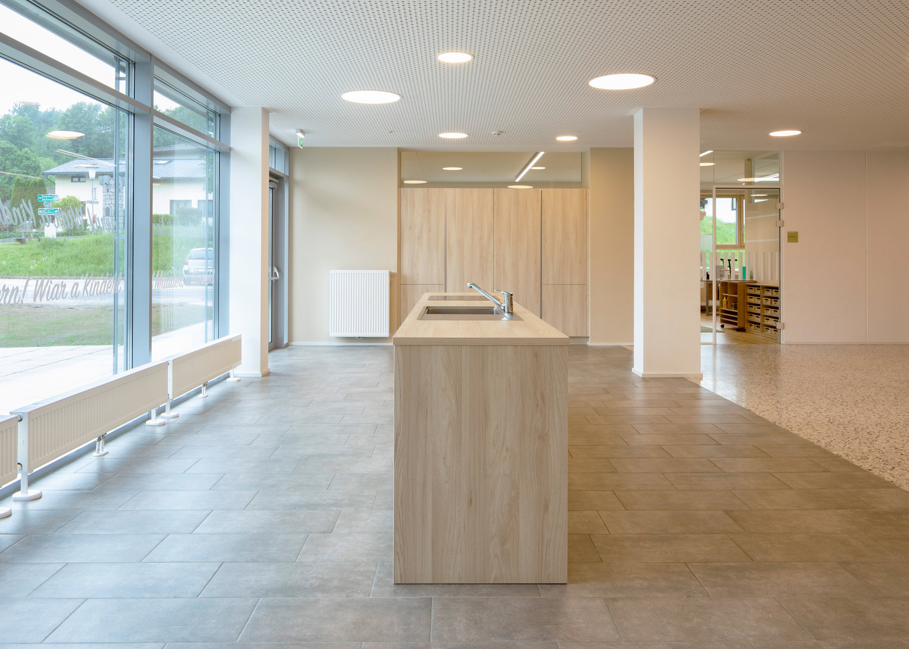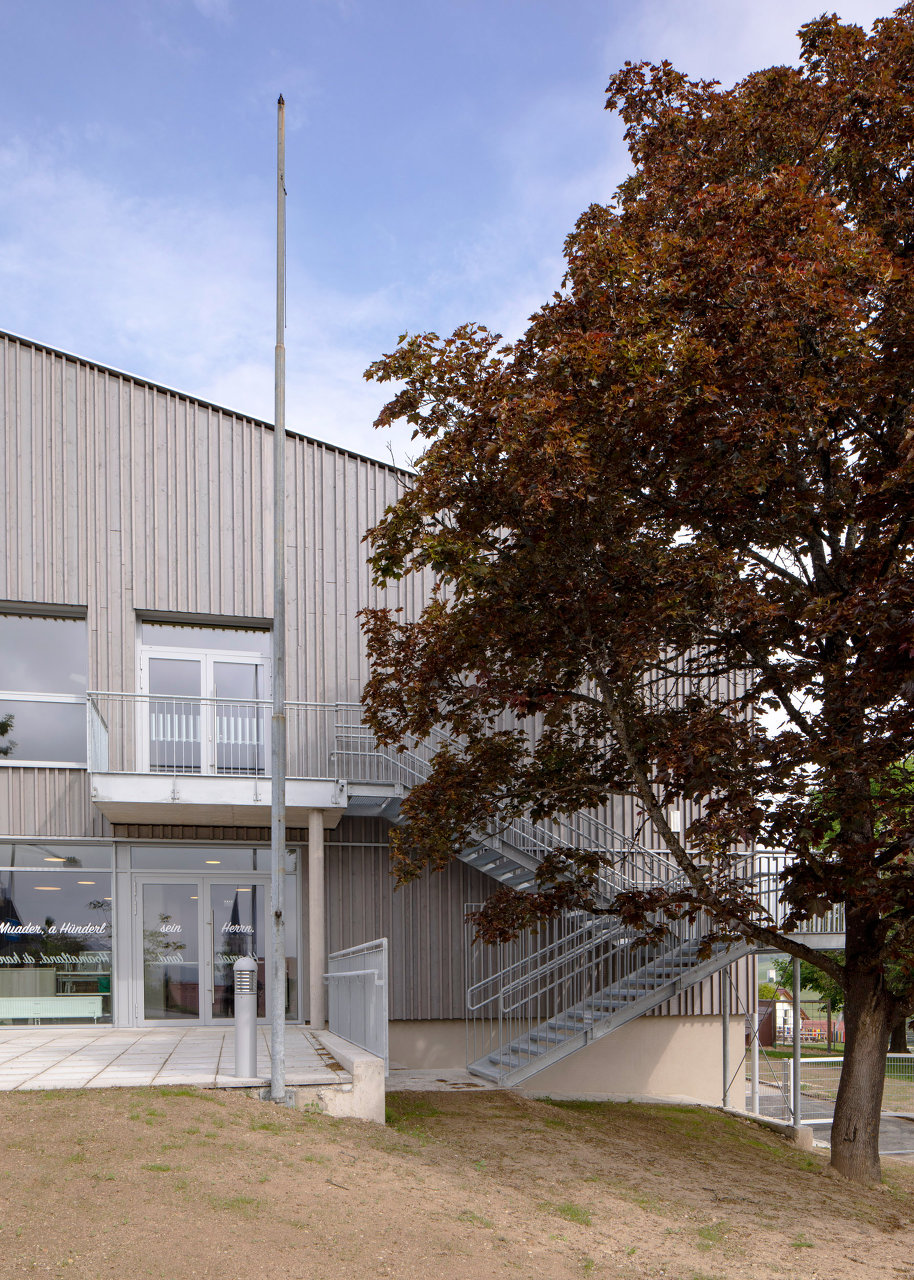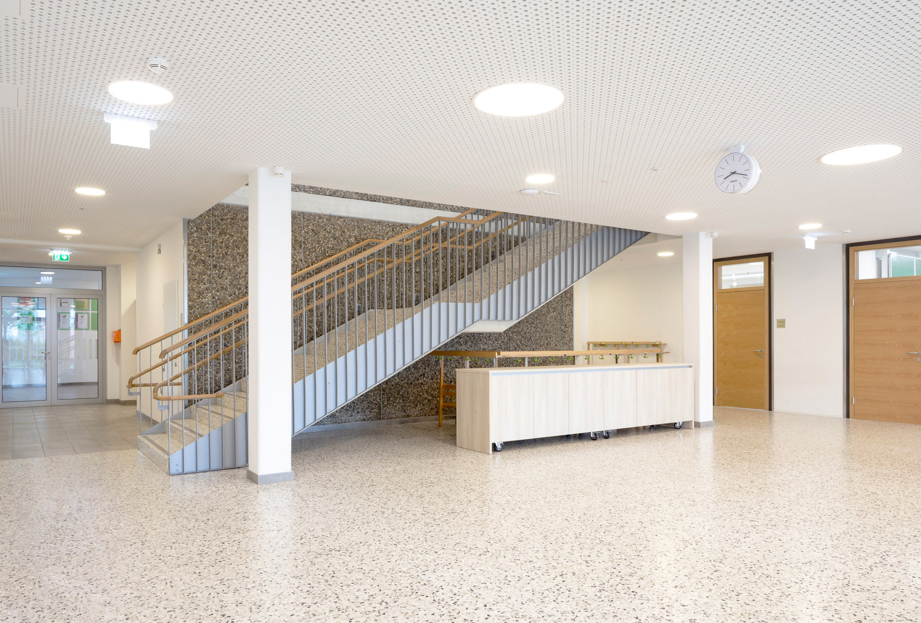 Längst platzte die in den 1970er-Jahren errichtete Volksschule aus allen Nähten, als 2016 die finanziellen Mitteln genehmigt wurden und mit den Planungen für die Umbaumaßnahmen begonnen werden konnte.Zu Beginn als reines Schulgebäude geplant, wurde die Volksschule in der Zwischenzeit mit den Funktionen von Hort, einer Kindergartengruppe und der Nachmittagsbetreuung „überlagert“ - und so stand die Zielvorgabe im Vordergrund, diese Funktionseinheiten neu anzudenken und funktional zu trennen.