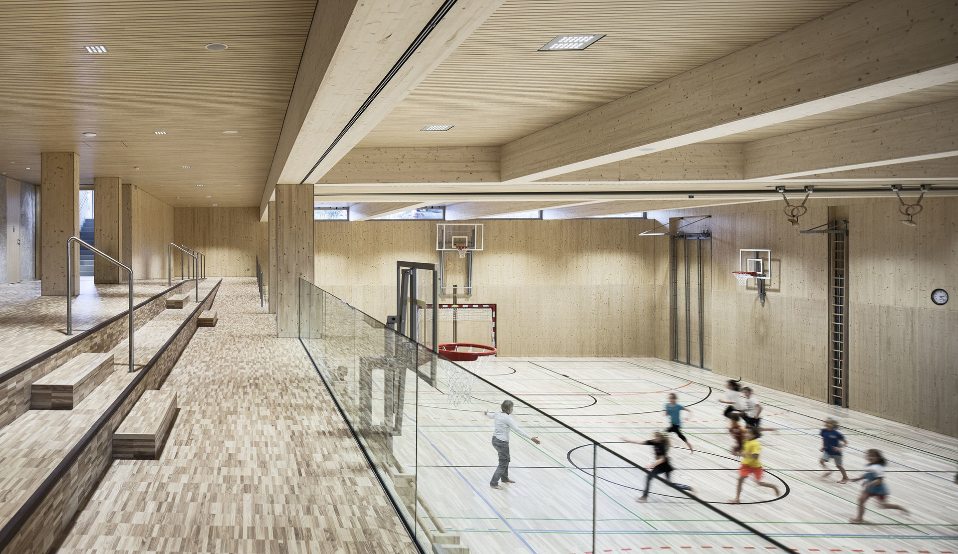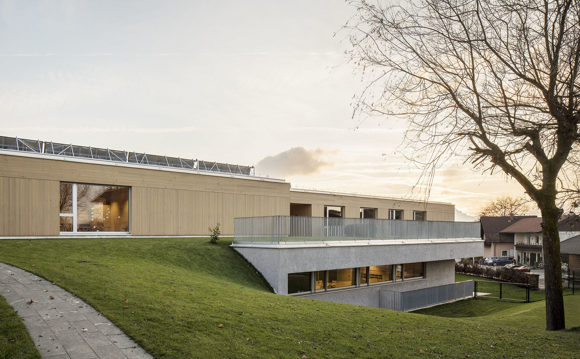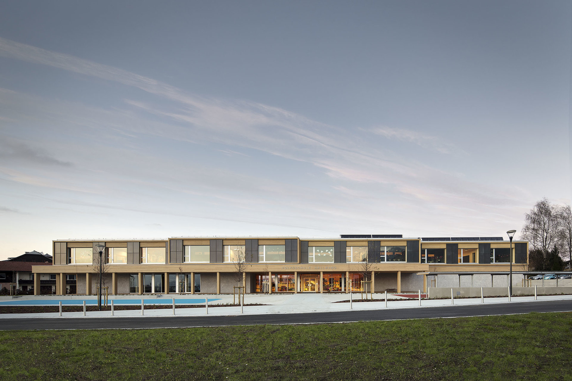 Der als Hyprid konzipierte Bau wird im Obergeschoss sowohl im Inneren als auch im Äußeren Erscheinungsbild vom Material Holz geprägt. (Text: Architekt)