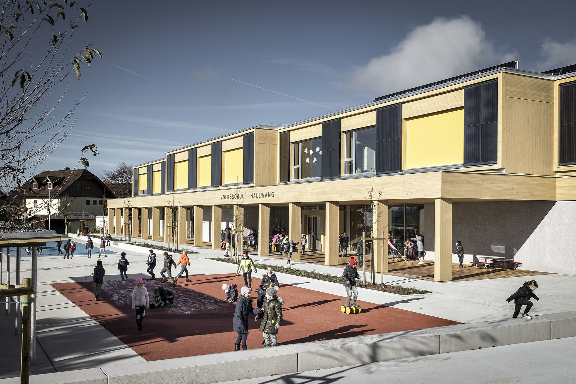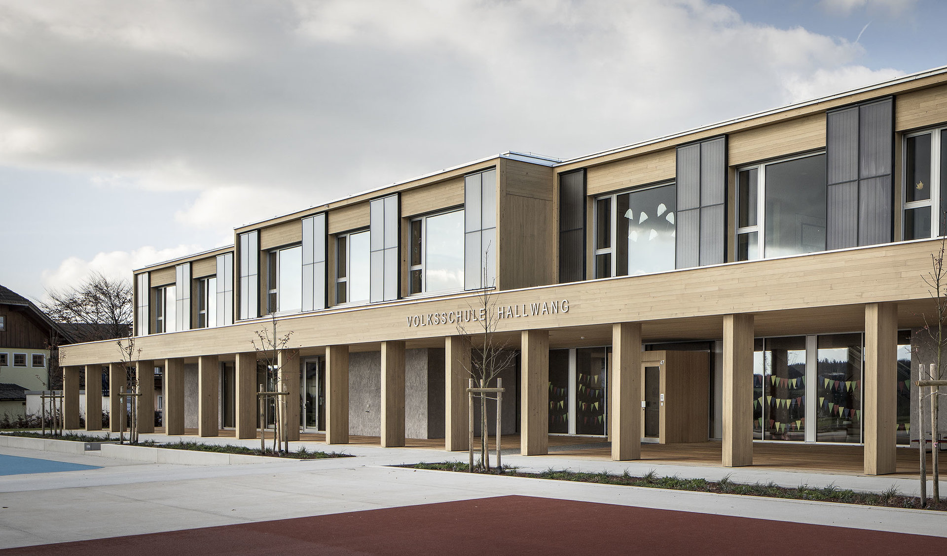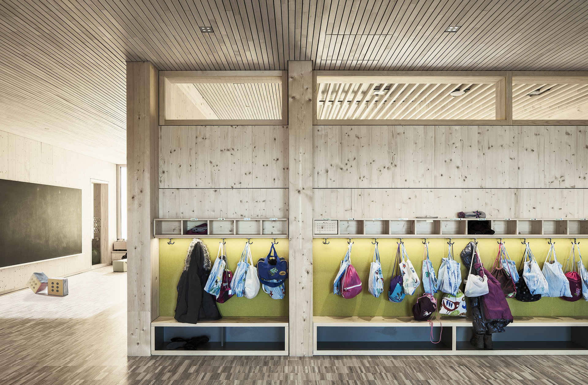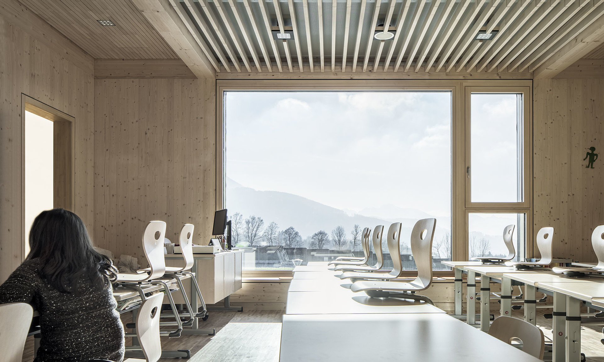 Der als Hyprid konzipierte Bau wird im Obergeschoss sowohl im Inneren als auch im Äußeren Erscheinungsbild vom Material Holz geprägt. (Text: Architekt)
