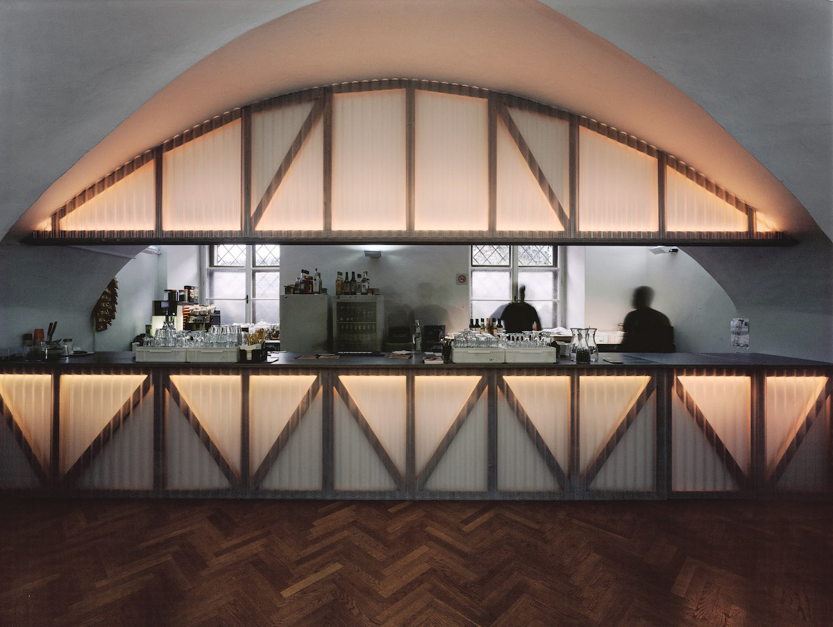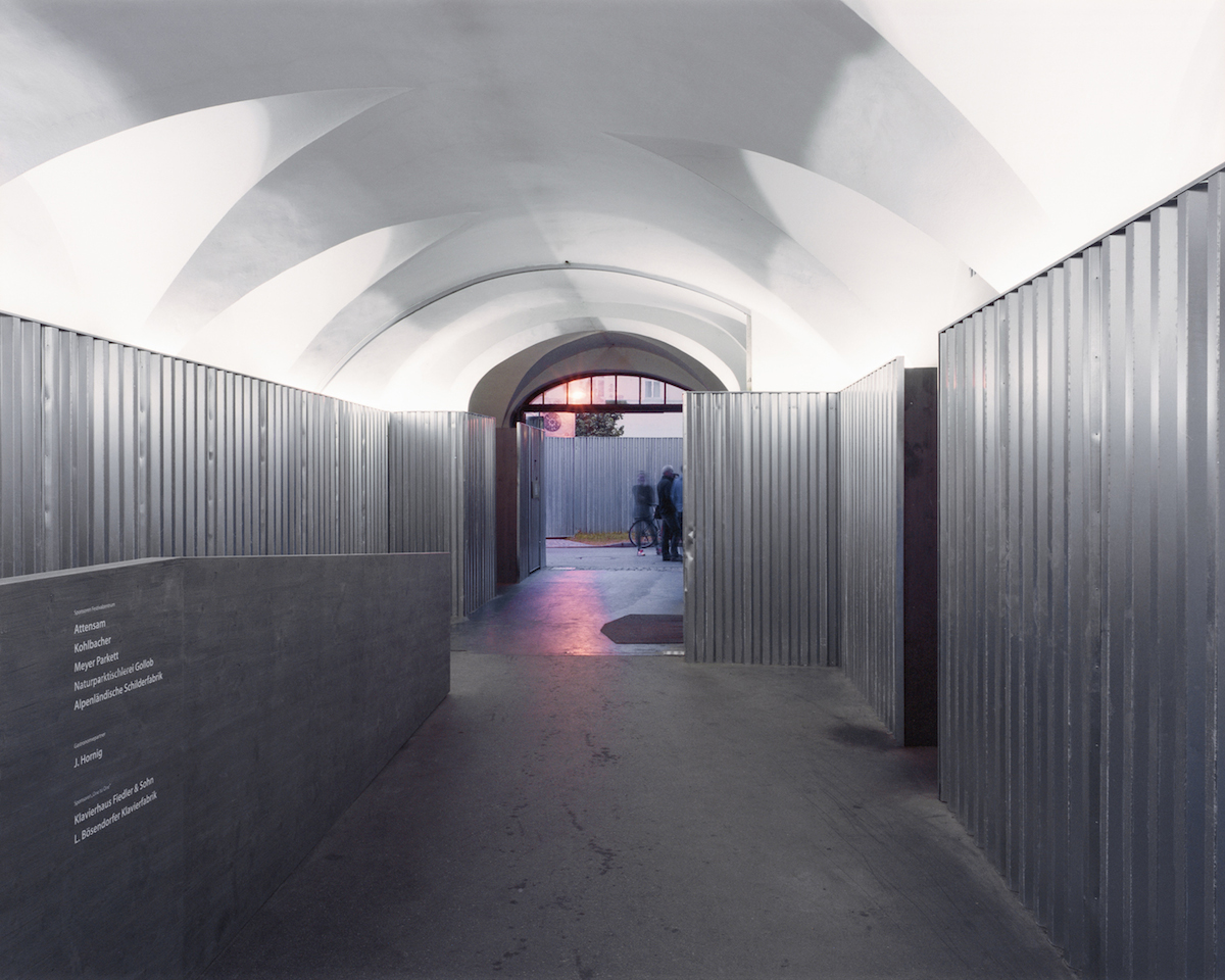 In einem Auswahlverfahren mit geladenen Teams wurde die Grazer Kooperation Supersterz + .tmp Architekten gewählt, um ihren Entwurf für das Festivalzentrum plus Bar umzusetzen. Auf die paradoxe Situation, ein Kunstfestival an einem kontroverser Ort zu implementieren und als Reaktion auf das universell wirksame Leitmotiv des steirischen herbst 2014 „I prefer not to... share“ antworteten sie mit einer gebauten Geste, zugleich architektonisches Element und Leitsystem in das Gebäude.
