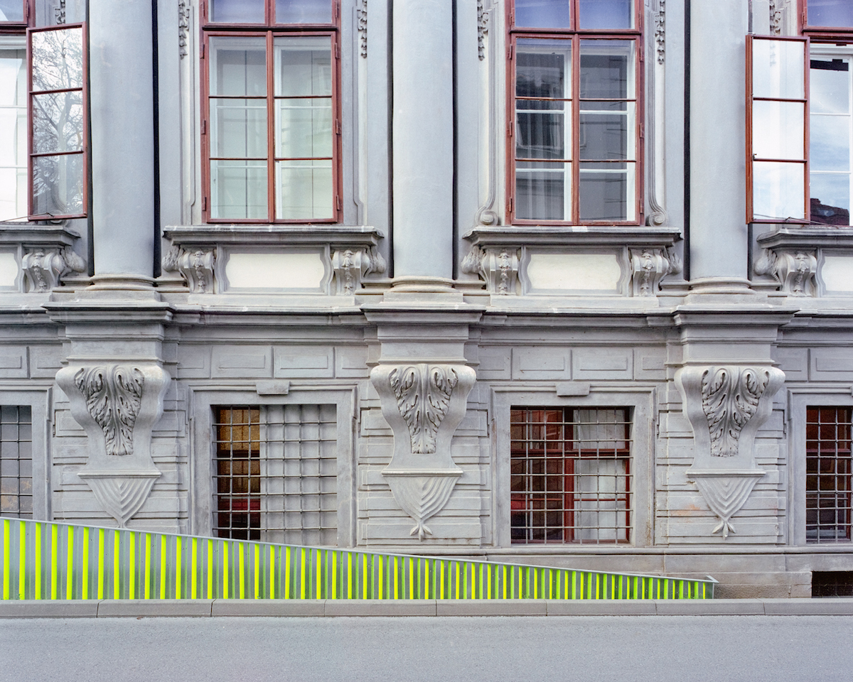 Schon an der Straßenfassade des barocken Palais Wildenstein zeichnet sich diese Geste des Festivalzentrums ab: Nähert man sich dem Eingang, wächst eine zweite Fassade, eine Kulisse aus Trapezblech, aus dem Boden und steigt bis zum Haupteingang an. Unterstützt wird diese leitende Wirkung durch gelb fluoreszierende Streifen am Trapezblech, die tagsüber Sonnenlicht und nachts die Streiflichter vorbeifahrender Autos reflektieren und die Kulisse zum Leuchten bringen.