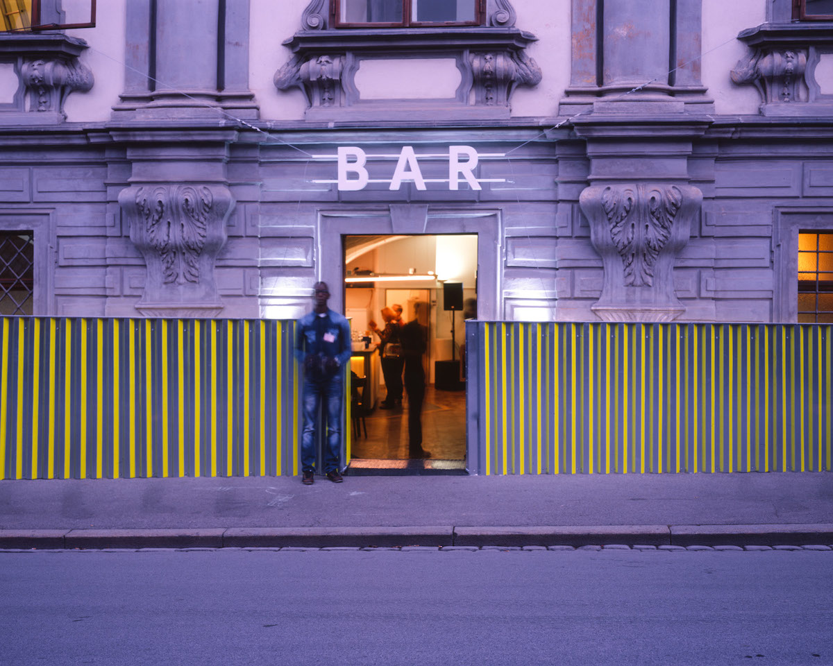 Ungeschönte Elemente und Materialien wie Container, Trapezblech, Wellplastik bilden im Backyard sowie in der Bar gemeinsam mit Fundstücken, auf die man sonst eher in Schuppen oder auf Lagerplätzen stößt, ein Kippbild zwischen Gestaltung und trashigem Readymade. An diesem zentralen Treffpunkt des steirischen herbst verschwimmen die Grenzen zwischen Besuchern und den Protagonisten der lokalen Vereine Druckzeug und Fahrradküche, die ihre eigenen Werkstätten für die Dauer des Festivals in den Hinterhof des Festivalzentrums verlegt haben. Das entstehende Treiben in diesem Werkstattparadies macht schließlich alle gleichermaßen zu Akteuren und Konsumenten.