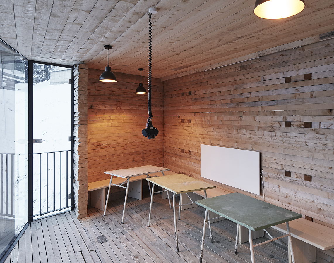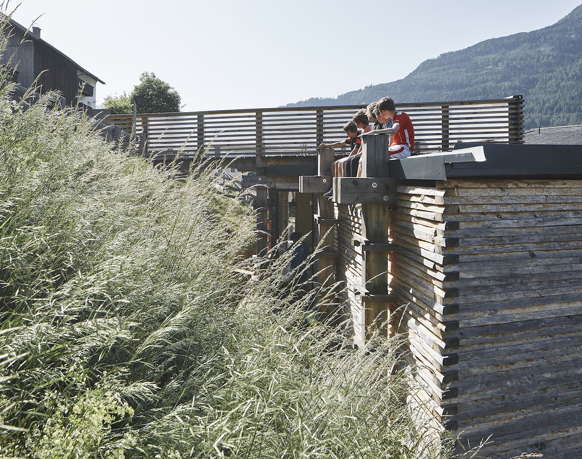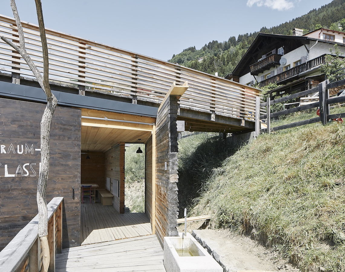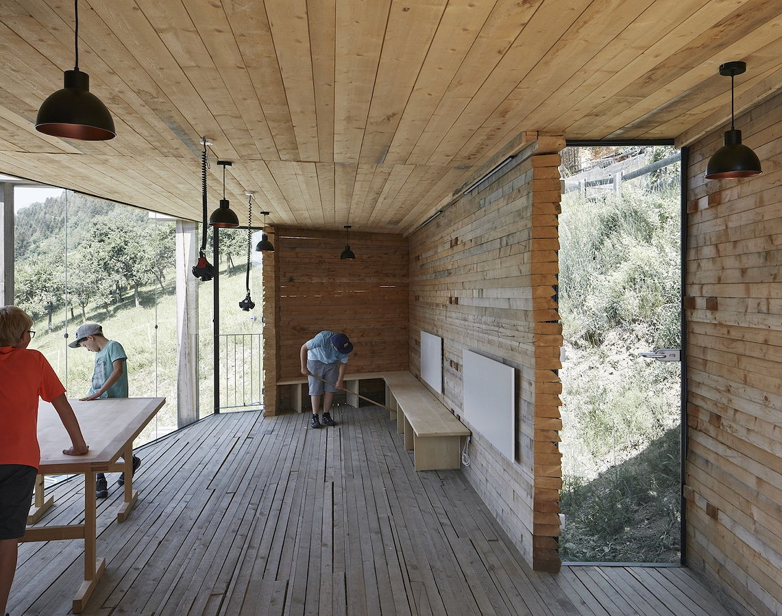 Die Freiraumklasse oberhalb der Schule besteht aus einem einfachen Baukörper und einem schönen Raum ganz in Holz, der mit einem Steg und einer Terrasse an den Hang angedockt ist. Man kann sich gut vorstellen, wie viel Vermittlungsarbeit, Diskussionen, Lernen und Probieren nötig waren, um zu diesem Ergebnis zu kommen. Die verwendete Holzbauweise mit ihren einfachen, für das Projekt ideal eingesetzten Details zeugen vom hohen Qualitätsbewusstsein und Können der Betreuer:innen wie der Schüler:innen.