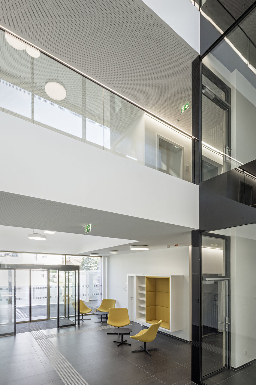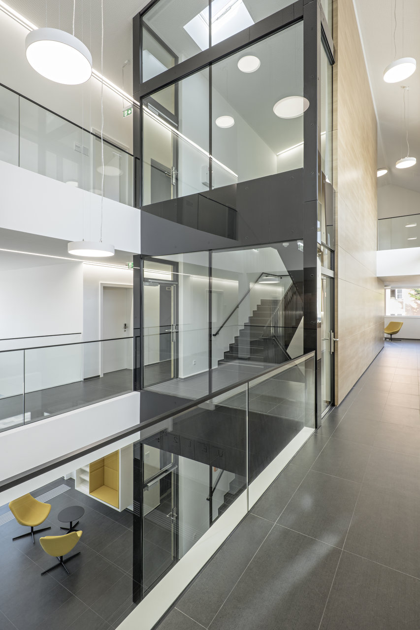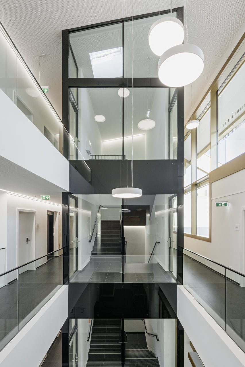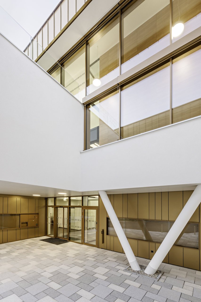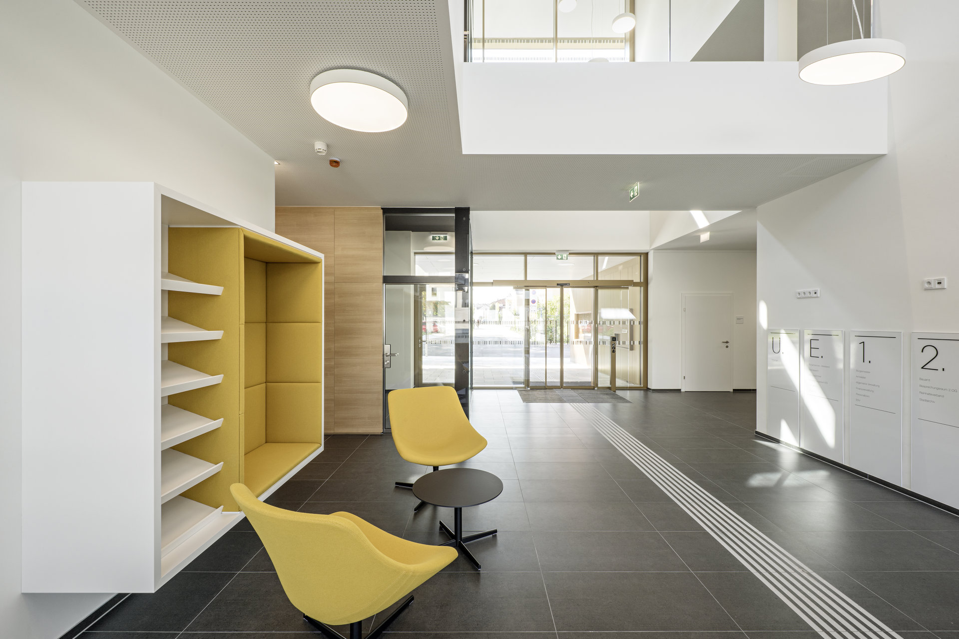 Der an der Südseite ausgebildete Vorplatz ist als Begegnungszone konzipiert und bildet mit dem rückspringenden Erdgeschoß dabei eine klar ablesbare und witterungsgeschützte Eingangssituation aus. Das durchgesteckte Foyer schafft einen fließenden Übergang zum rückseitigen Grünraum. Es bildet das geschoßübergreifende kommunikative Zentrum des Gebäudes und schafft mit seiner Abfolge von Atrium und Lufträumen hohe innenräumliche Qualitäten und eine abwechslungsreiche Abfolge von Ein-, Aus- und Durchblicken. Dabei wird neben einer einladenden Atmosphäre ein hohes Maß an Übersicht und leichter Orientierung für alle Nutzer ermöglicht.