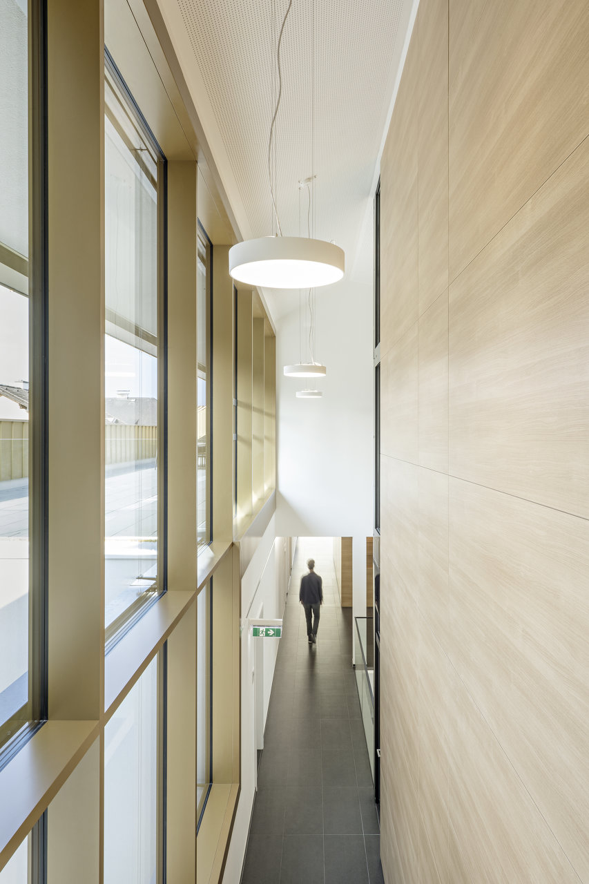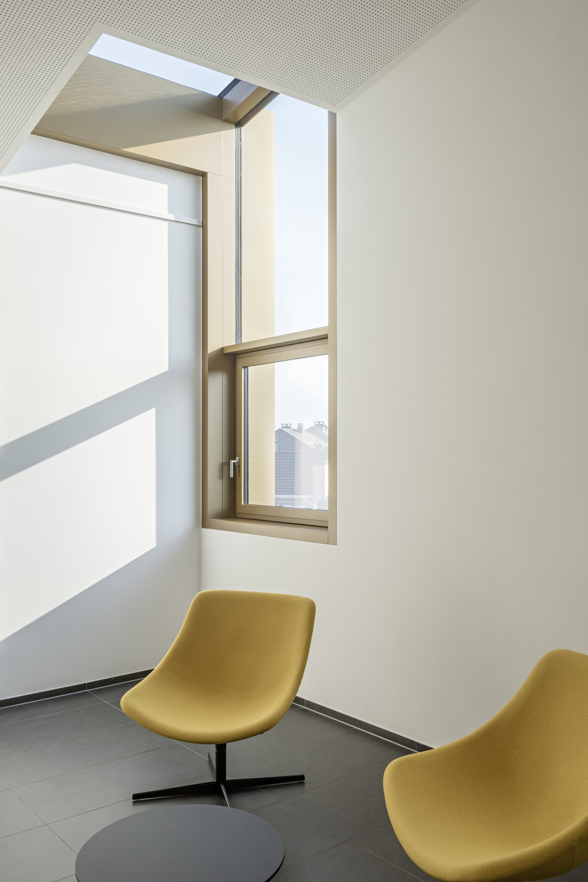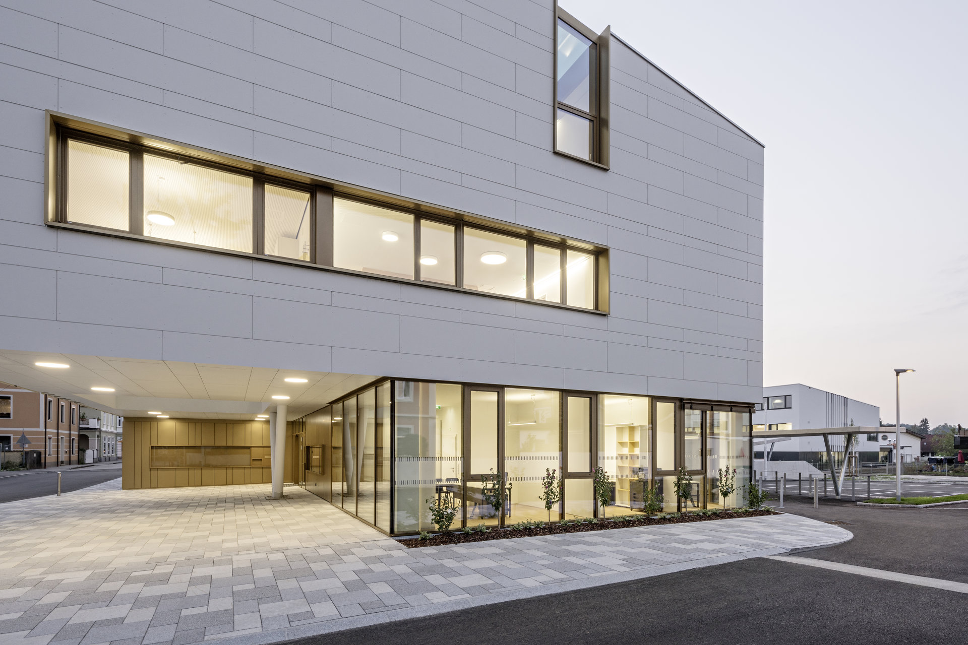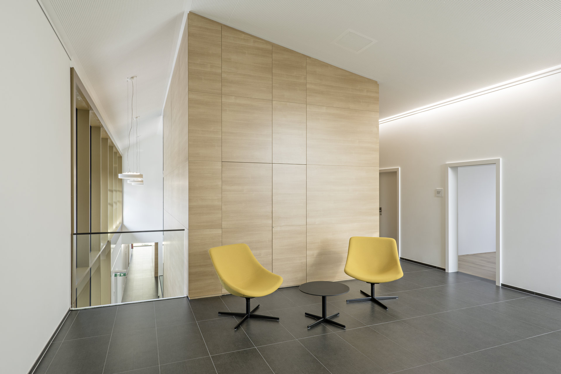 Der an der Südseite ausgebildete Vorplatz ist als Begegnungszone konzipiert und bildet mit dem rückspringenden Erdgeschoß dabei eine klar ablesbare und witterungsgeschützte Eingangssituation aus. Das durchgesteckte Foyer schafft einen fließenden Übergang zum rückseitigen Grünraum. Es bildet das geschoßübergreifende kommunikative Zentrum des Gebäudes und schafft mit seiner Abfolge von Atrium und Lufträumen hohe innenräumliche Qualitäten und eine abwechslungsreiche Abfolge von Ein-, Aus- und Durchblicken. Dabei wird neben einer einladenden Atmosphäre ein hohes Maß an Übersicht und leichter Orientierung für alle Nutzer ermöglicht.