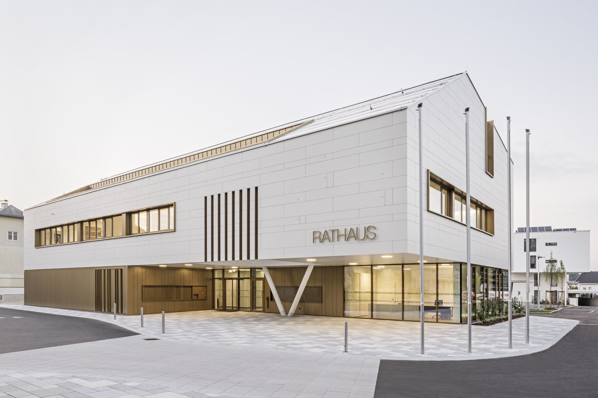 In Hinblick auf Energieeffizienz und Nachhaltigkeit erfüllt das Rathaus höchste Ansprüche. Der Energiebedarf wird mittels Grundwasserwärmepumpe, Photovoltaik- sowie Solarthermieanlage gedeckt, die im zeitgleich errichteten neuen BORG Oberndorf installiert sind und auch das Rathaus im Sinne eines Smart-City Gedankens im Nahwärmeverbund versorgen. (Text: Architekt)