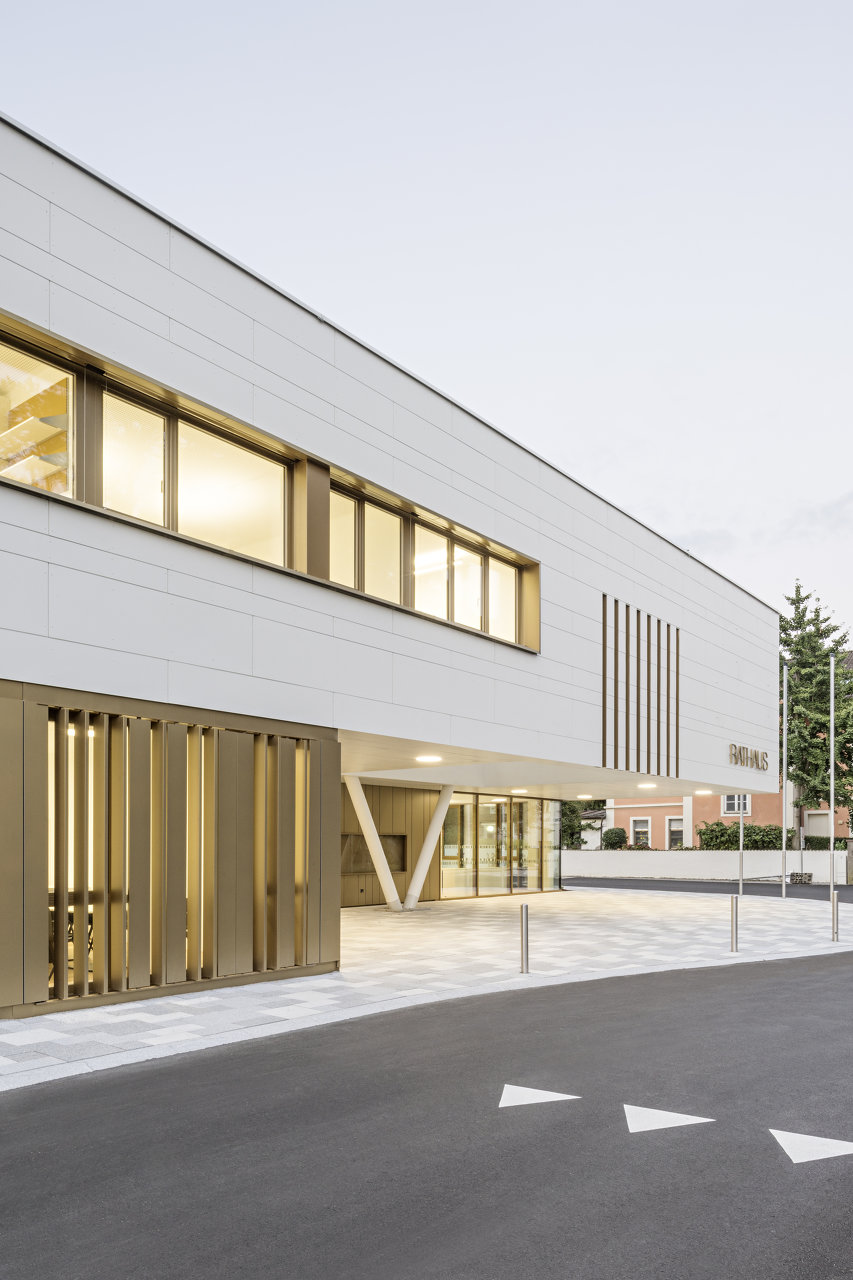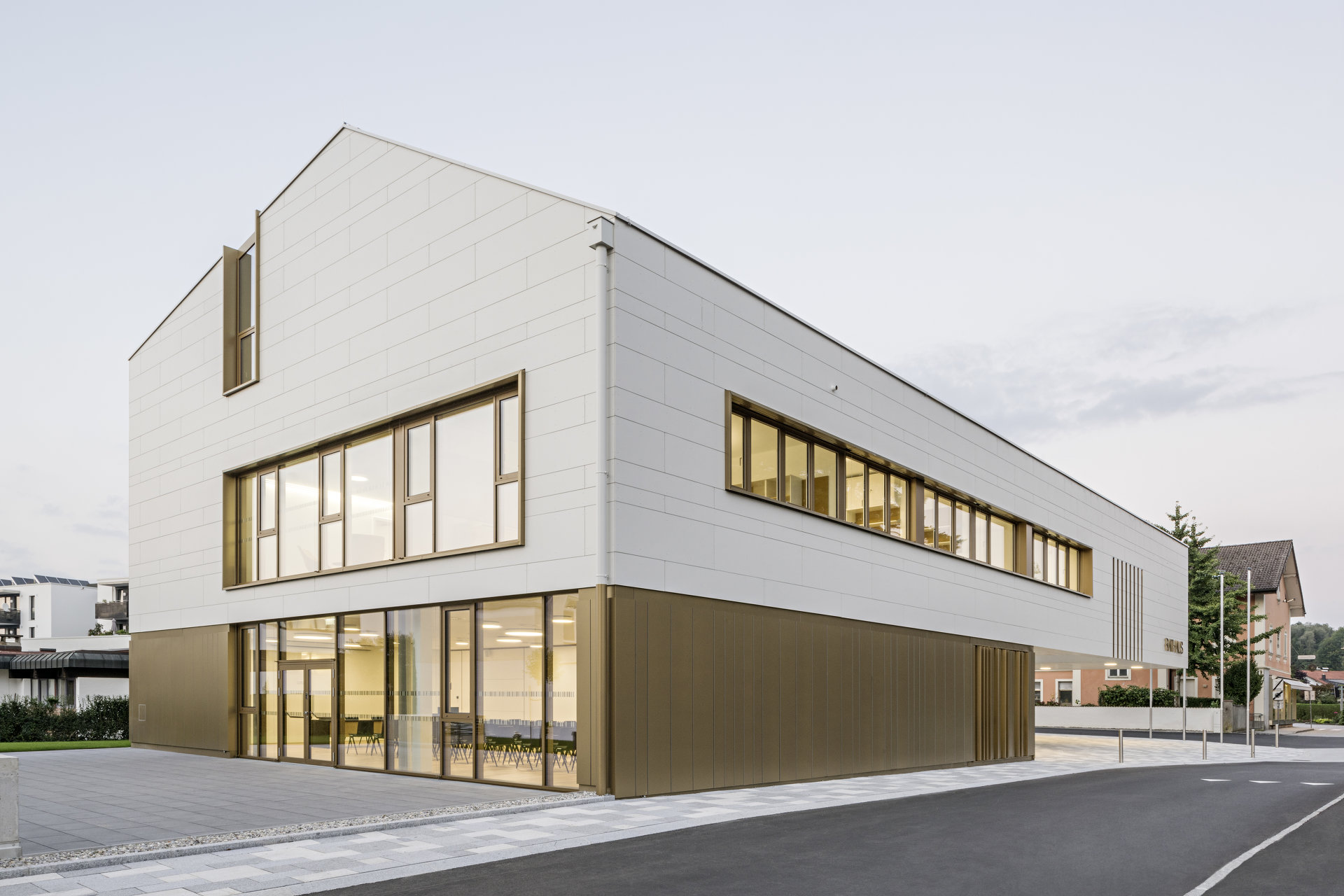 Der dreigeschoßige Baukörper reagiert behutsam auf das homogene Ortsbild. Dabei werden über die maßstäbliche Dimensionierung und die gewählte Dachform die ortstypischen Merkmale gezielt aufgenommen und über die klare und markante Geometrie des Gebäudes ein bewusster Kontrast zum umgebenden Freiraum geschaffen.