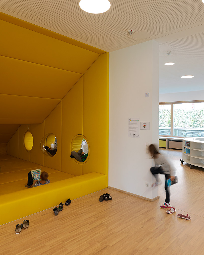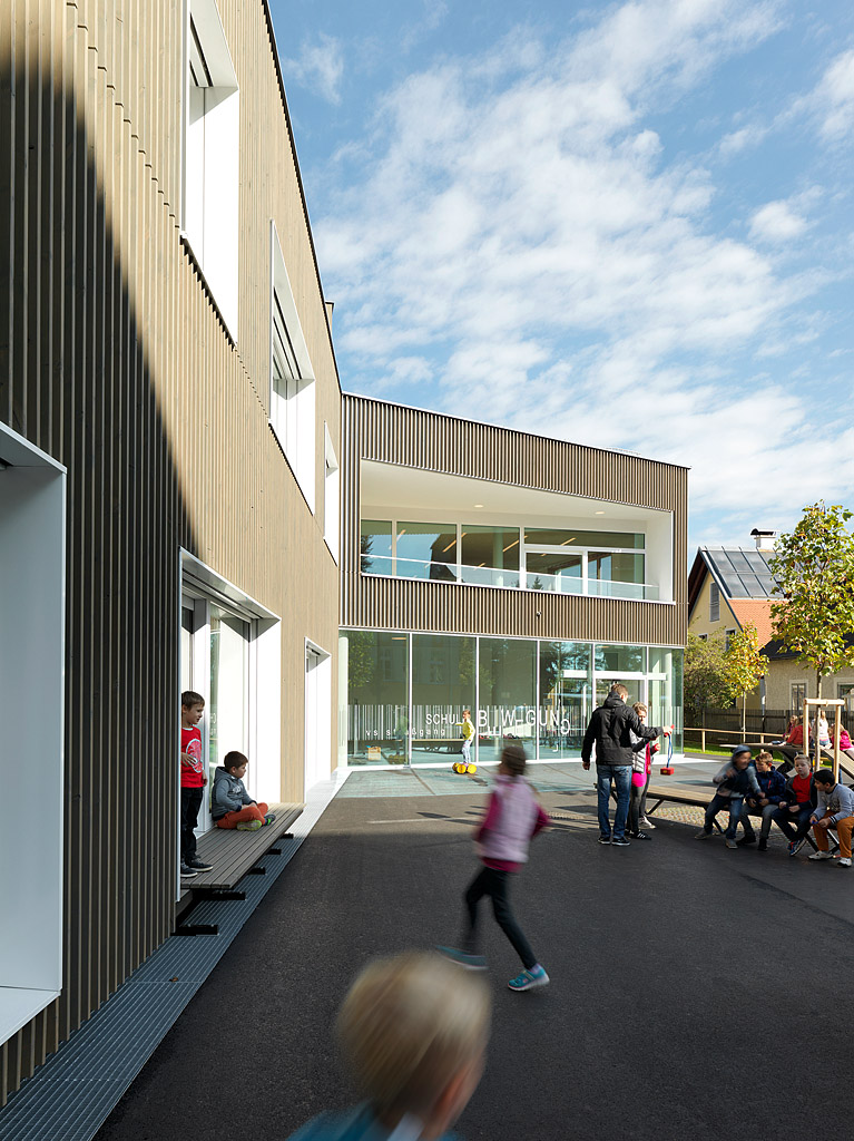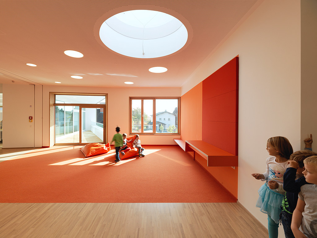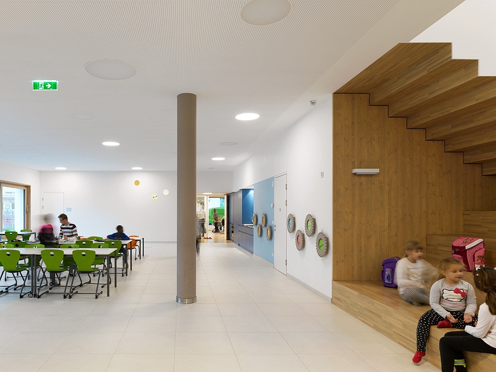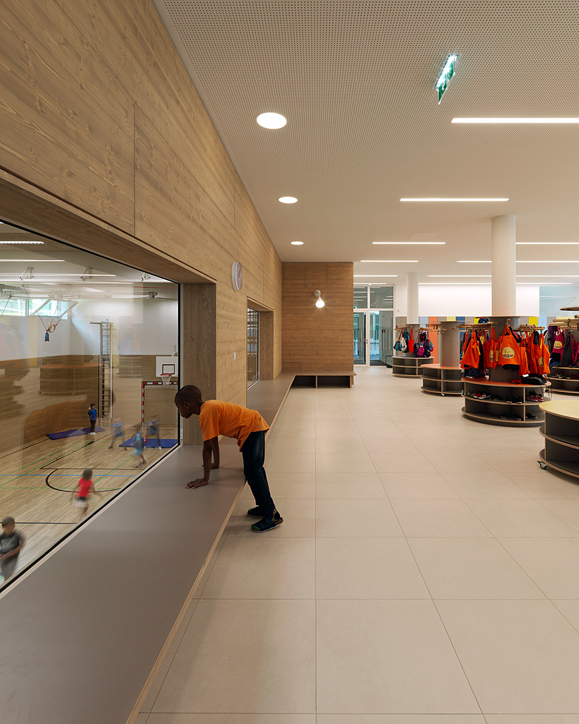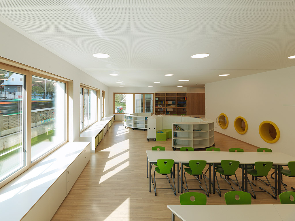 Die Freizeiträume liegen ebenerdig im südlichen Teil mit Orientierung zum Schulhof und direkter Anbindung an den Speisesaal. (Text: Architektinnen)