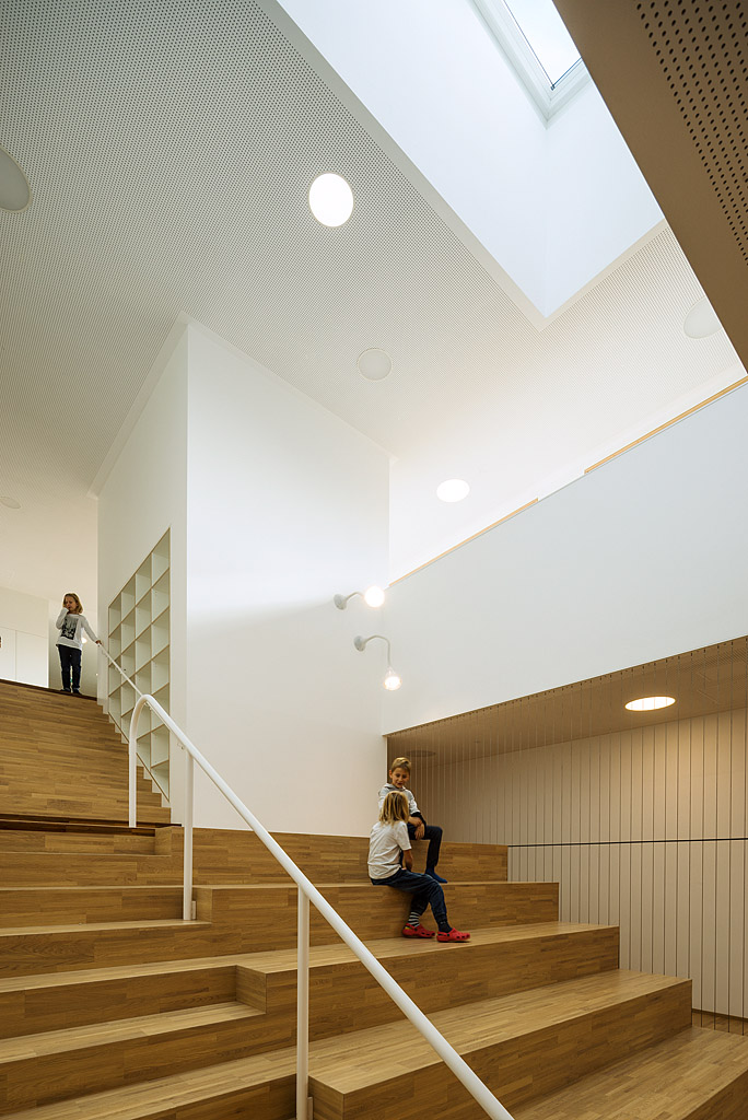 In zentraler Lage befinden sich Sitzstufen zum Verweilen und Präsentieren, Bibliothek und Medienraum sowie der Bereich der Pädagog:innen.