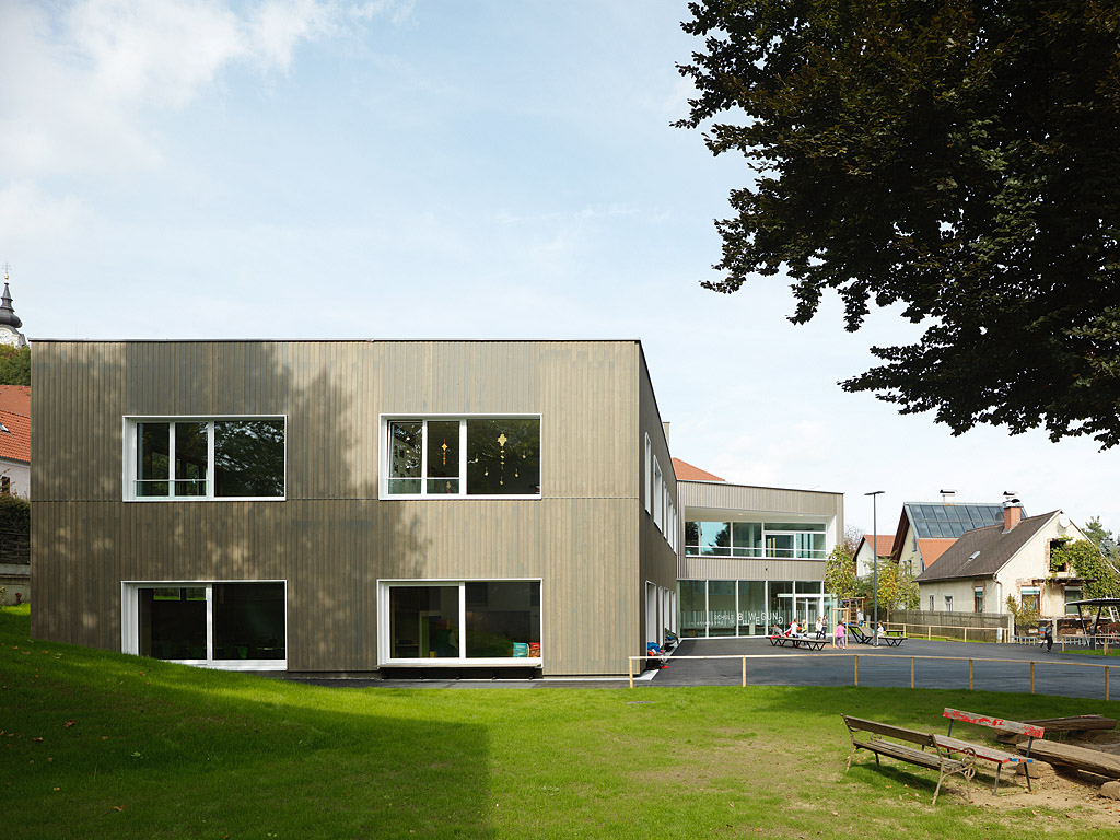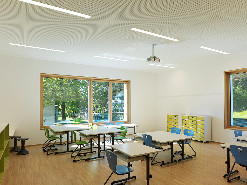 Innenräumlich liegt dem Entwurfsgedanken ein Ermöglichen des pädagogischen Konzeptes „bewegte Schule“ zugrunde. Entlang der Bewegungsachsen in horizontaler sowie vertikaler Richtung werden in rhythmischer Abfolge Kommunikationsachsen und Lernbereiche mit unterschiedlichen Qualitäten angeboten. Marktplätze und Gruppenräume sind so situiert, dass die Klassendichte gelockert wird und neue sowie bestehende Klassen zu Clustern verbunden werden können.