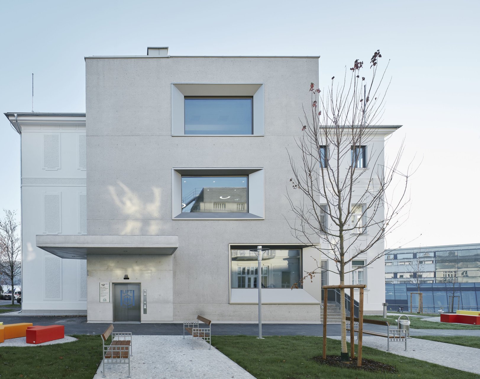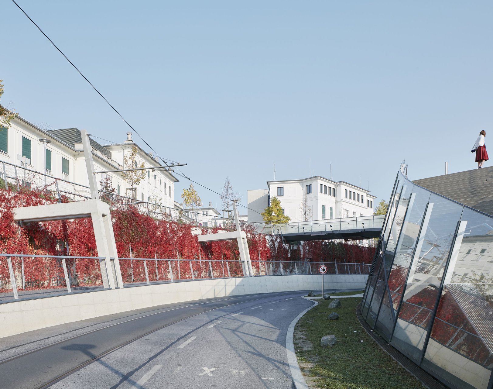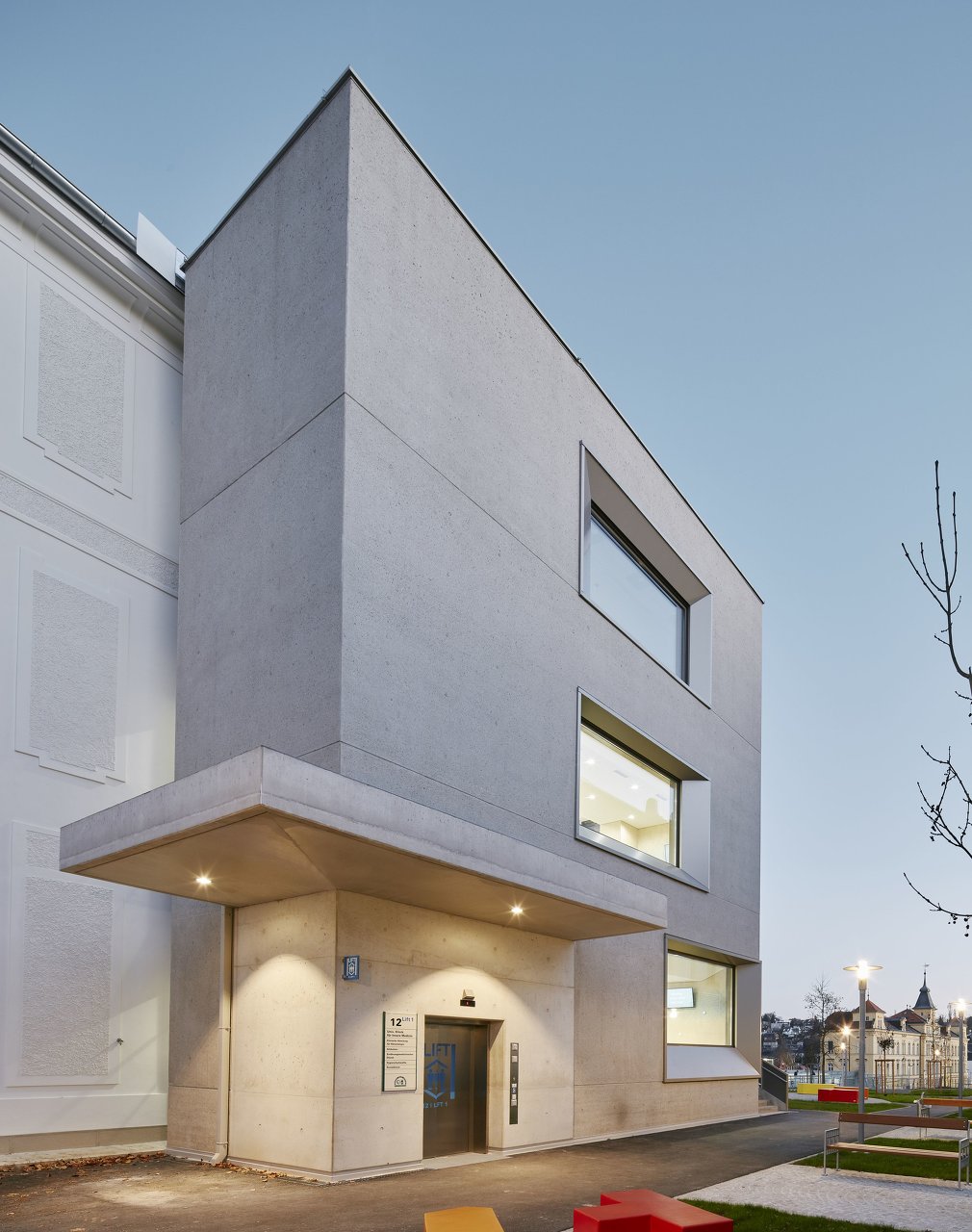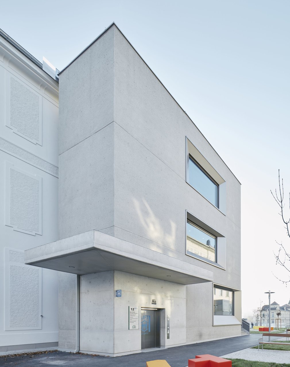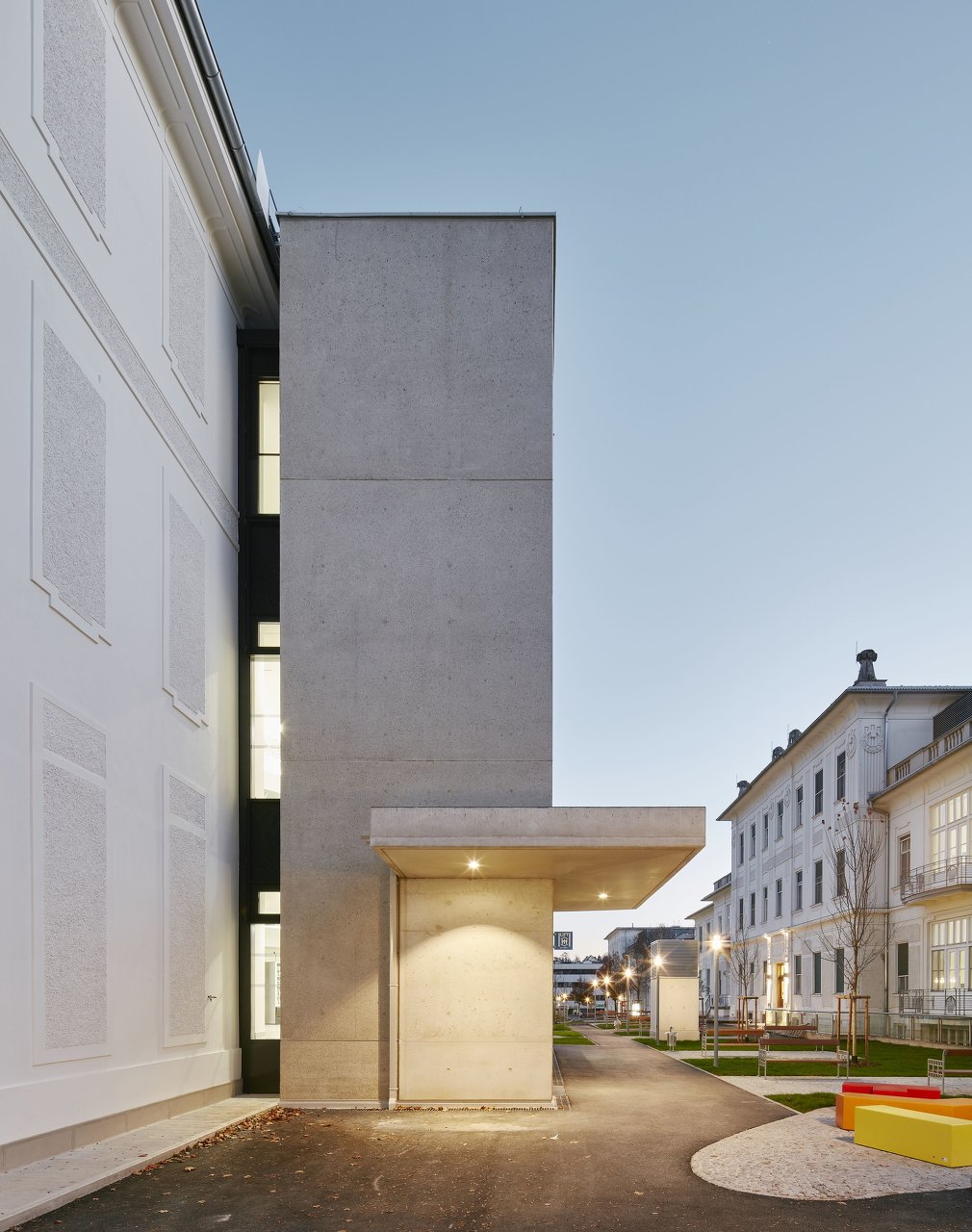 Der Haupteingang soll wie bisher von Südosten erfolgen. Um das Gebäude barrierefrei erreichen zu können, wurde ein neuer Erschließungszubau mit Bettenlift über alle Geschosse (UG – 2.OG) an der Westfassade in der Achse des Stiegenhauses errichtet. Der Zubau schafft eine Balance zwischen den bislang unausgewogenen Bauvolumen. Er ist als massiver Baukörper mit seitlichen Zäsuren in Glas zum historischen Bestand formuliert und ermöglicht die Freistellung des bestehenden Erschließungskerns, wodurch nicht nur großzügige Bewegungsbereiche und Wartezonen ermöglicht wurden, sondern auch die Orientierung im Gebäude verbessert wurde. Eine Außentreppe verbindet ihn mit dem Garten.