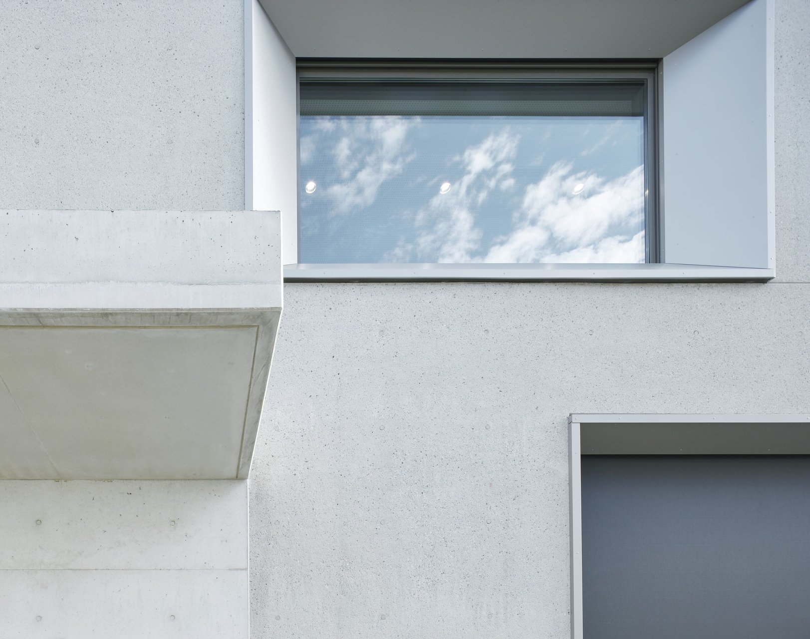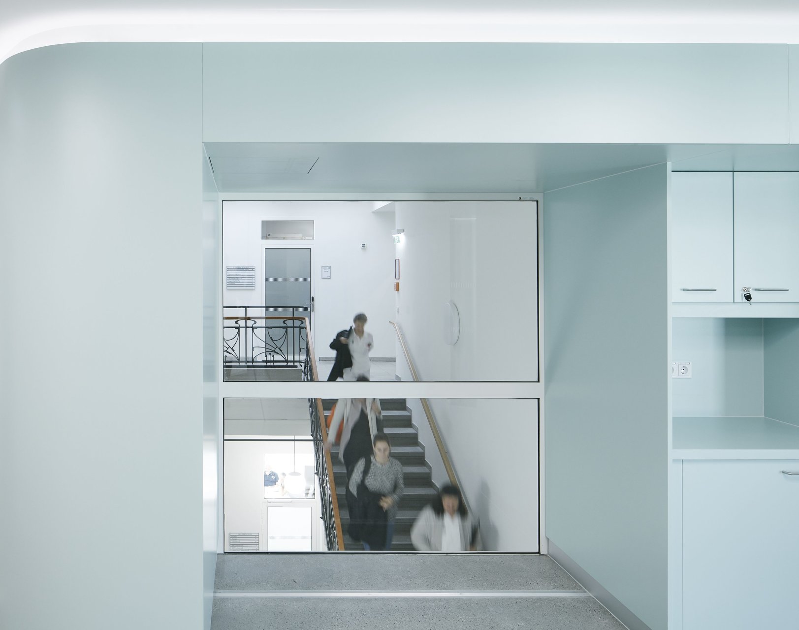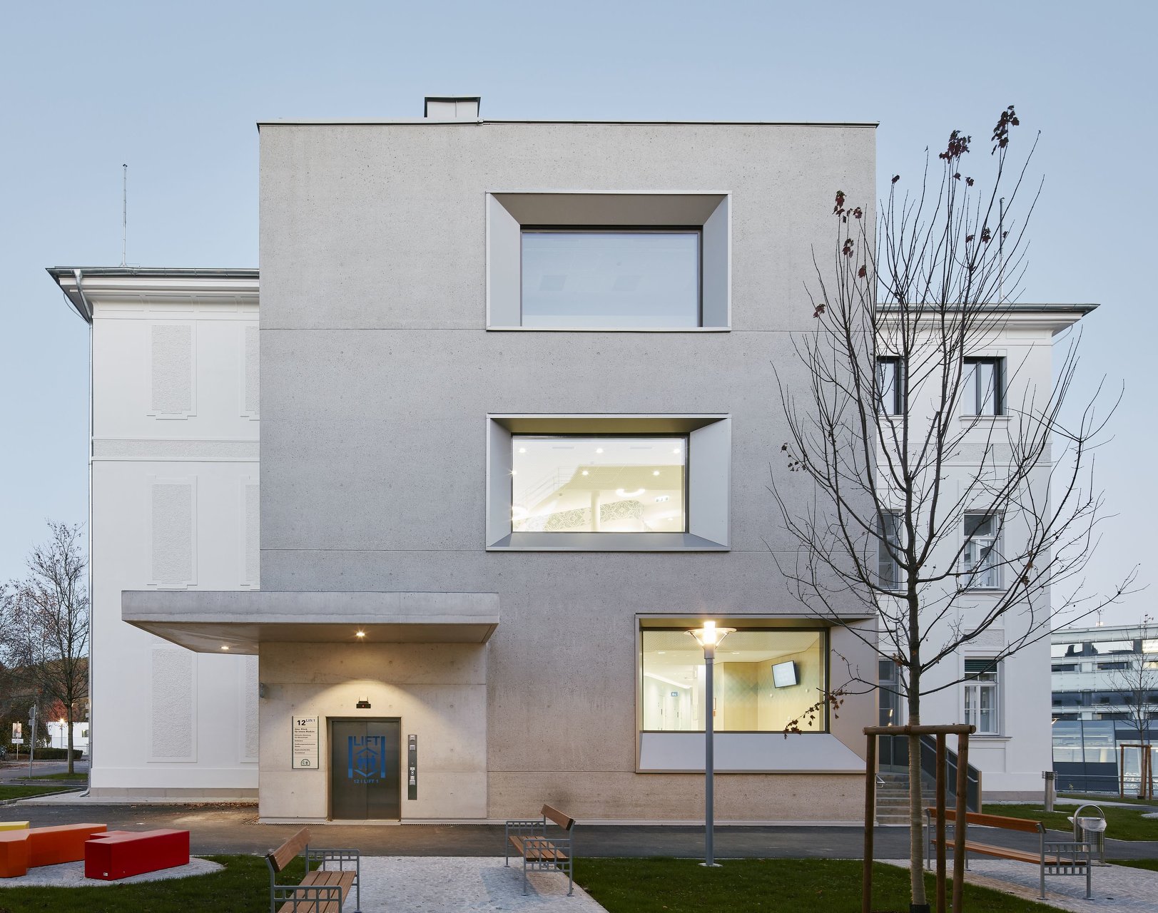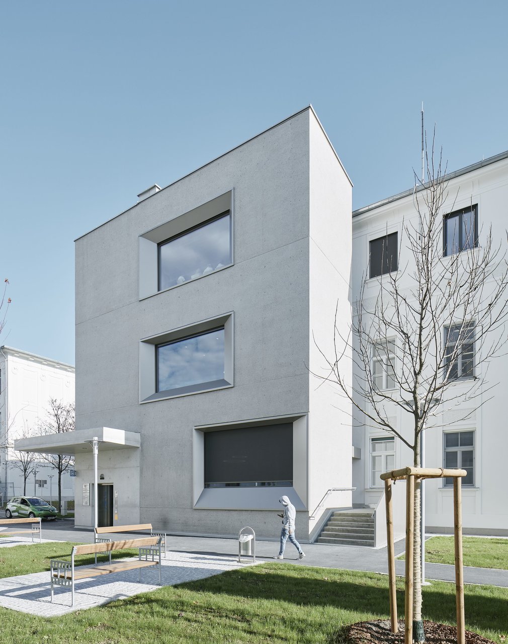 Die unterschiedlichen geschossweisen Nutzungsanforderungen wie der allgemeine Wartebereich im Erdgeschoß, im 1. Obergeschoß die Wartezone mit Schwerpunkt Knochenmarkstransplantation und im 2. Obergeschoß der Konferenzraum definieren die unterschiedlichen Fenstergrößen und Leibungswinkel des Zubaus und bilden sich an der Fassade des Zubaus ab. (Text: Architekt:innen)
