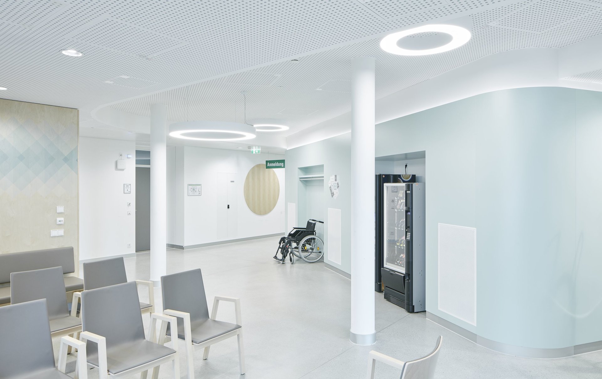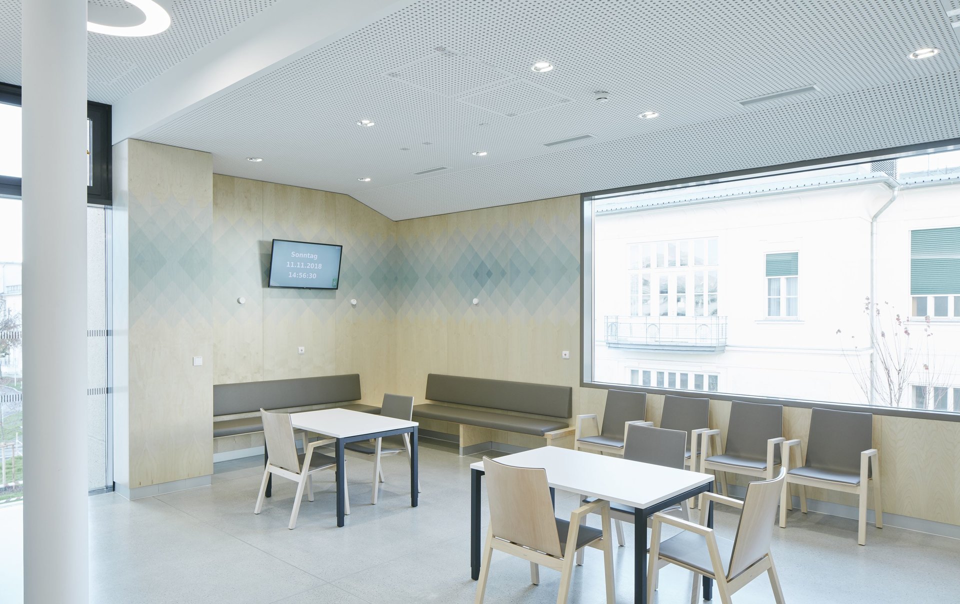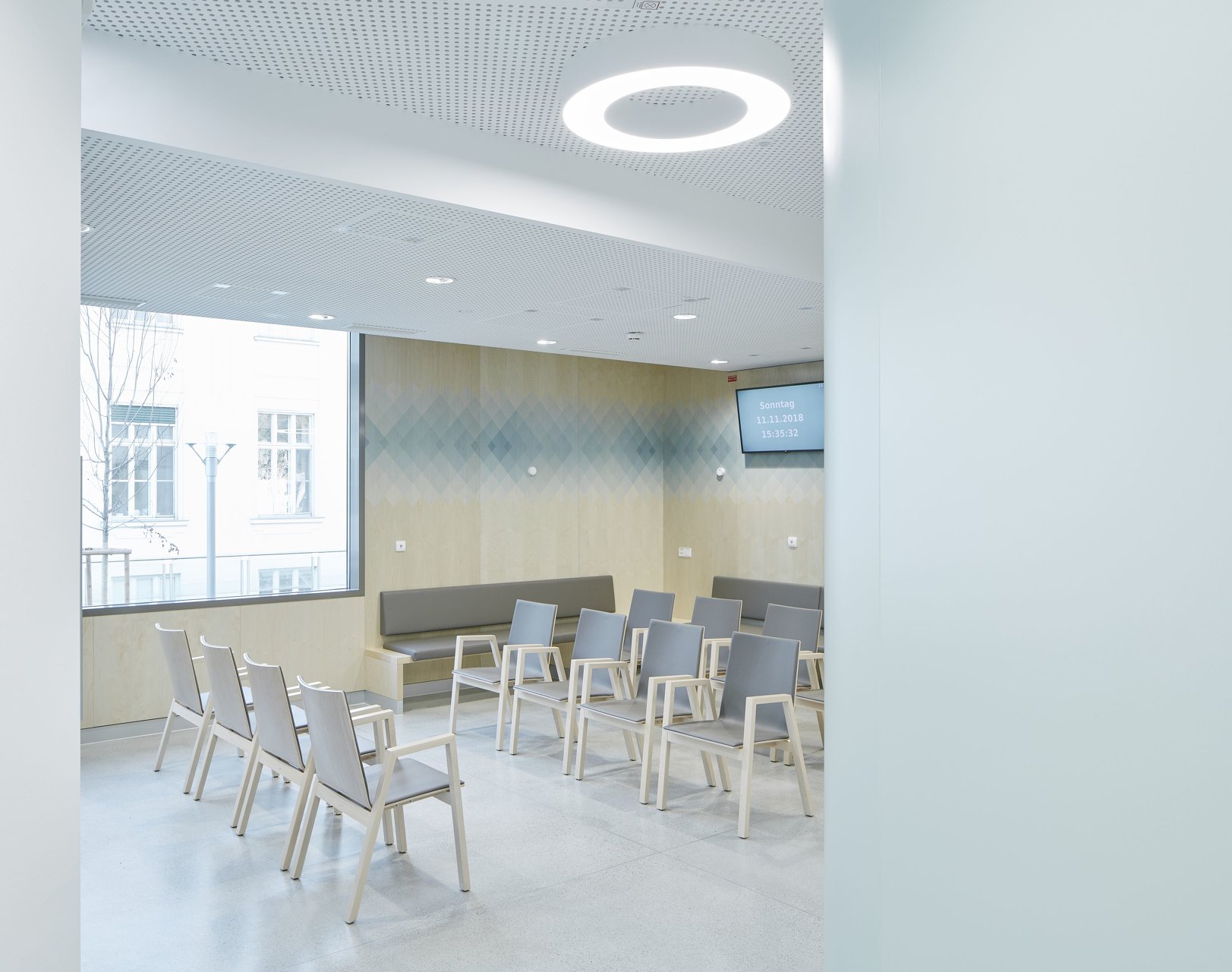 Die neue Ambulanz der Hämatologie ist im Erdgeschoß und ersten Obergeschoß angesiedelt. Beide Geschoße wurden strukturell weitestgehend im Bestand belassen, jedoch wurde je Geschoß eine zirkuläre Erschließung durch einen neuen Gang südlich des Stiegenhauskerns geschaffen. In diesem Bereich wurde ein neuer Sanitärblock untergebracht. Der alte Erschließungskern wurde zum allgemeinen Infrastrukturhub umgestaltet, mit einem einheitlich gestalteten, rundumlaufenden Wandverbau, in den Getränkeautomaten, Schränke, etc. integriert sind. Die Wartebereiche sind offen und wohnlich mit holzverkleideten Wänden gestaltet und erlauben gerichtete Ausblicke in den parkähnlichen Vorgarten. Auch in den Behandlungsräumen und im Therapieraum wird auf eine angenehme und beruhigende Atmosphäre im Einklang mit den anspruchsvollen medizintechnischen und hygienischen Anforderungen wertgelegt. Unterschiedliche Beleuchtungsszenarien sollen im Therapieraum unterstützend wirken.