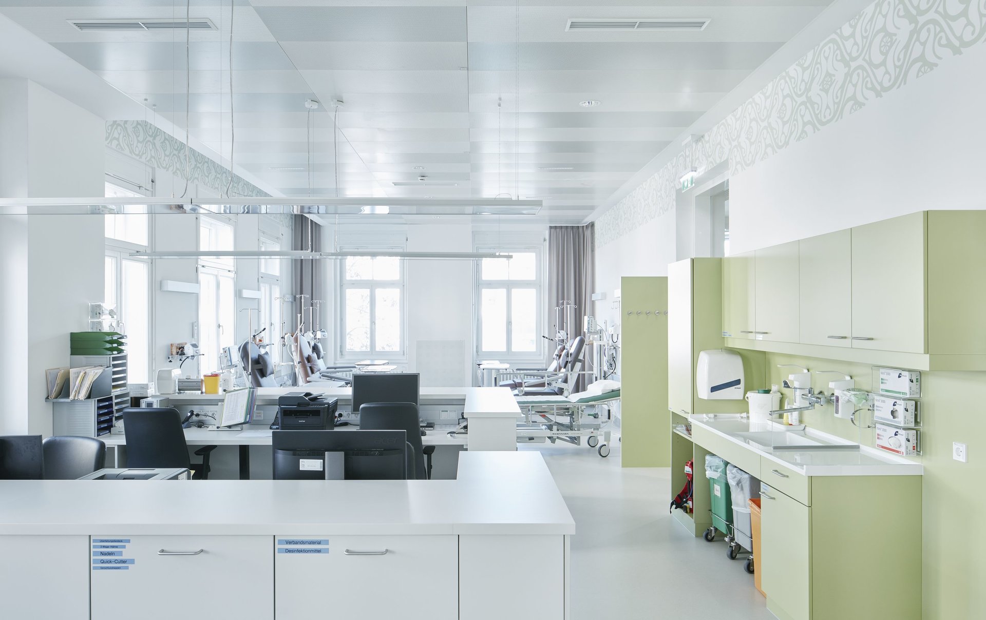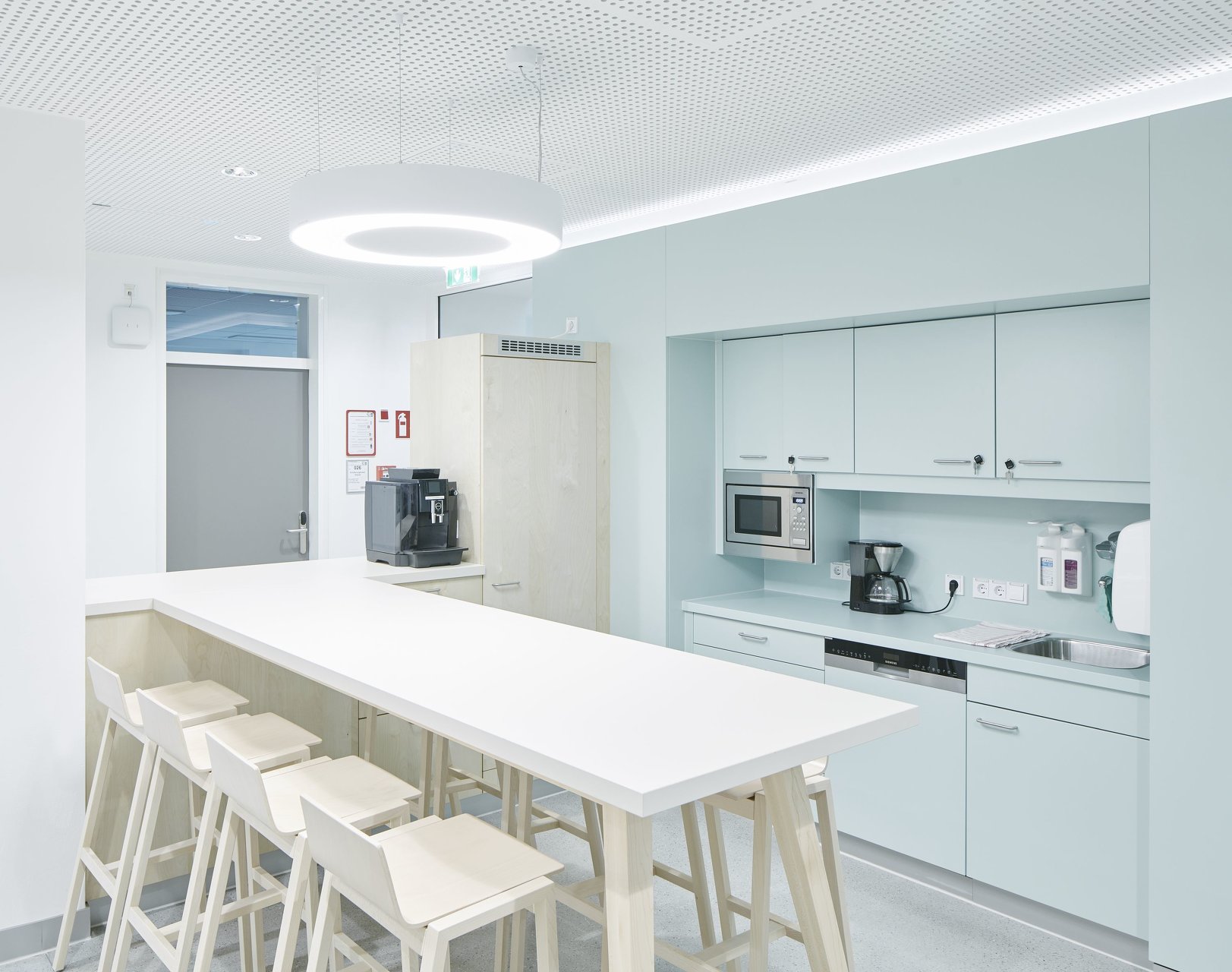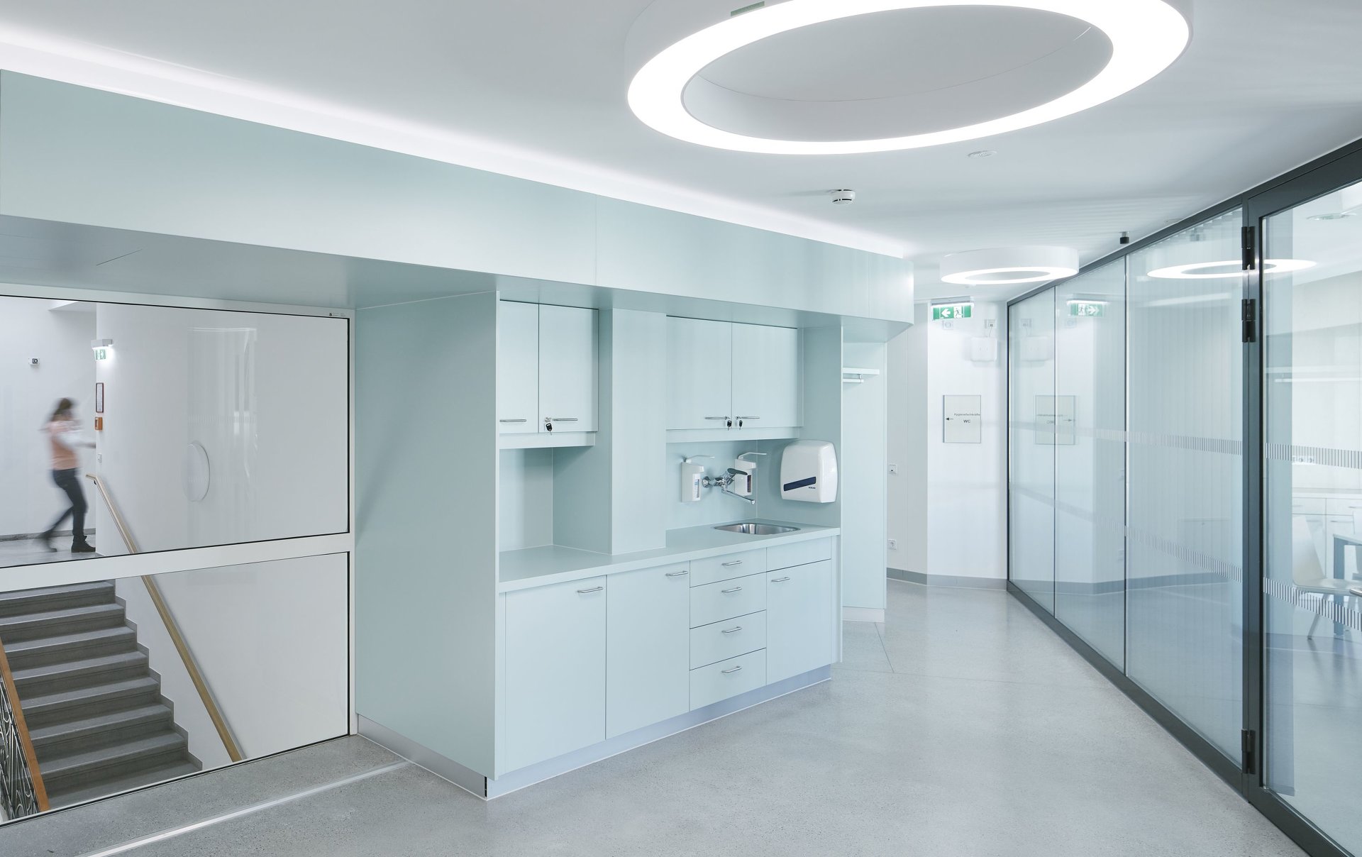 Die neue Ambulanz der Hämatologie ist im Erdgeschoß und ersten Obergeschoß angesiedelt. Beide Geschoße wurden strukturell weitestgehend im Bestand belassen, jedoch wurde je Geschoß eine zirkuläre Erschließung durch einen neuen Gang südlich des Stiegenhauskerns geschaffen. In diesem Bereich wurde ein neuer Sanitärblock untergebracht. Der alte Erschließungskern wurde zum allgemeinen Infrastrukturhub umgestaltet, mit einem einheitlich gestalteten, rundumlaufenden Wandverbau, in den Getränkeautomaten, Schränke, etc. integriert sind. Die Wartebereiche sind offen und wohnlich mit holzverkleideten Wänden gestaltet und erlauben gerichtete Ausblicke in den parkähnlichen Vorgarten. Auch in den Behandlungsräumen und im Therapieraum wird auf eine angenehme und beruhigende Atmosphäre im Einklang mit den anspruchsvollen medizintechnischen und hygienischen Anforderungen wertgelegt. Unterschiedliche Beleuchtungsszenarien sollen im Therapieraum unterstützend wirken.