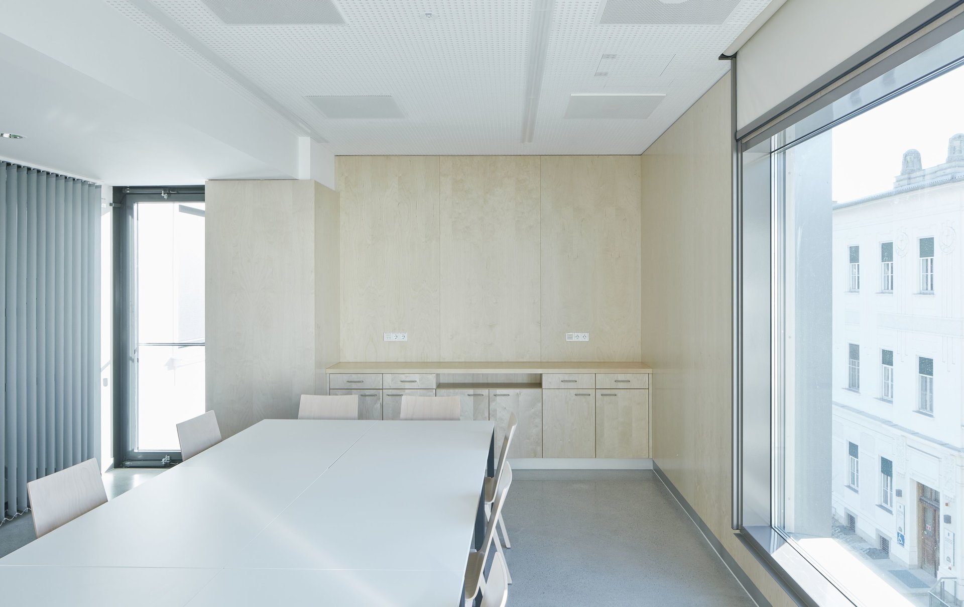 Im 2. Obergeschoß entstanden Büroräume und ein Konferenzraum mit entsprechenden Nebenräumen die extern genutzt werden. Auch hier wurde eine zirkuläre Erschließung um das Stiegenhaus geschaffen. Diese Kernzone dient den gleichen Funktionen wie in den darunterliegenden Geschossen.