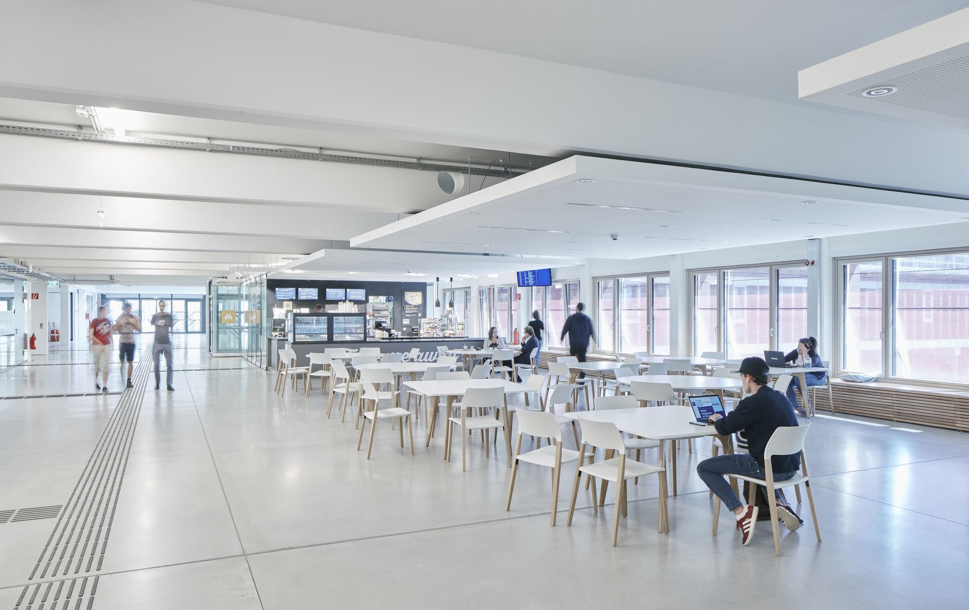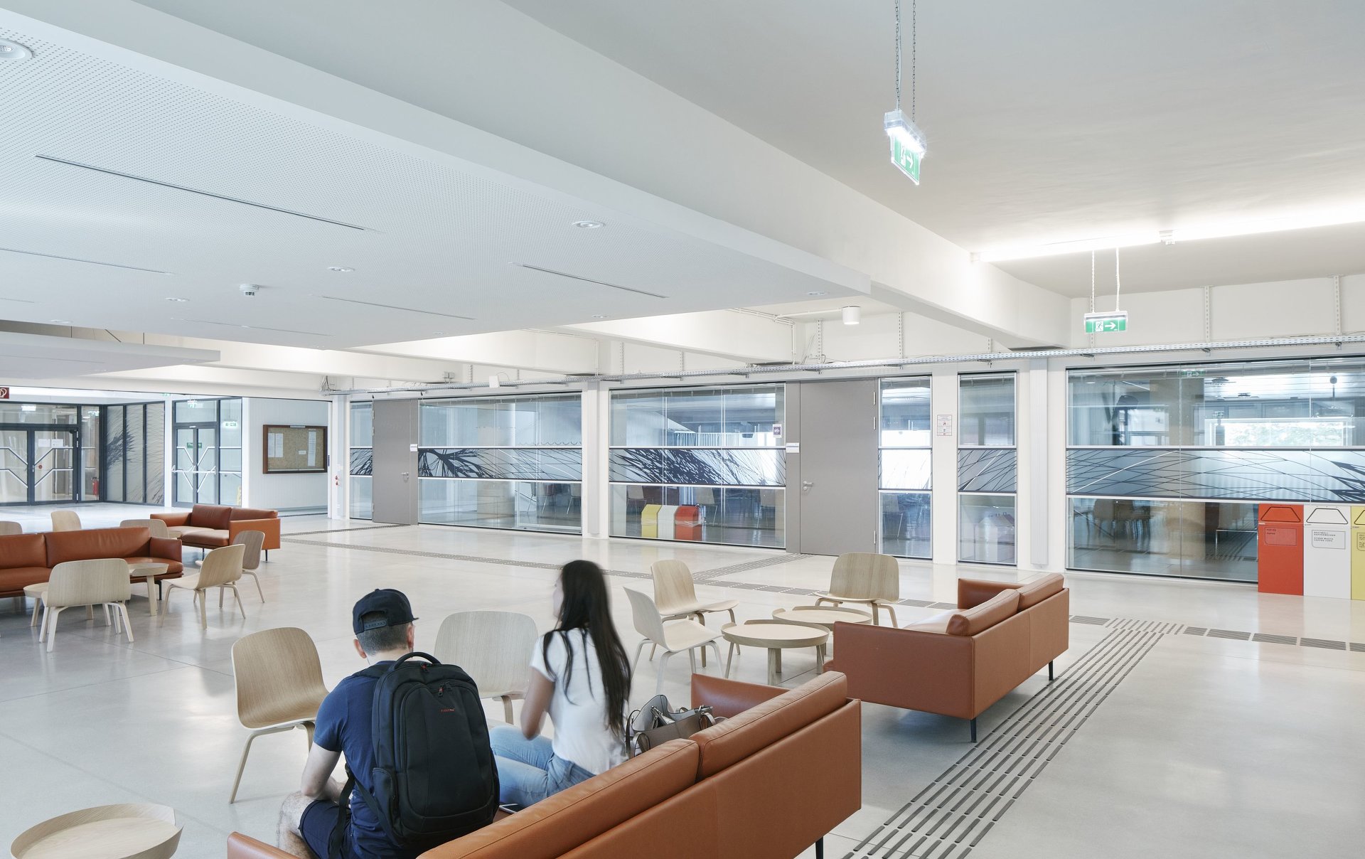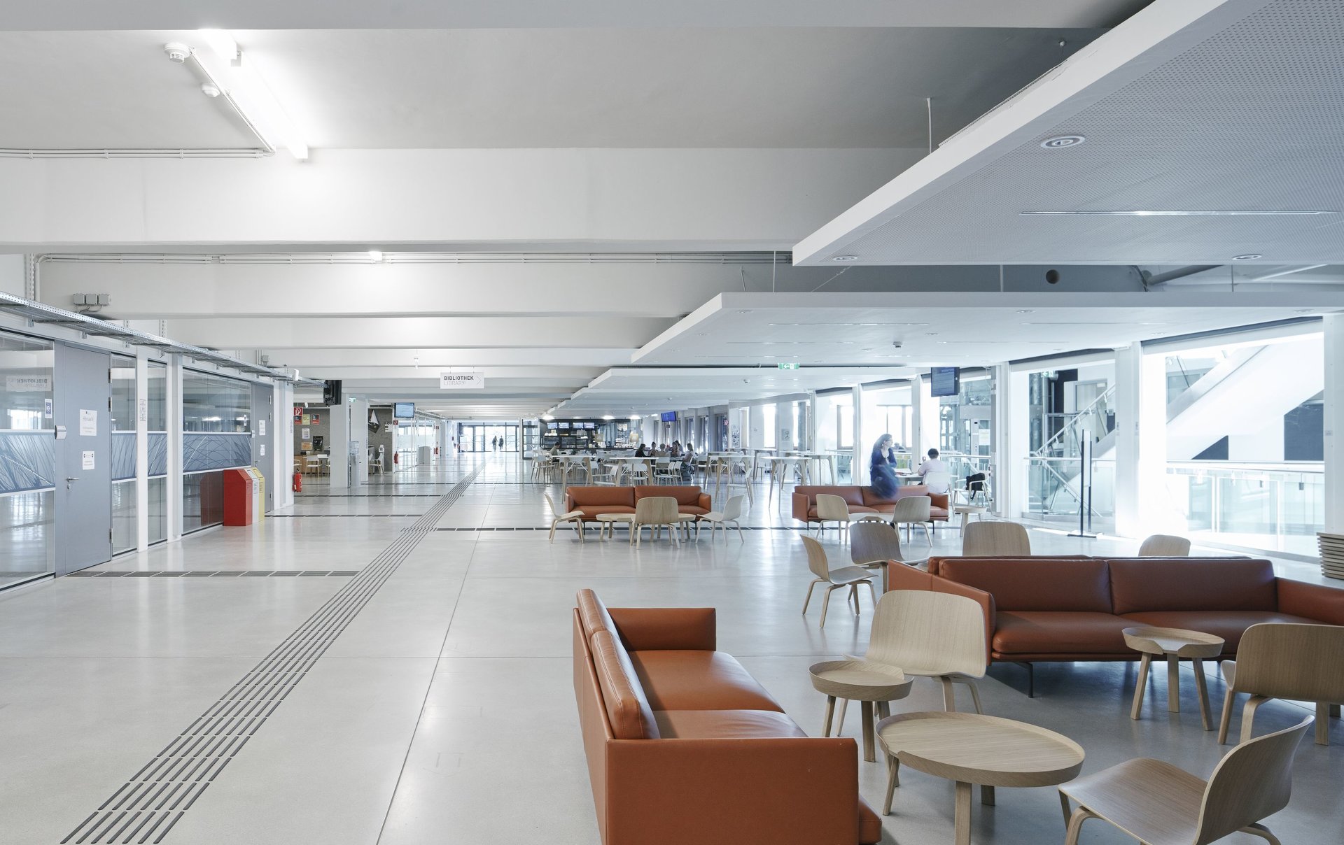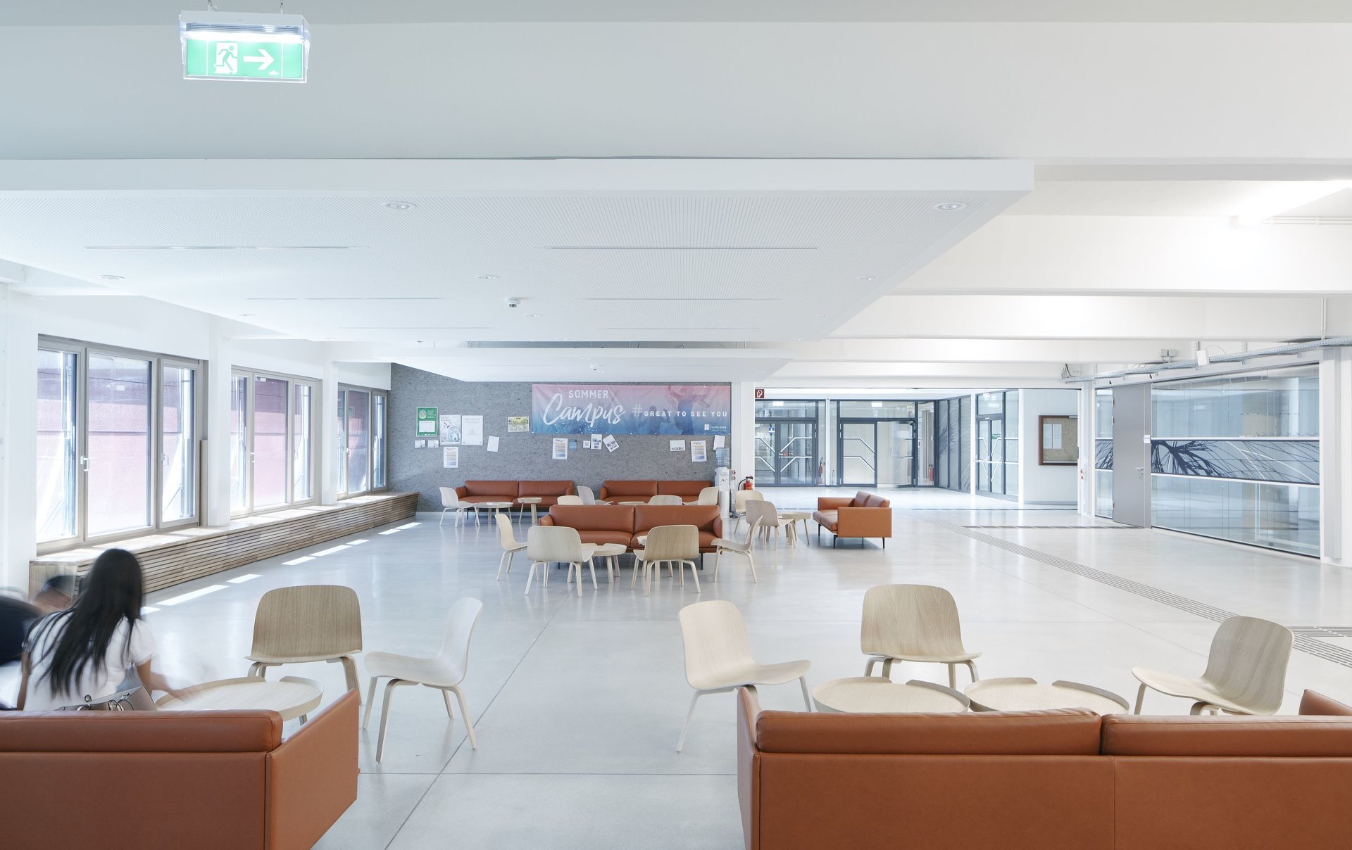 Ein Hauptziel des Entwurfs war die Erweiterung der bisher unzulänglichen Aufenthaltsflächen im zentralen Teil des Gebäudes. Die Büros im Bereich der Aula wurden zugunsten von Kommunikationsbereichen in den östlichen bzw. westlichen Teil des Gebäudes verlegt. Dies führt zu einer offenen, zentralen Aula im Herzen des Gebäudes mit großzügigen Lern-, Arbeits-, Aufenthalts- und Kommunikationsflächen. Die Belichtungssituation wird durch die Verlegung der südlichen Büros drastisch verbessert. Zusätzlich werden in diesem Bereich die bestehenden Fensterparapete durch raumhohe Verglasungen ersetzt.