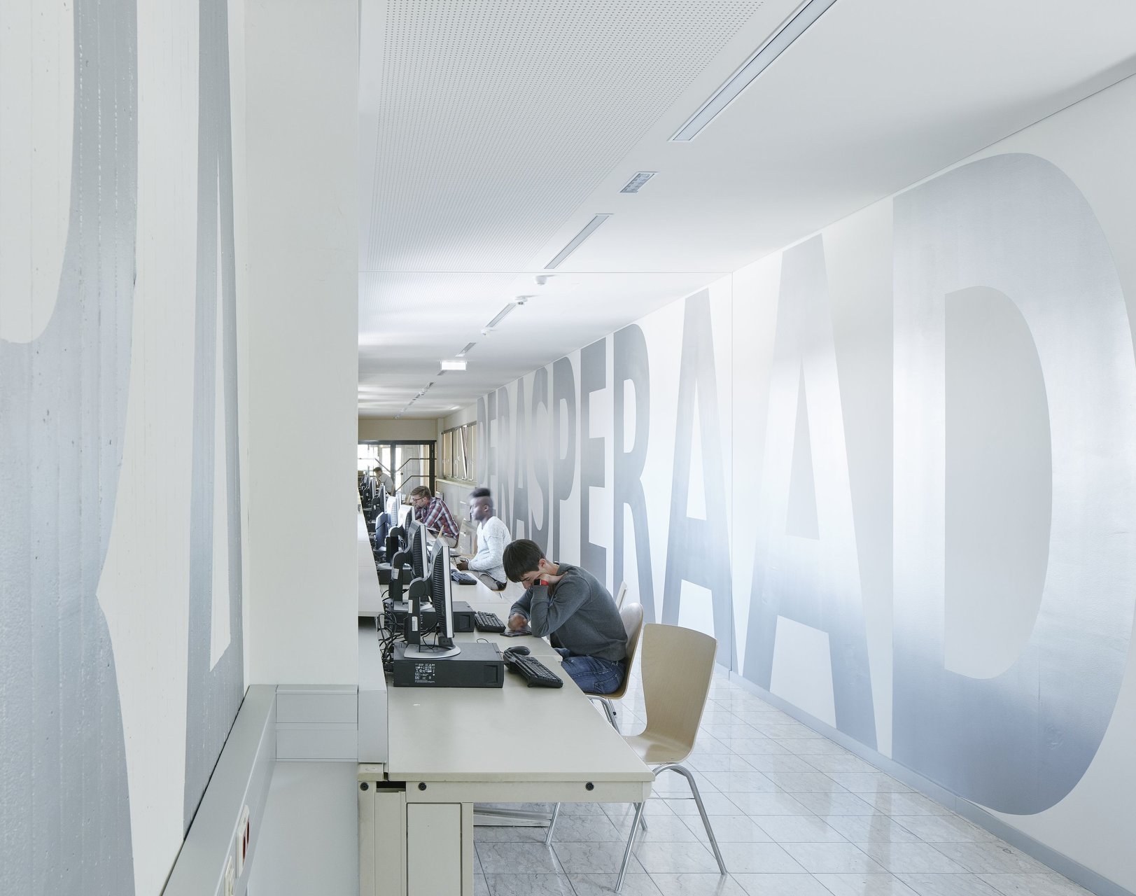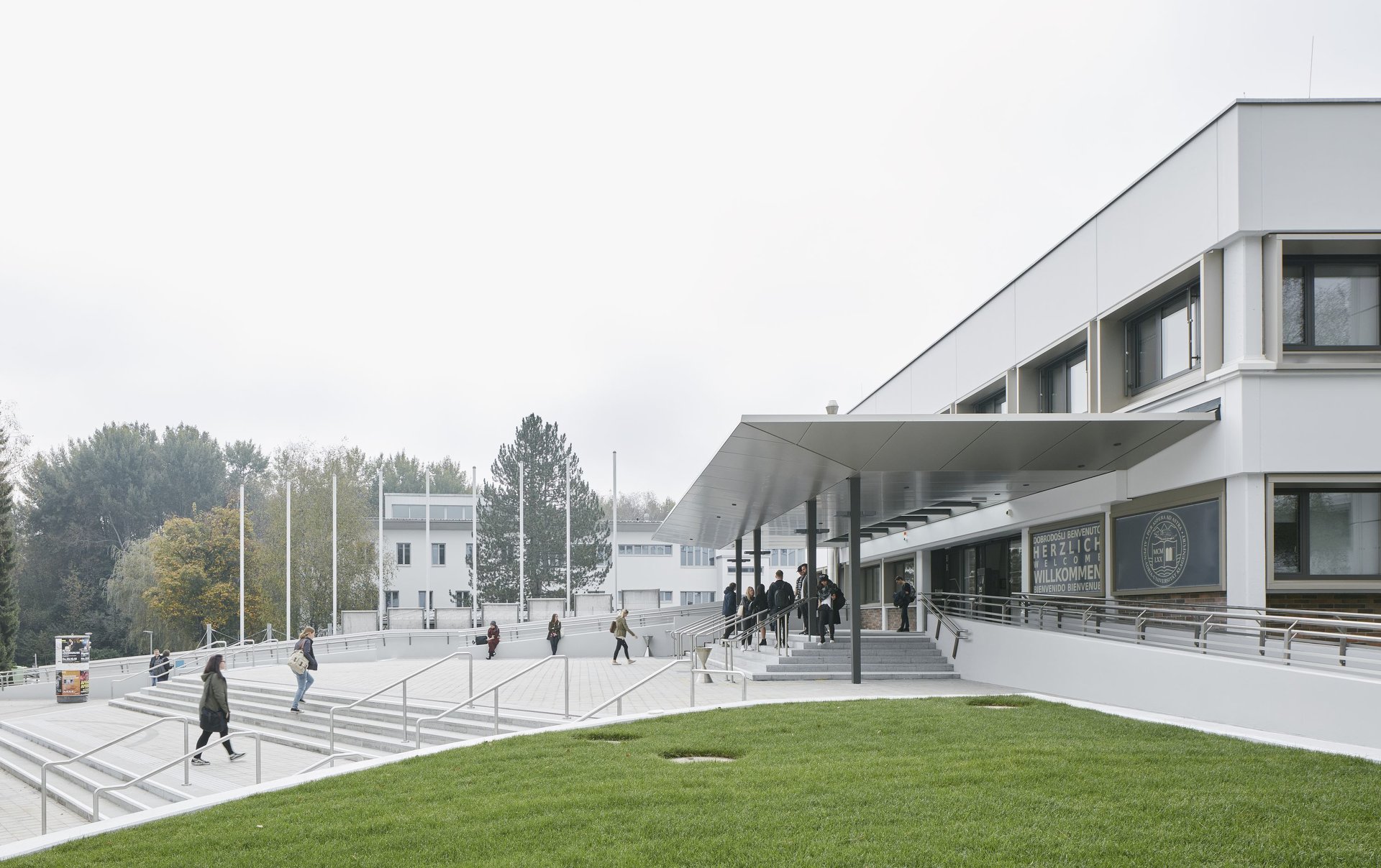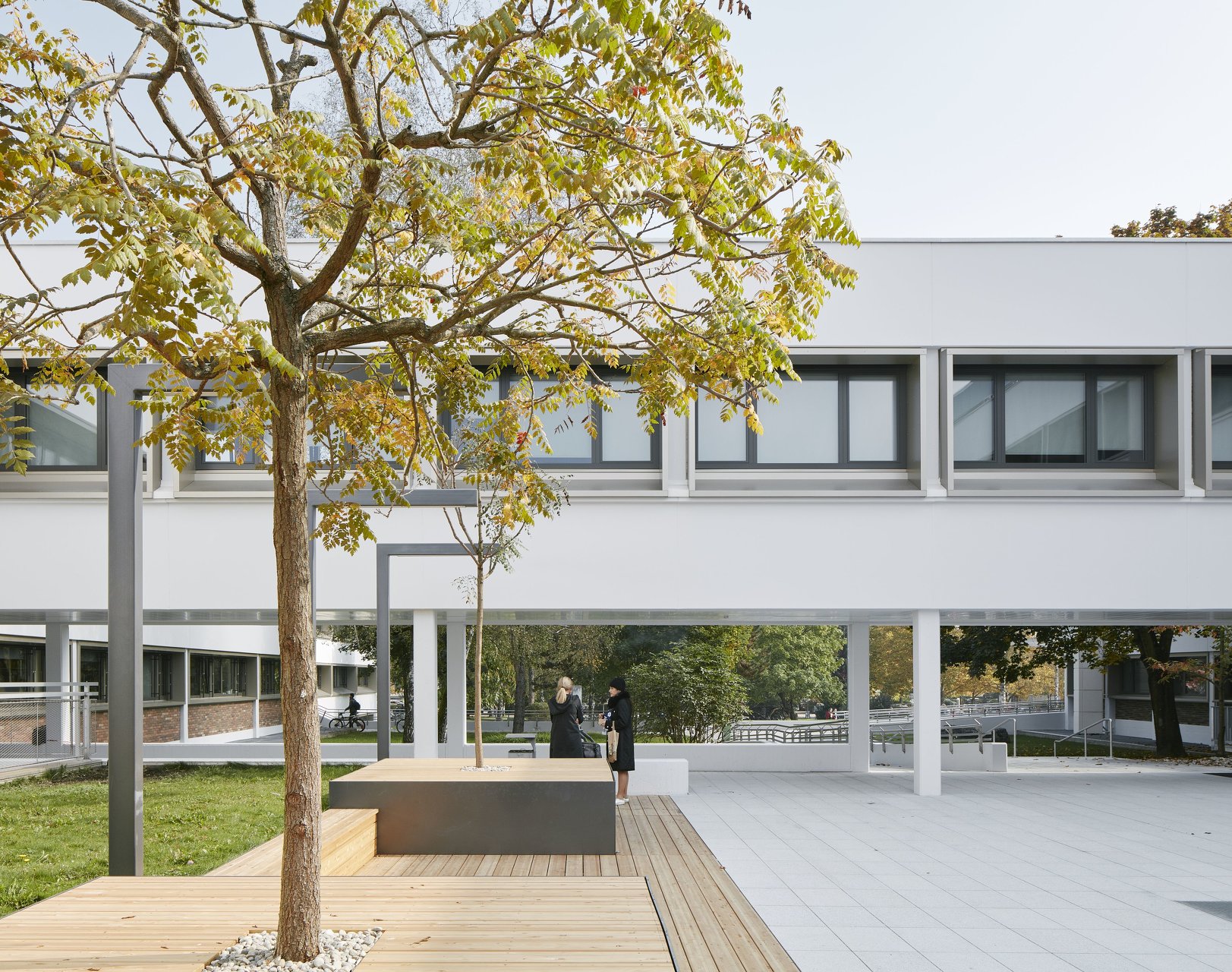 Ein Hauptziel des Entwurfs war die Erweiterung der bisher unzulänglichen Aufenthaltsflächen im zentralen Teil des Gebäudes. Die Büros im Bereich der Aula wurden zugunsten von Kommunikationsbereichen in den östlichen bzw. westlichen Teil des Gebäudes verlegt. Dies führt zu einer offenen, zentralen Aula im Herzen des Gebäudes mit großzügigen Lern-, Arbeits-, Aufenthalts- und Kommunikationsflächen. Die Belichtungssituation wird durch die Verlegung der südlichen Büros drastisch verbessert. Zusätzlich werden in diesem Bereich die bestehenden Fensterparapete durch raumhohe Verglasungen ersetzt.