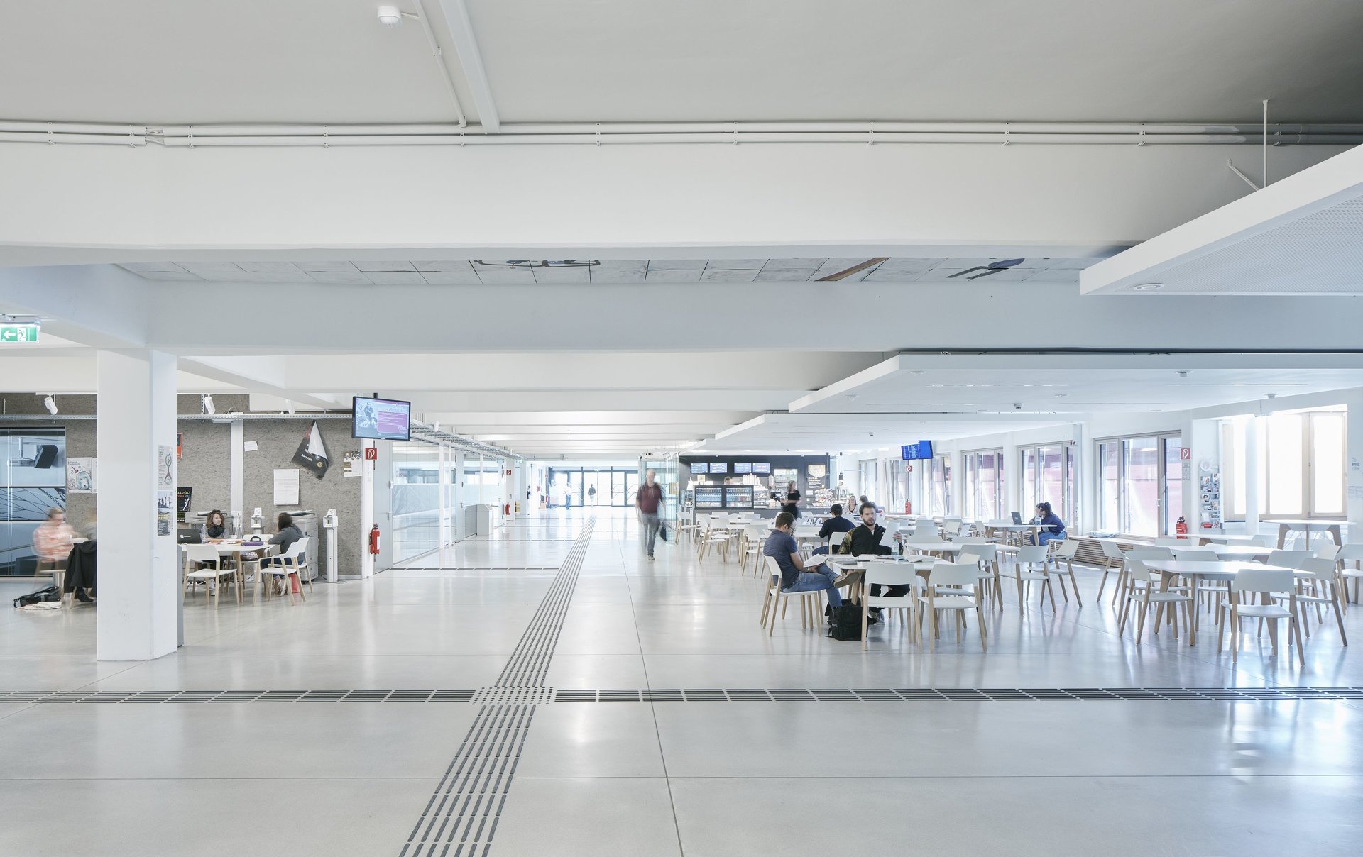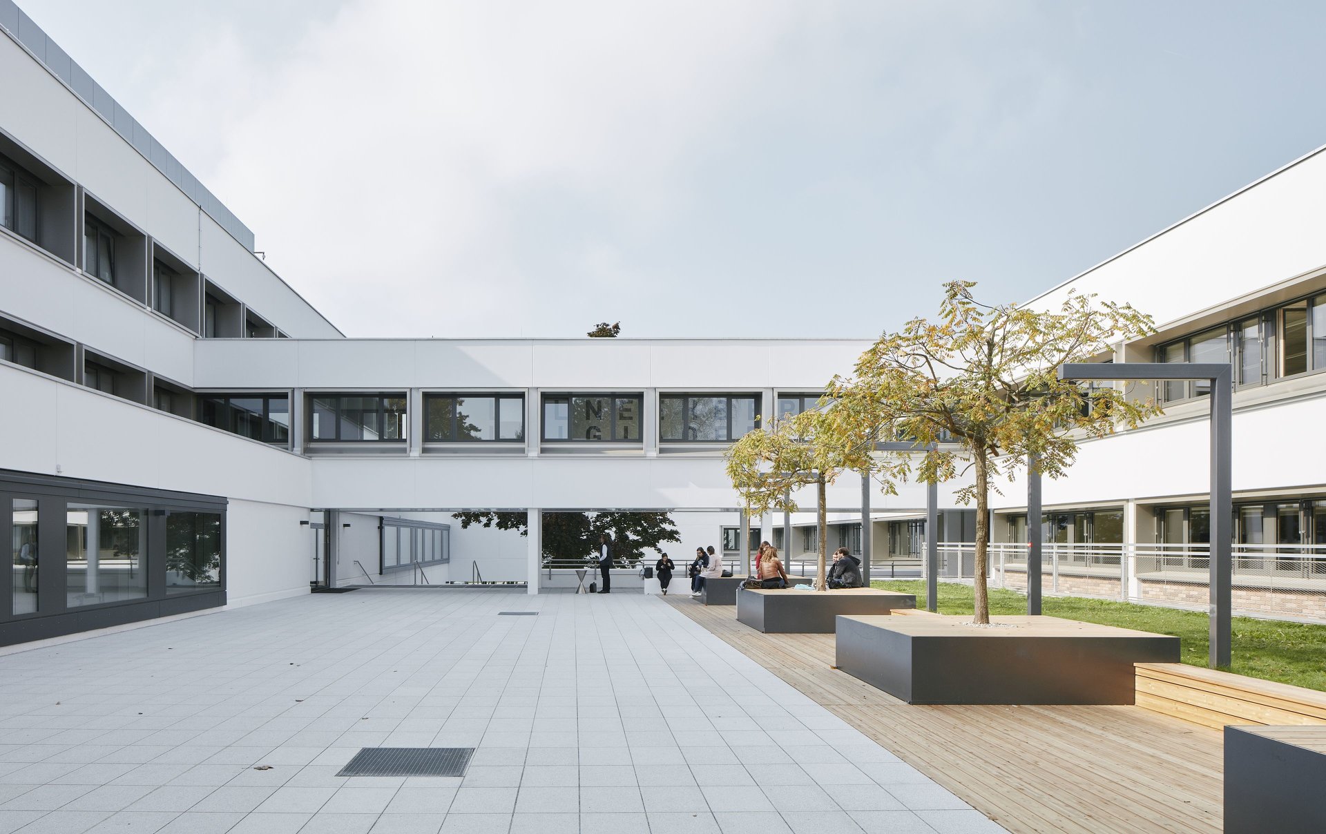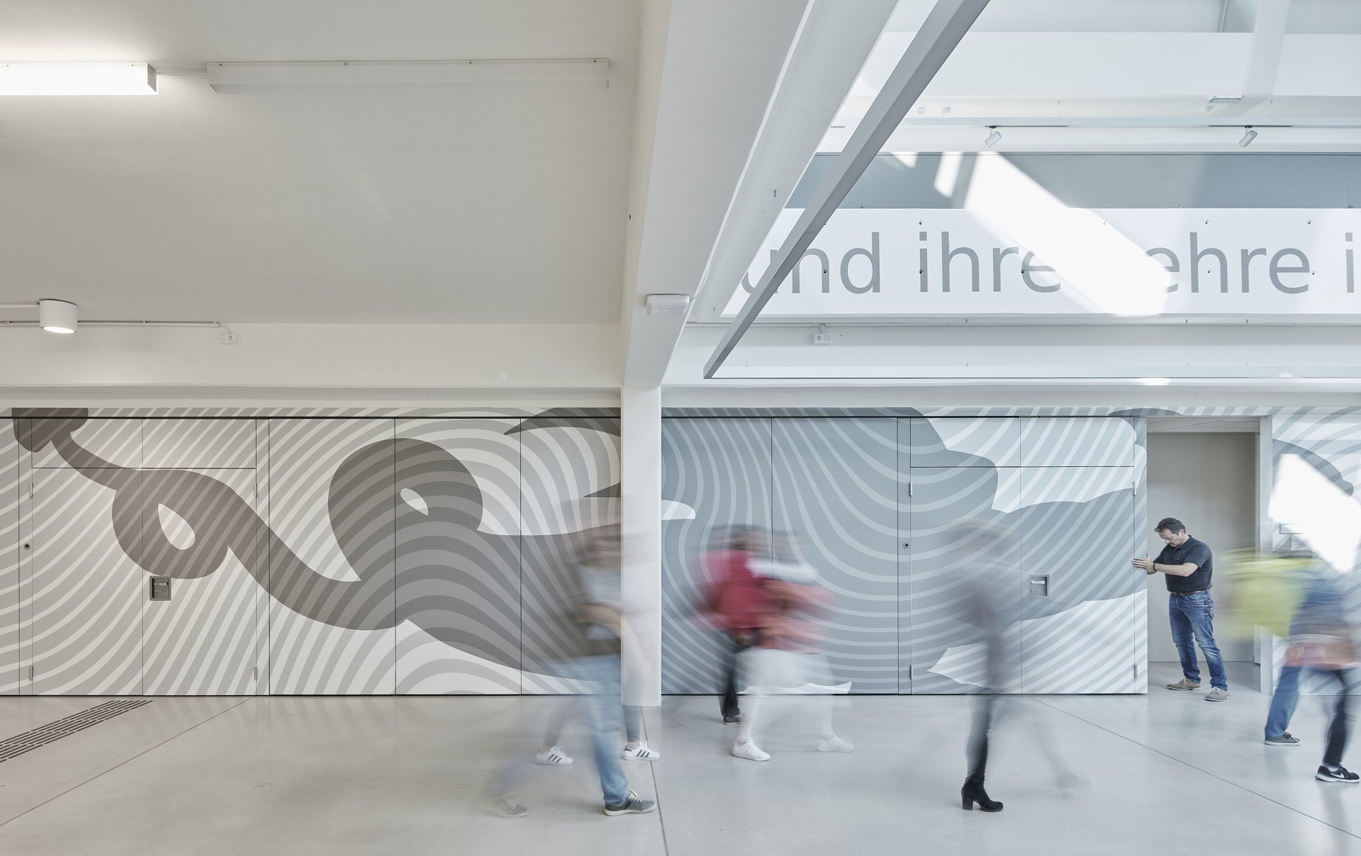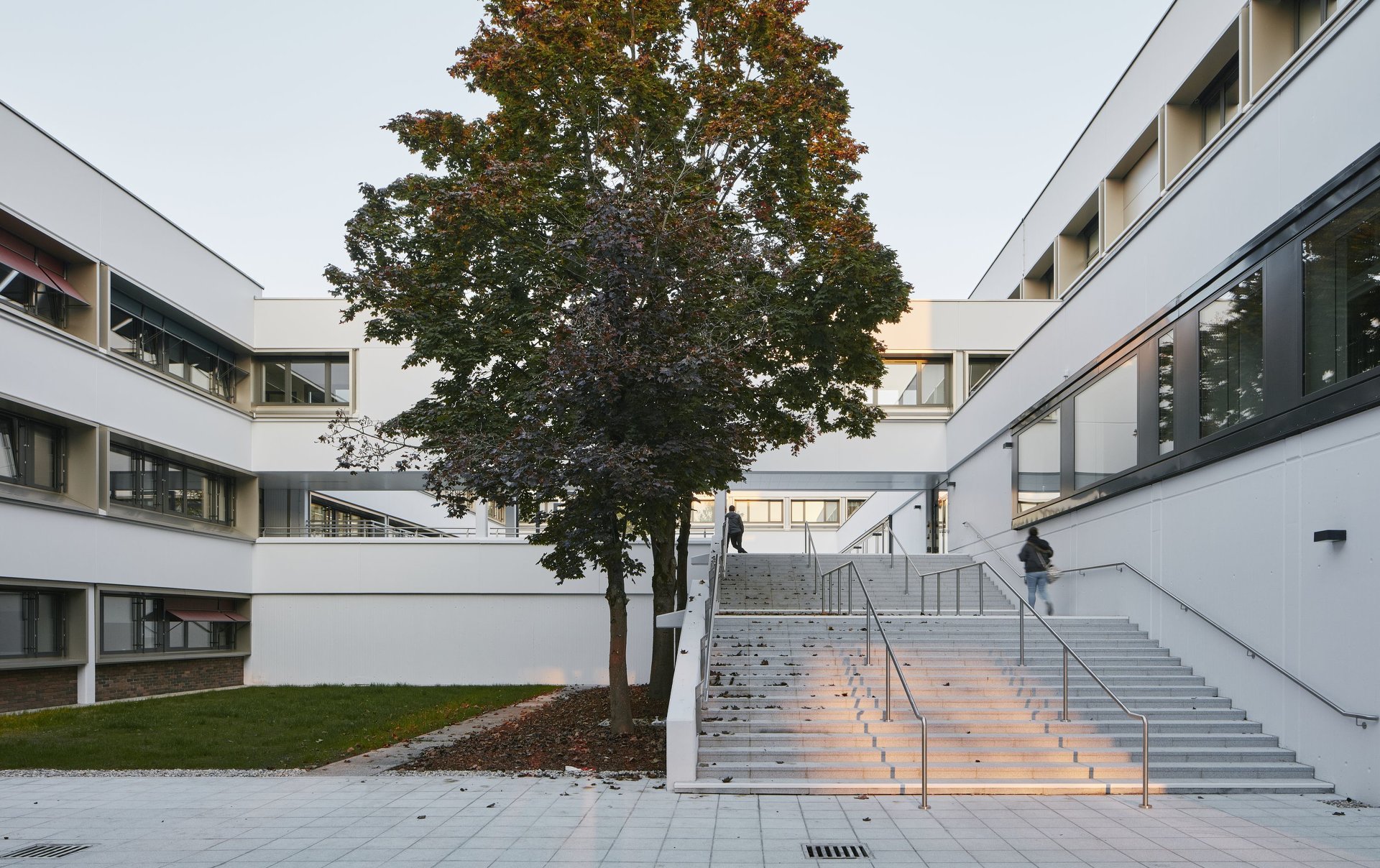 Ein Hauptziel des Entwurfs war die Erweiterung der bisher unzulänglichen Aufenthaltsflächen im zentralen Teil des Gebäudes. Die Büros im Bereich der Aula wurden zugunsten von Kommunikationsbereichen in den östlichen bzw. westlichen Teil des Gebäudes verlegt. Dies führt zu einer offenen, zentralen Aula im Herzen des Gebäudes mit großzügigen Lern-, Arbeits-, Aufenthalts- und Kommunikationsflächen. Die Belichtungssituation wird durch die Verlegung der südlichen Büros drastisch verbessert. Zusätzlich werden in diesem Bereich die bestehenden Fensterparapete durch raumhohe Verglasungen ersetzt.