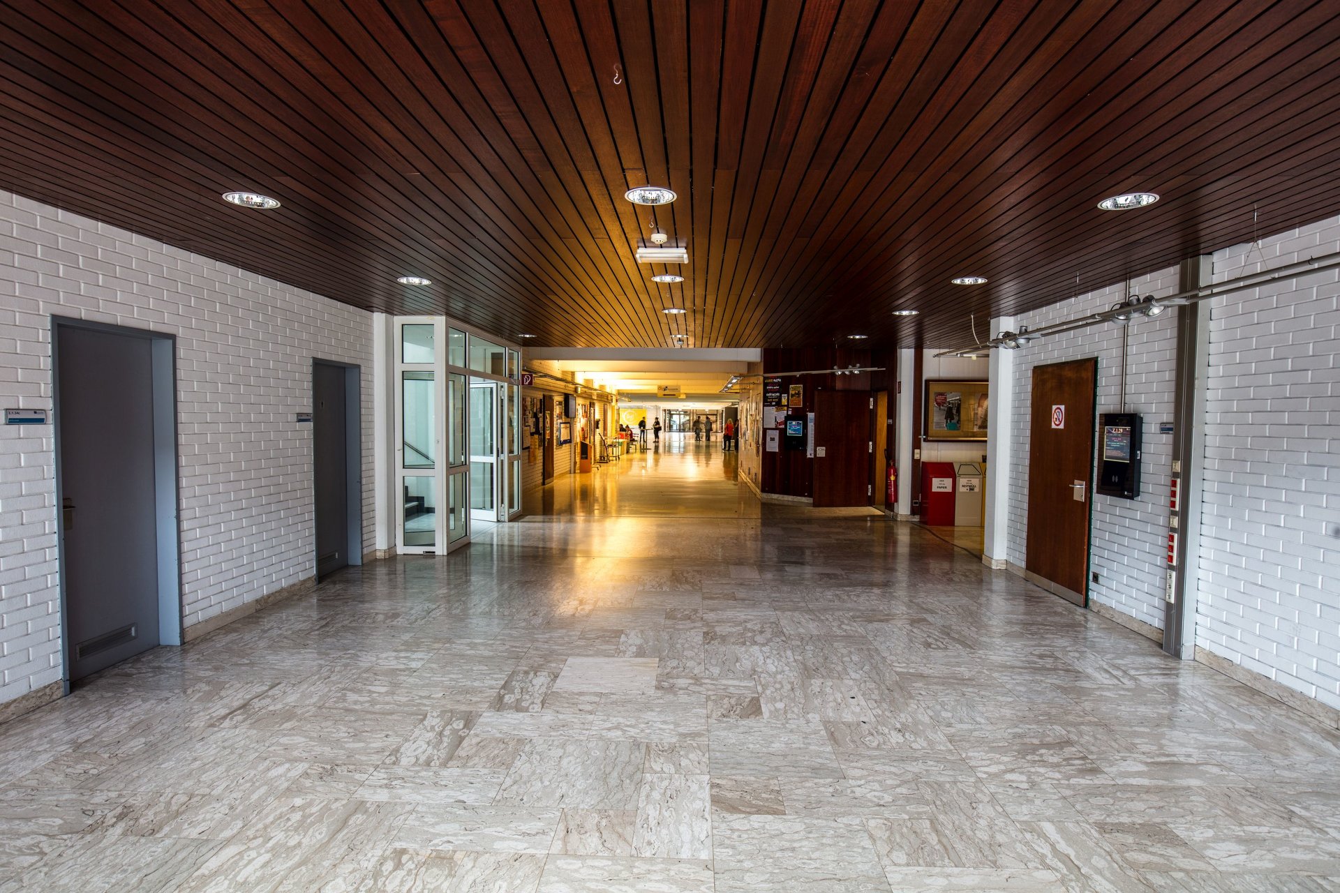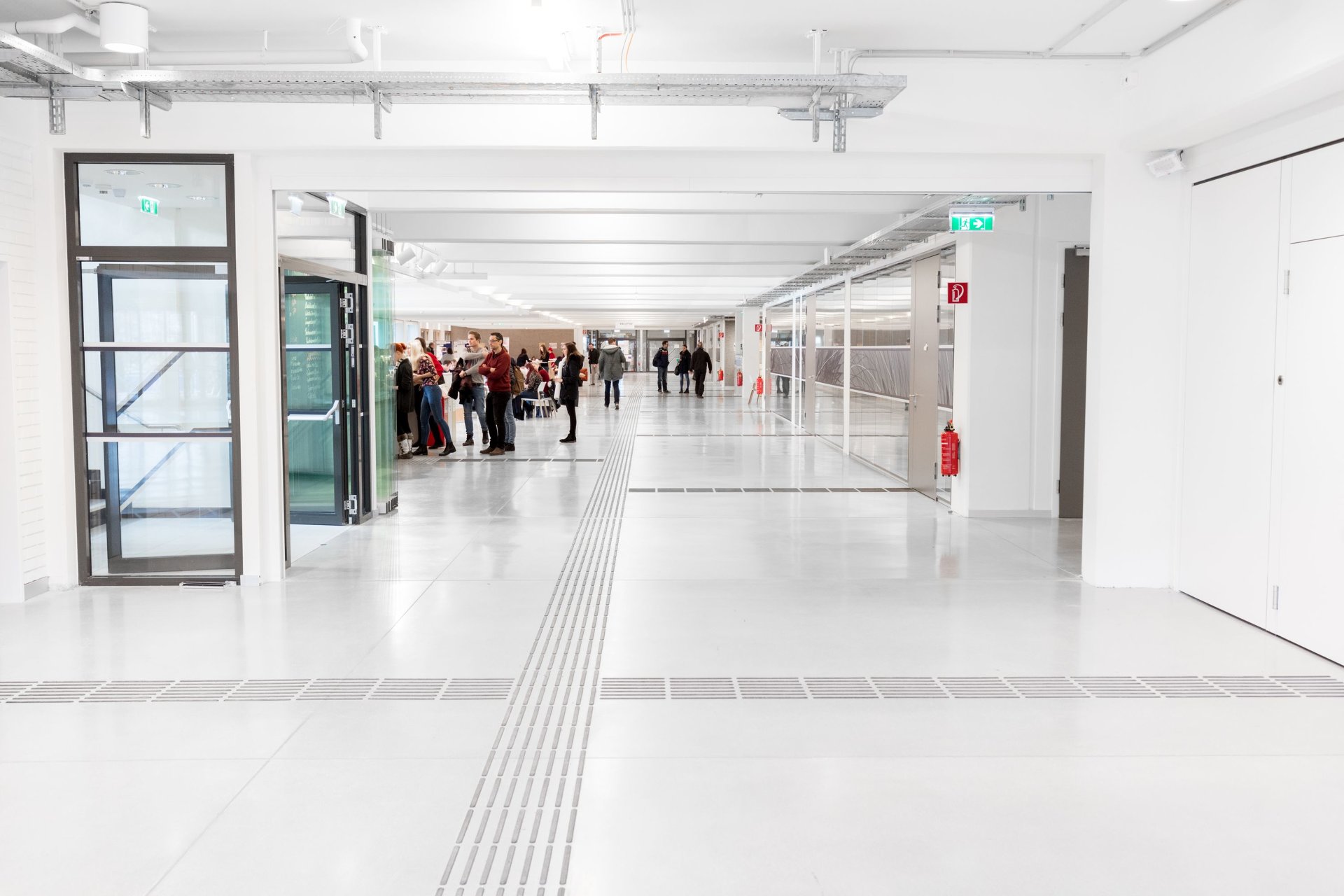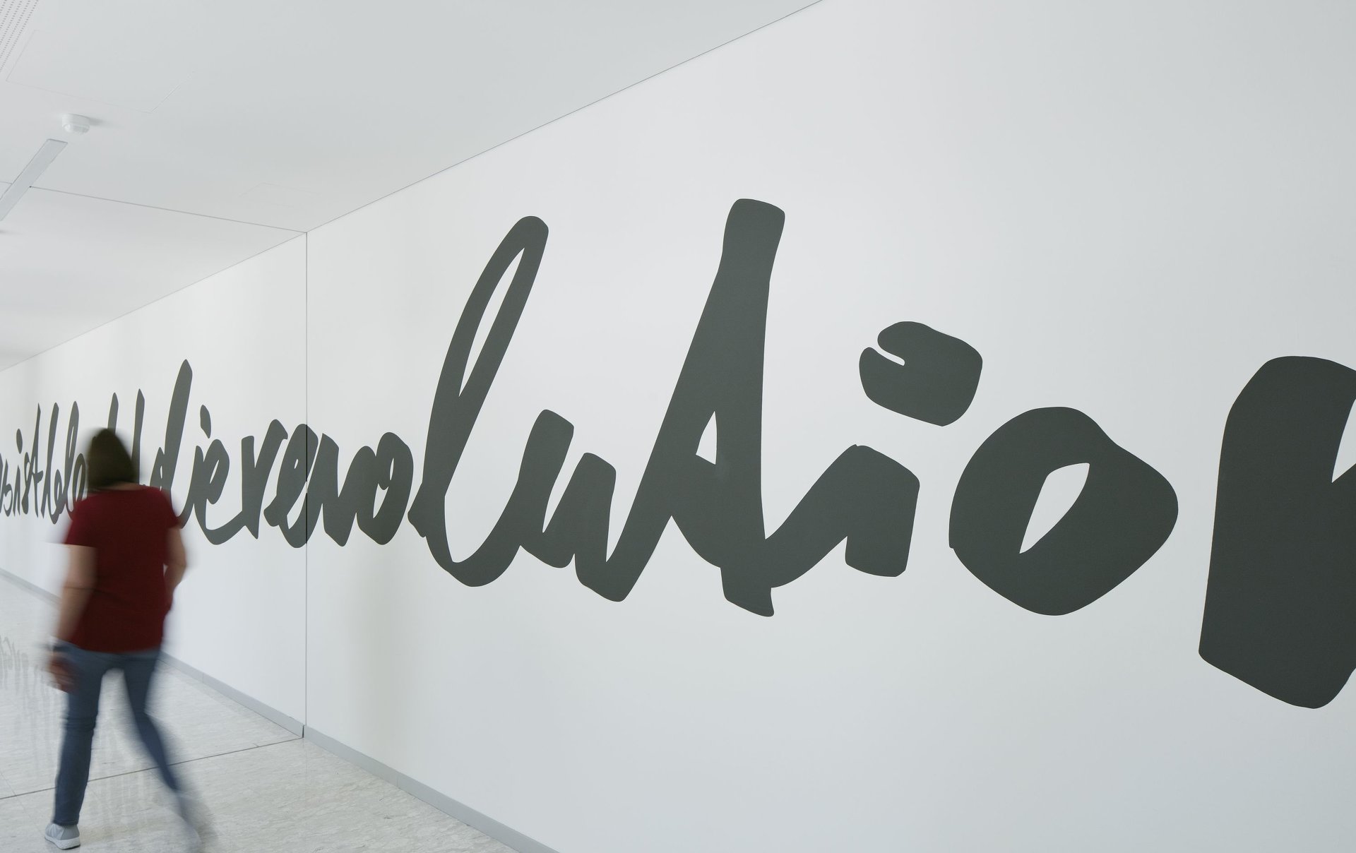 Durch die einladende Geste eines weit auskragenden Vordaches wird der Haupteingang deutlich hervorgehoben. Das Foyer der Universität wurde entkernt und zu einem offenen und zeitgemäßen Empfangsbereich umgestaltet. Portierloge und Telefonzentrale sind anschließend an den Windfang positioniert, temporäre Arbeitsplätze befinden sich in einer offenen Inselsituation.