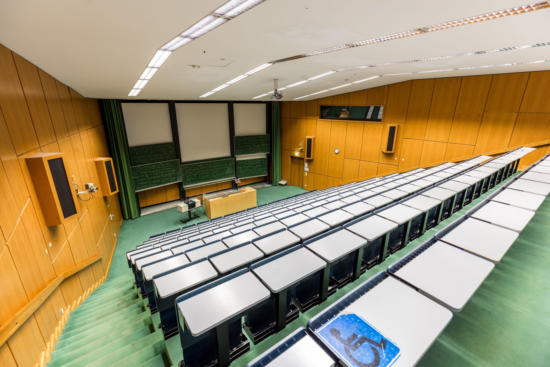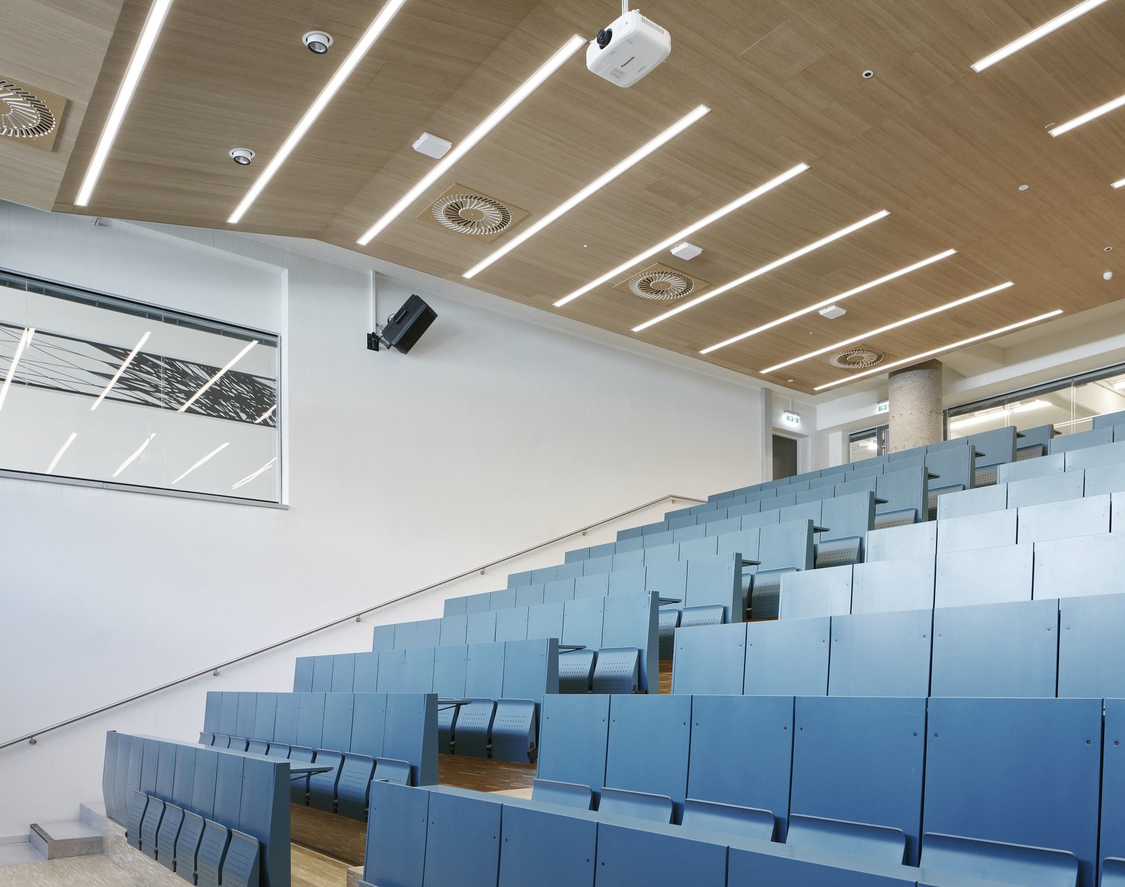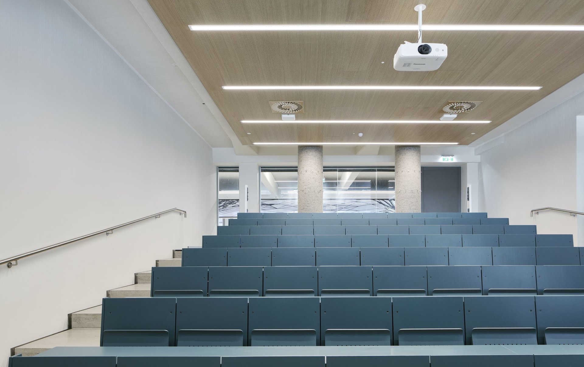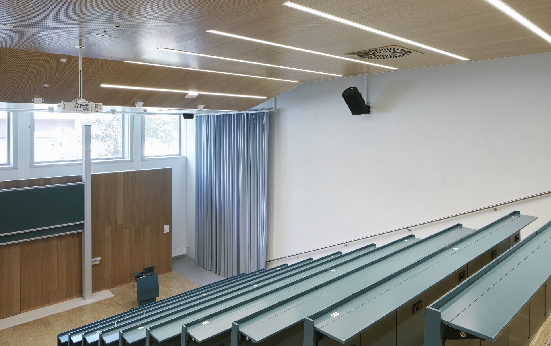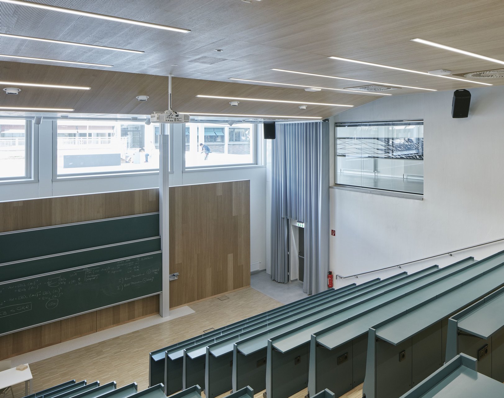 Die Wände der Hörsäle werden in den Gangbereichen bis auf die tragende Stützenkonstruktion entfernt und mit Schallschutzgläsern transparent gestaltet. Die nördlichen Außenwände der Hörsäle werden mit Öffnungen versehen, um Tageslicht in das Innere zu bringen. Semitransparente Vorhänge und eine Verdunkelungsanlage ermöglichen eine individuelle Steuerung der Tageslichtsituation.