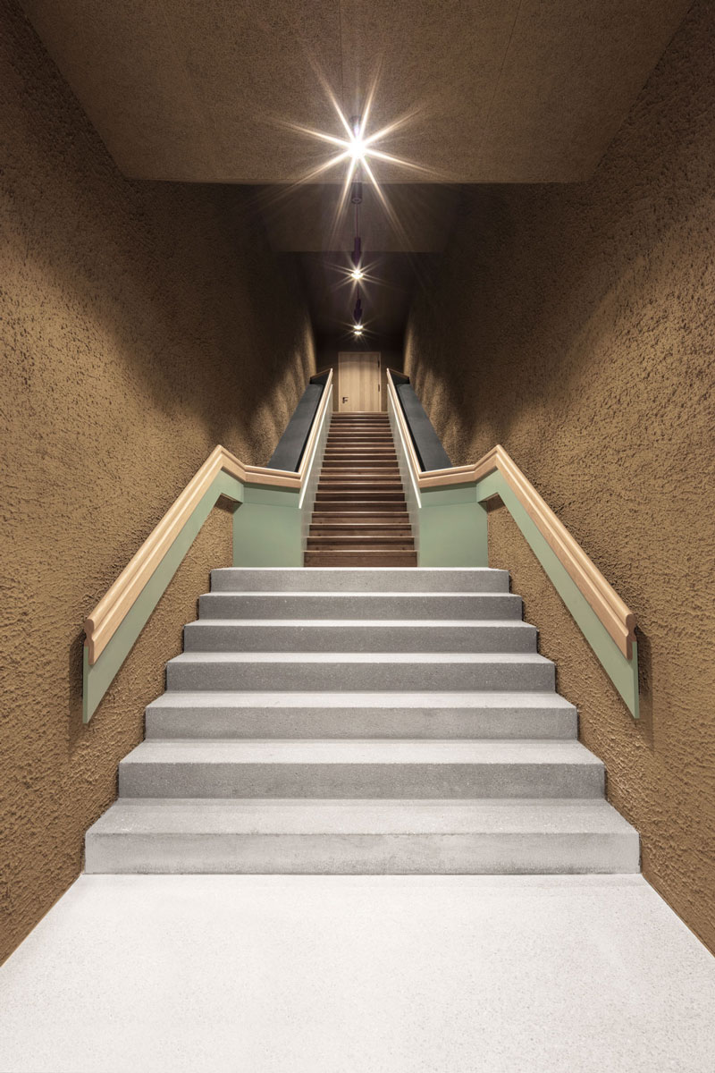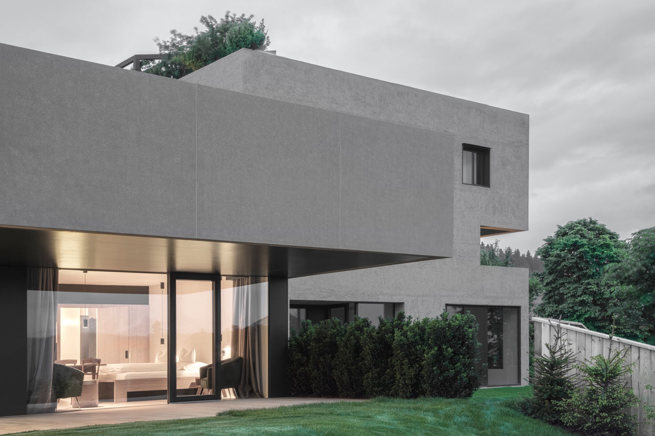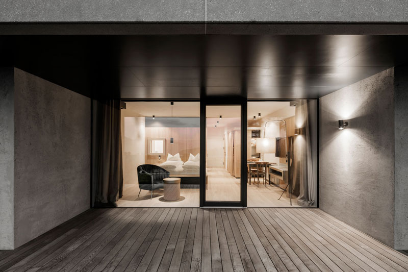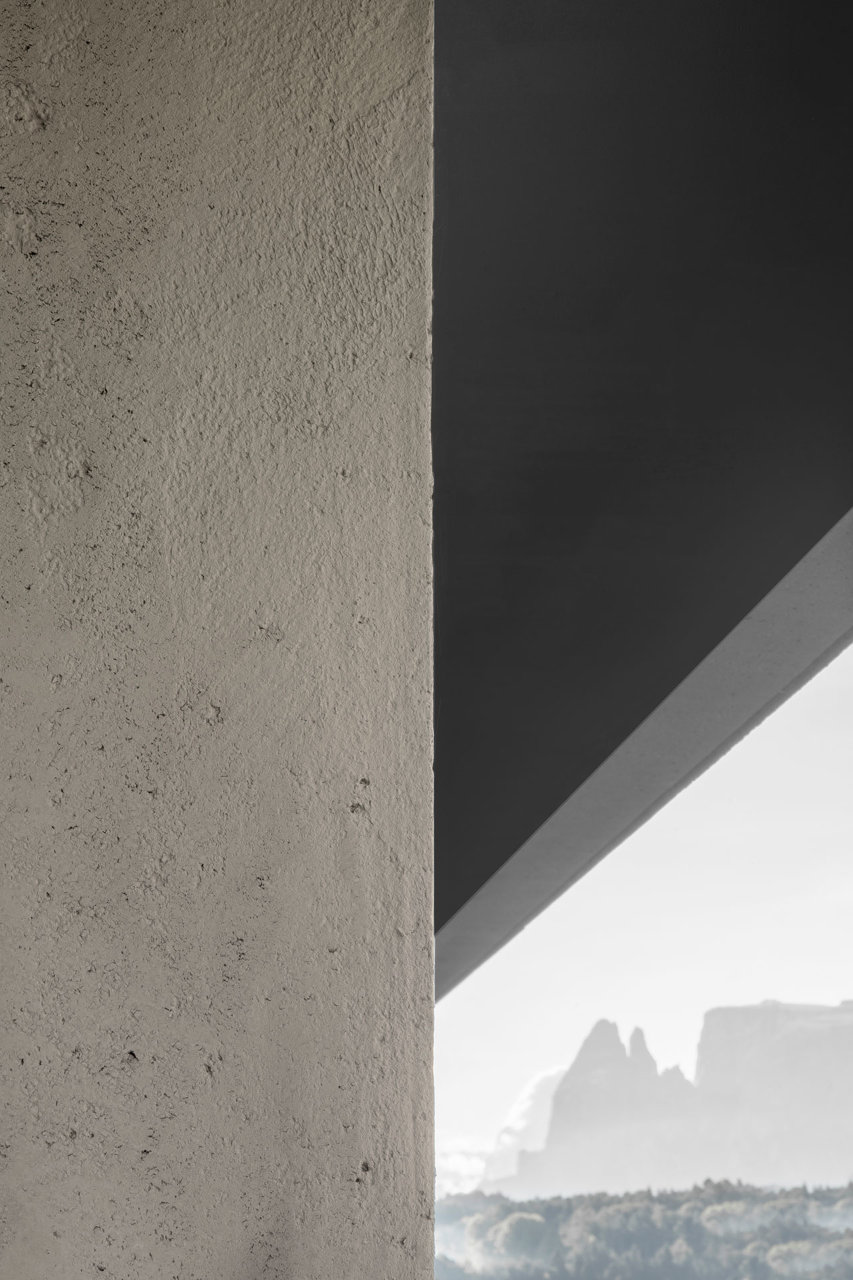 Die Topografie des Hangs aufnehmend öffnen sich die aufgereihten Suiten mit ihren verglasten Fronten und intimen Terrassen nach Süden und geben den Blick auf die Dolomiten frei, die dem Unesco-Weltkulturerbe angehören. Auch das untere Geschoß mit Wellnessbereich, Behandlungsräumen, Saunen, Ruheräumen und Hammam hat einen ebenerdigen Zugang in den Garten. Das Herzstück bildet ein Innenhof, der Natur und Licht ins Innere bringt. Über Treppen und unterirdische Gänge ist das Hotel in allen Teilen verbunden, die Tiefgarage befindet sich im hinteren Gebäudeteil des Gästetrakts.