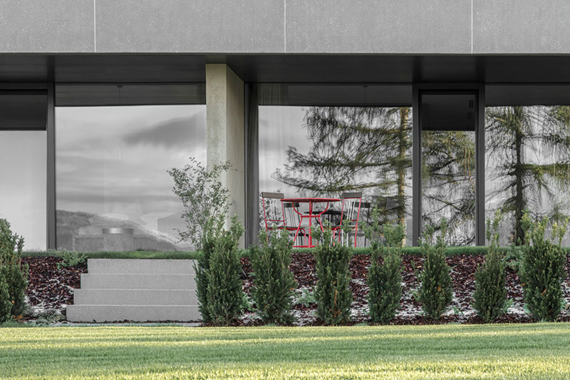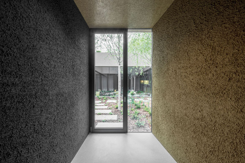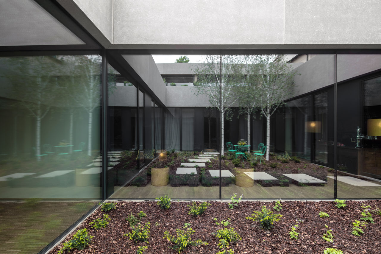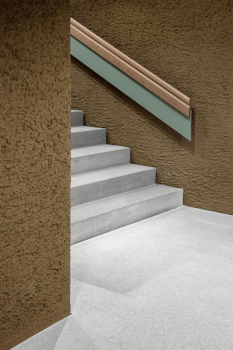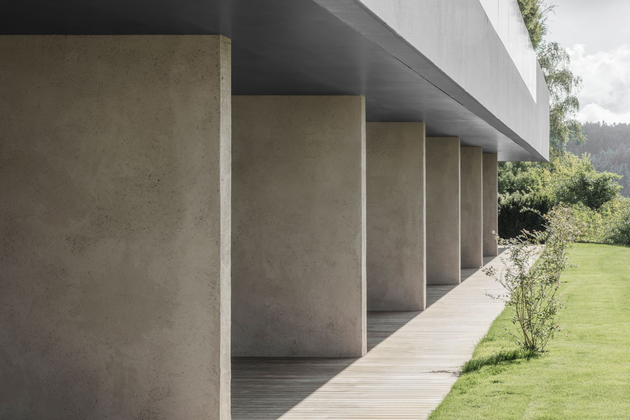 Die Topografie des Hangs aufnehmend öffnen sich die aufgereihten Suiten mit ihren verglasten Fronten und intimen Terrassen nach Süden und geben den Blick auf die Dolomiten frei, die dem Unesco-Weltkulturerbe angehören. Auch das untere Geschoß mit Wellnessbereich, Behandlungsräumen, Saunen, Ruheräumen und Hammam hat einen ebenerdigen Zugang in den Garten. Das Herzstück bildet ein Innenhof, der Natur und Licht ins Innere bringt. Über Treppen und unterirdische Gänge ist das Hotel in allen Teilen verbunden, die Tiefgarage befindet sich im hinteren Gebäudeteil des Gästetrakts.