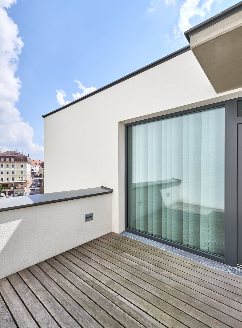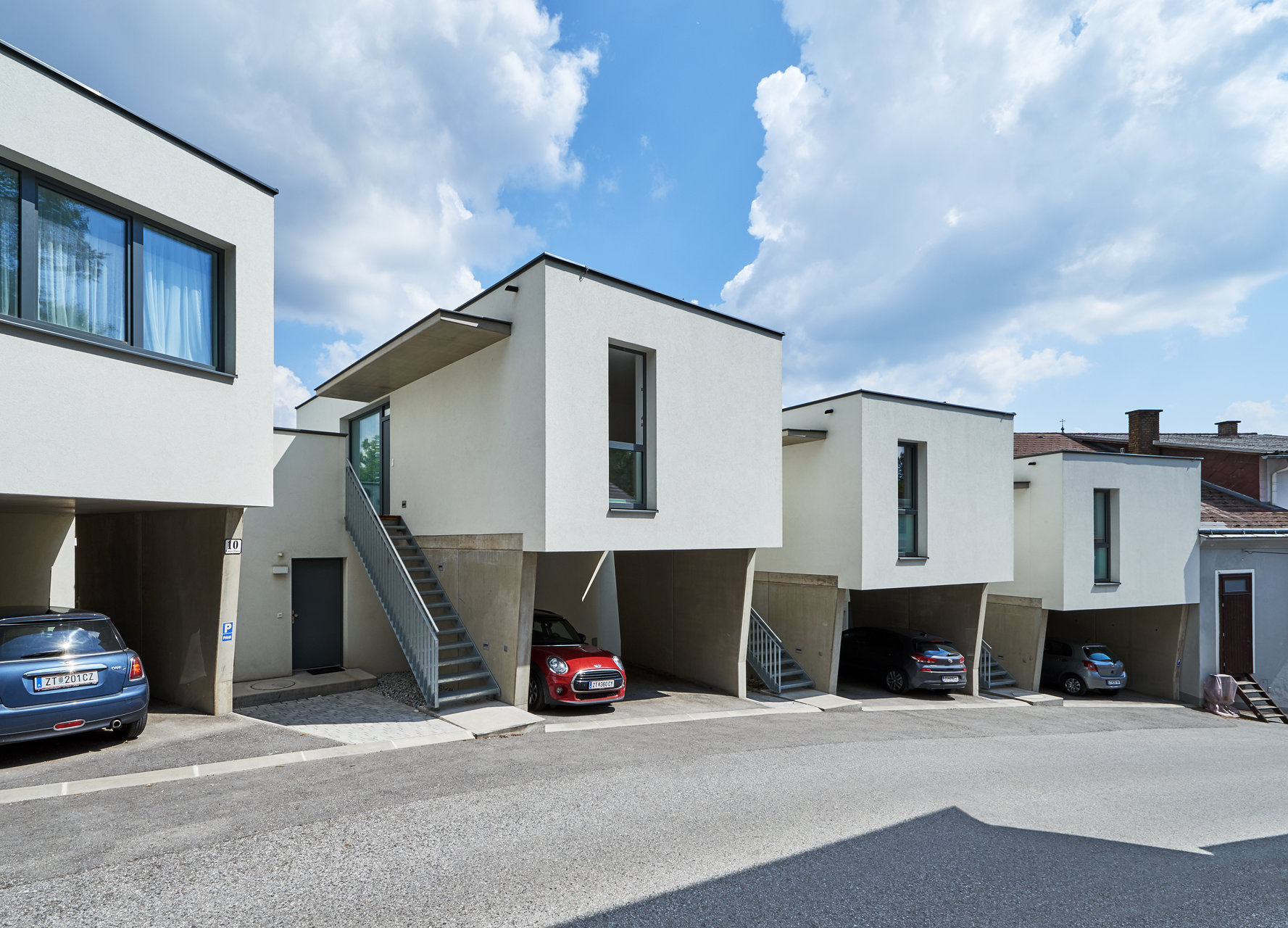Die Schnitte und Öffnungen der Wohnbauten zielen auf die bestmögliche Nutzung von Ost- bzw. Westsonne ab. Egal ob Erdgeschoß oder Obergeschoß: jede Wohnung verfügt über raumhohe Fenster und eine Terrasse, da die vorgelagerte Grünfläche für eine sinnvolle Gartennutzung zu steil ist. Nur die am Westende des Grundstücks gelegene, etwas größer dimensionierte Maisonette-Wohnung, verfügt nebst Terrasse auch über 36m² Gartenfläche.
