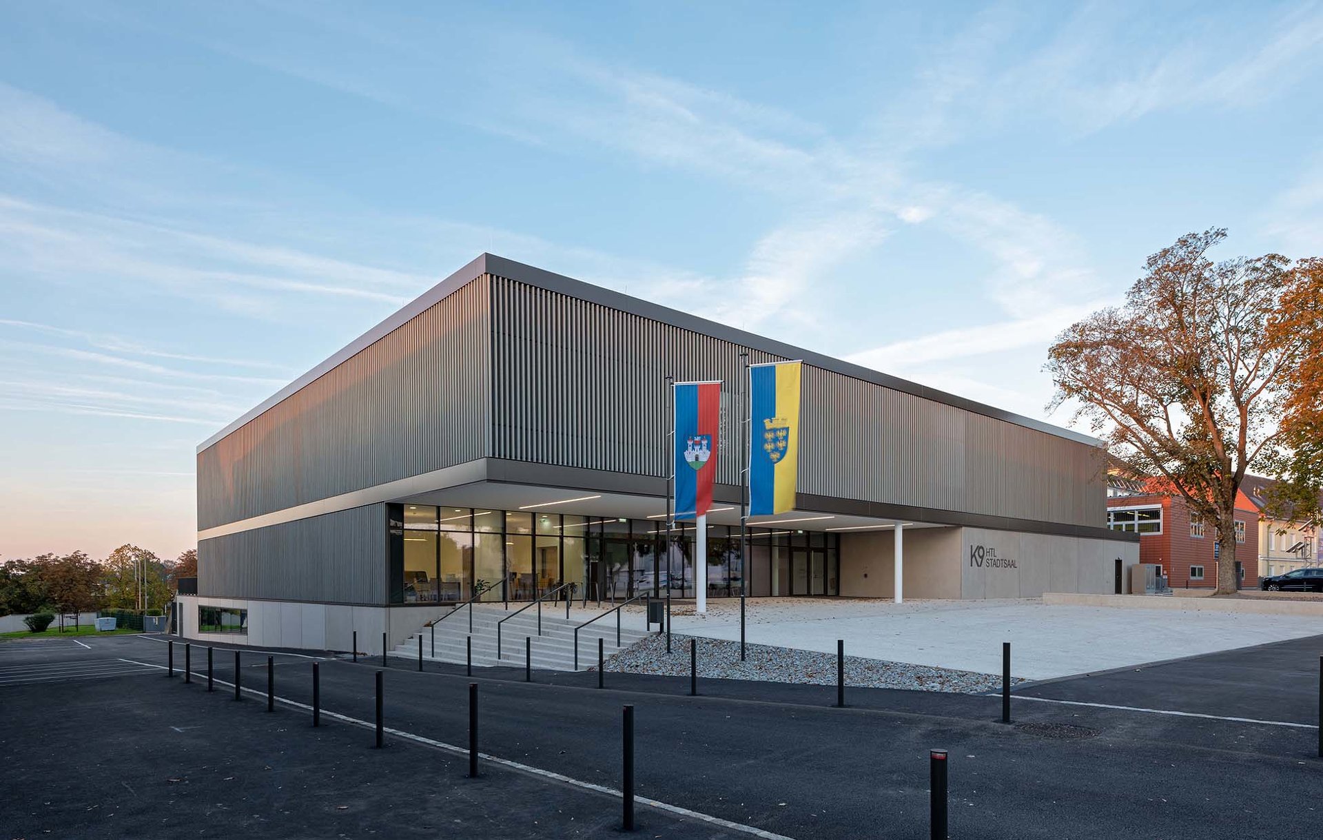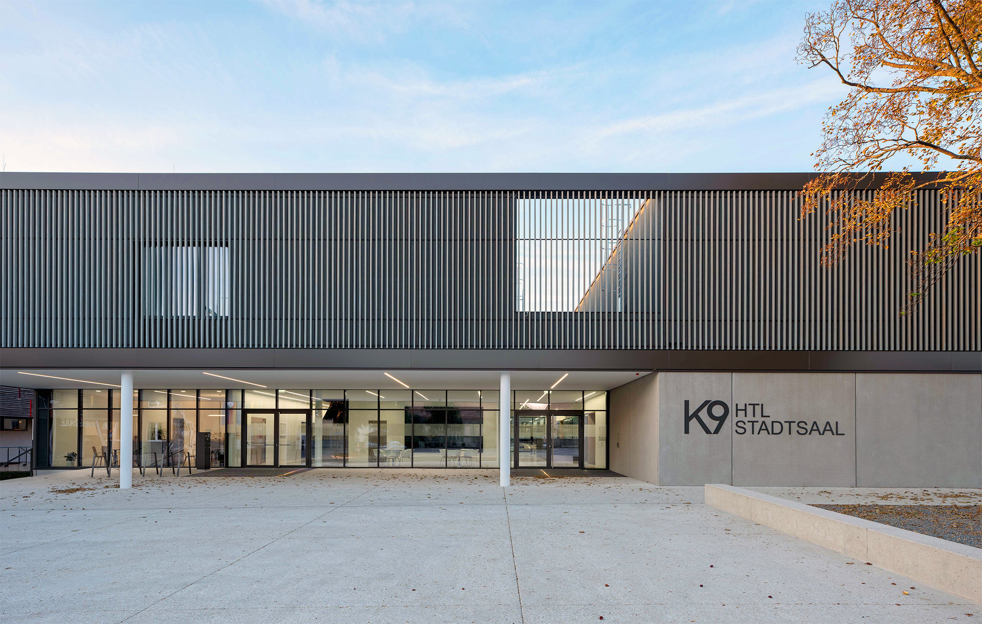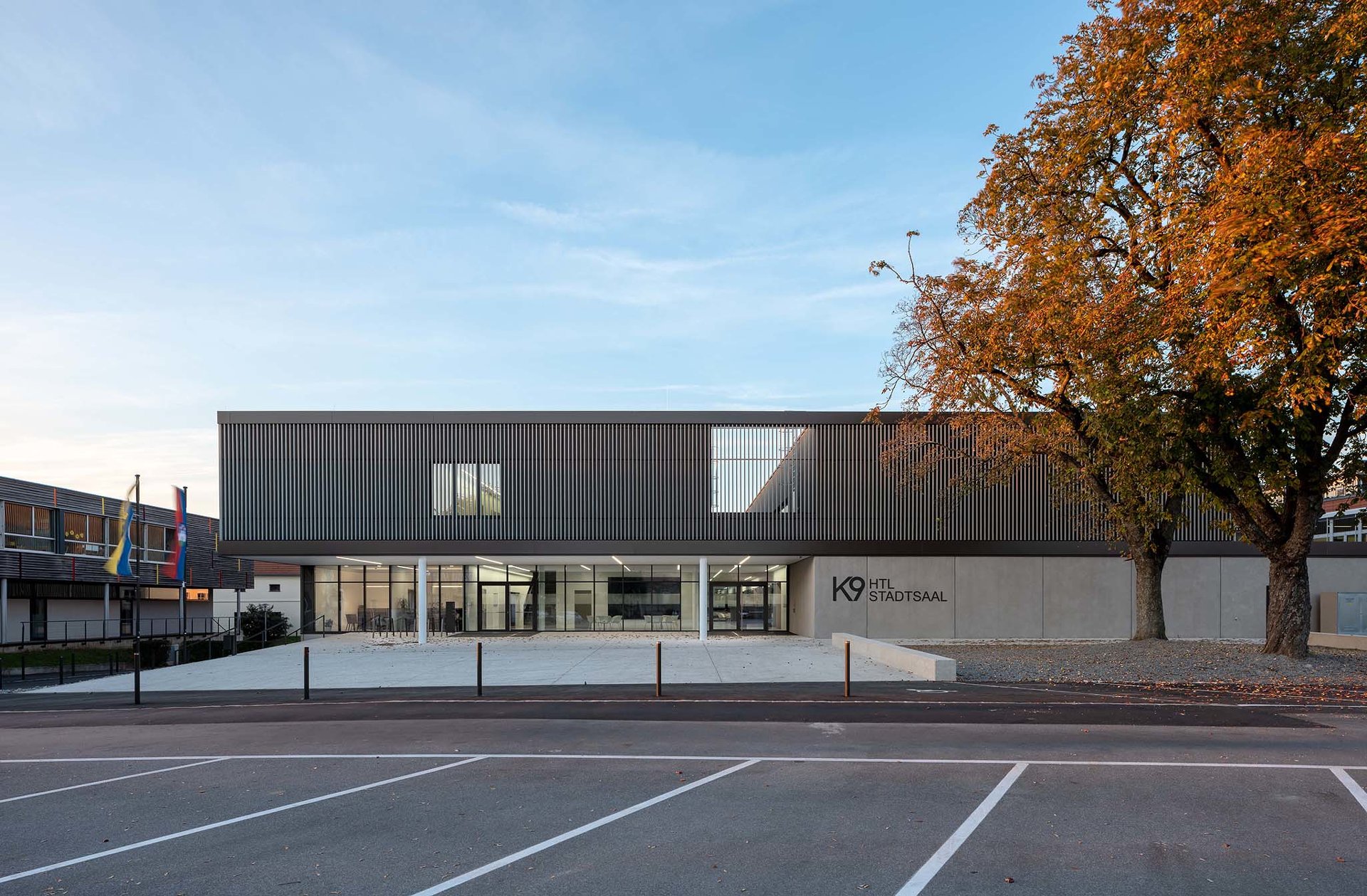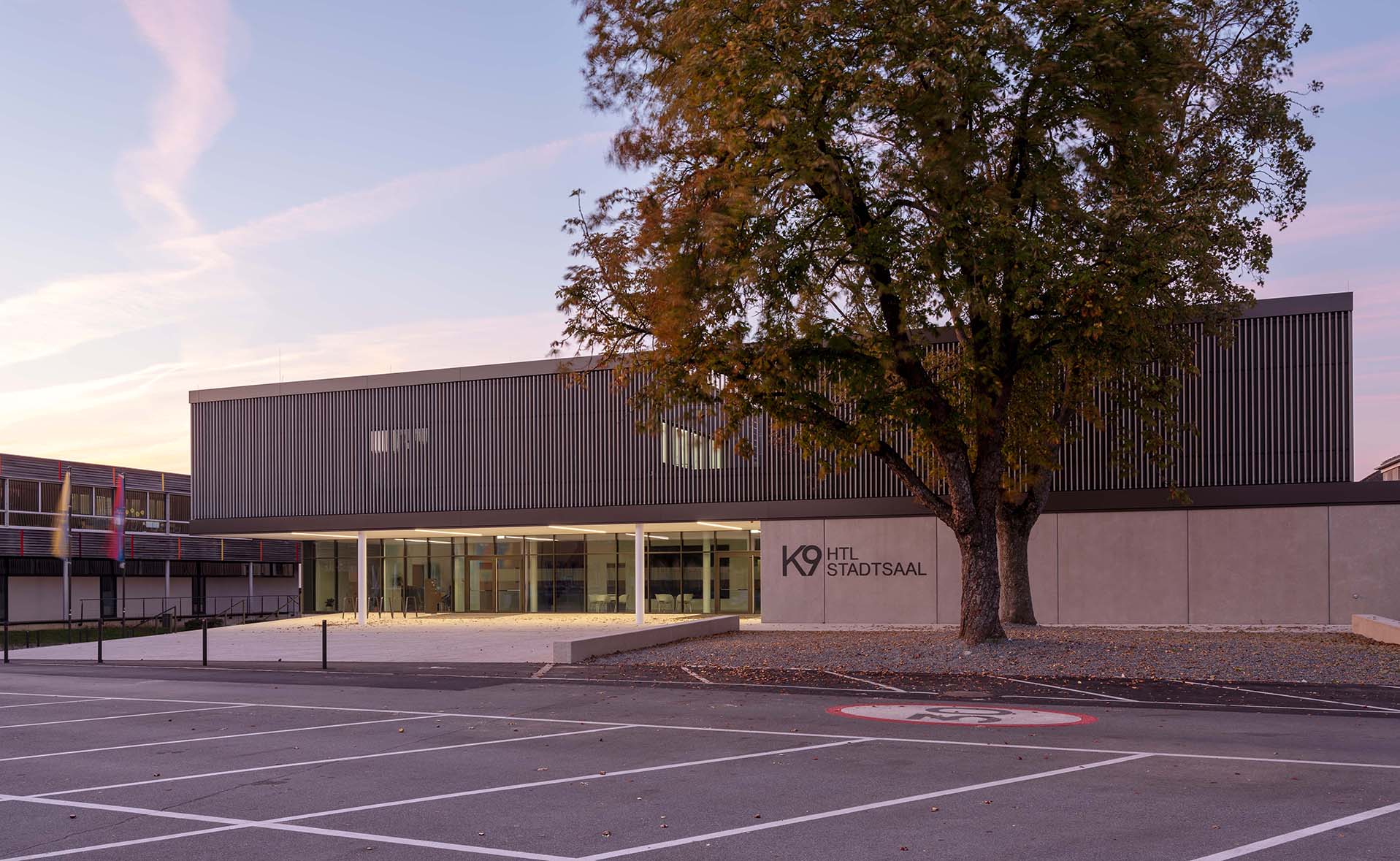 „K9“ vereint Kultur, Sport und Bildung unter einem Dach. K steht Kultur und Kommunikation, die Zahl 9 für die neun Ortsteile von Zistersdorf. Der städtebaulich überzeugende, platzbildende Baukörper mit seiner umlaufenden Lamellenfassade aus thermobehandelter Fichte (mit Vorvergrauungsanstrich) harmonisiert mit der Umgebung und bindet die mannigfaltigen Funktionen in seinem Inneren zu einem schlüssigen Ganzen zusammen. In besonders sorgfältiger Ausführungsqualität überzeugt die Architektur (EG: Beton, OG: Holzbau) in ihrer räumlichen Klarheit sowie in ihrer ebenso reduzierten wie präzisen Materialität. (Text: Jurytext Holzbaupreis Niederösterreich 2019)