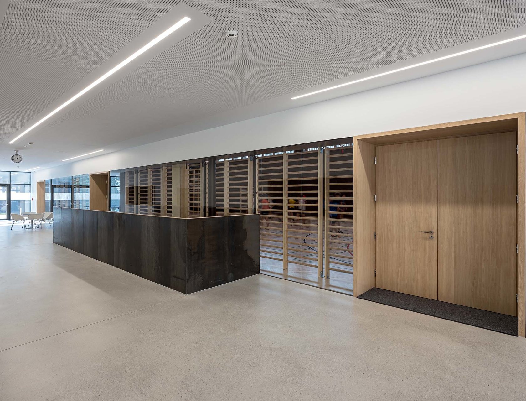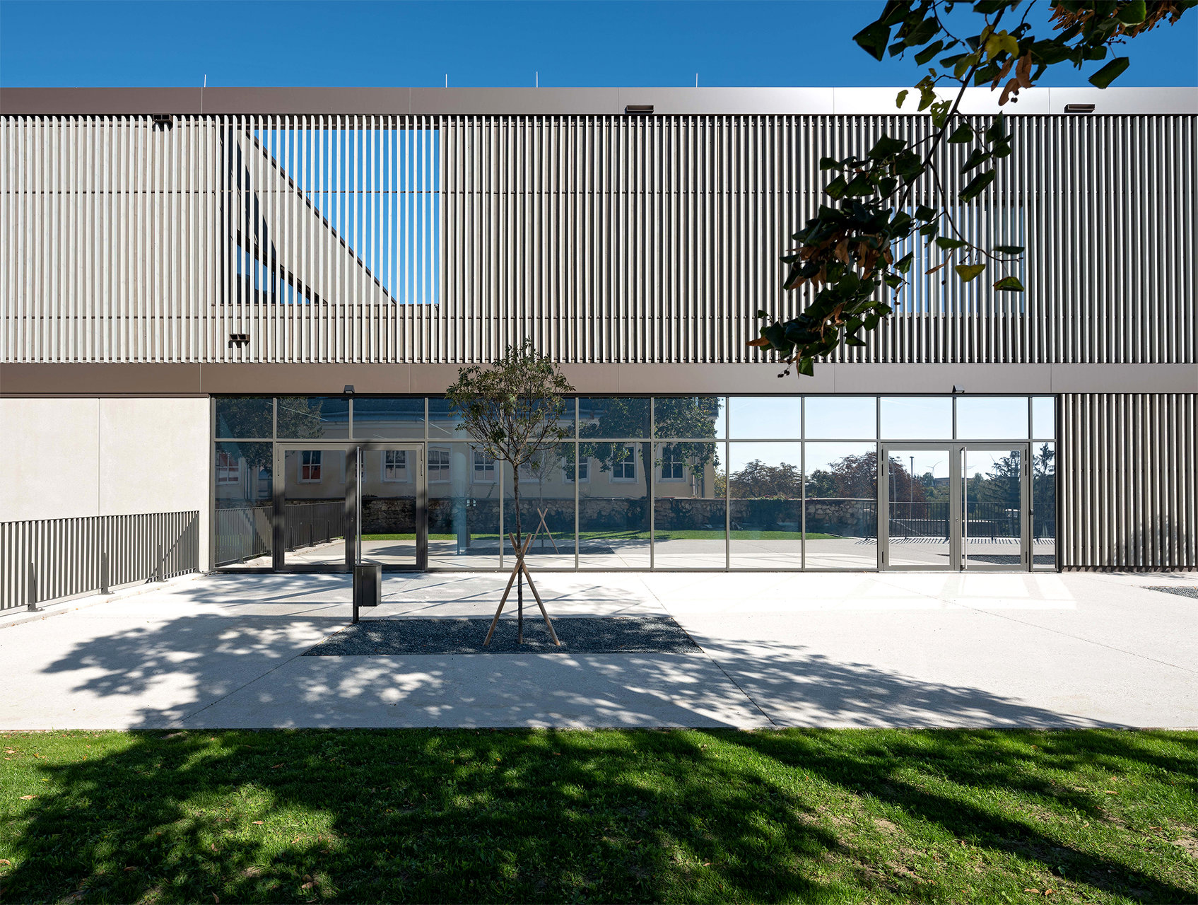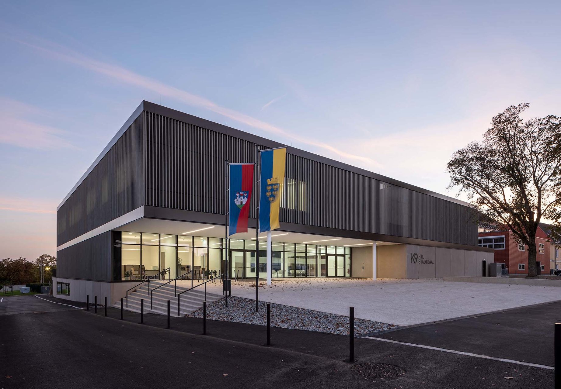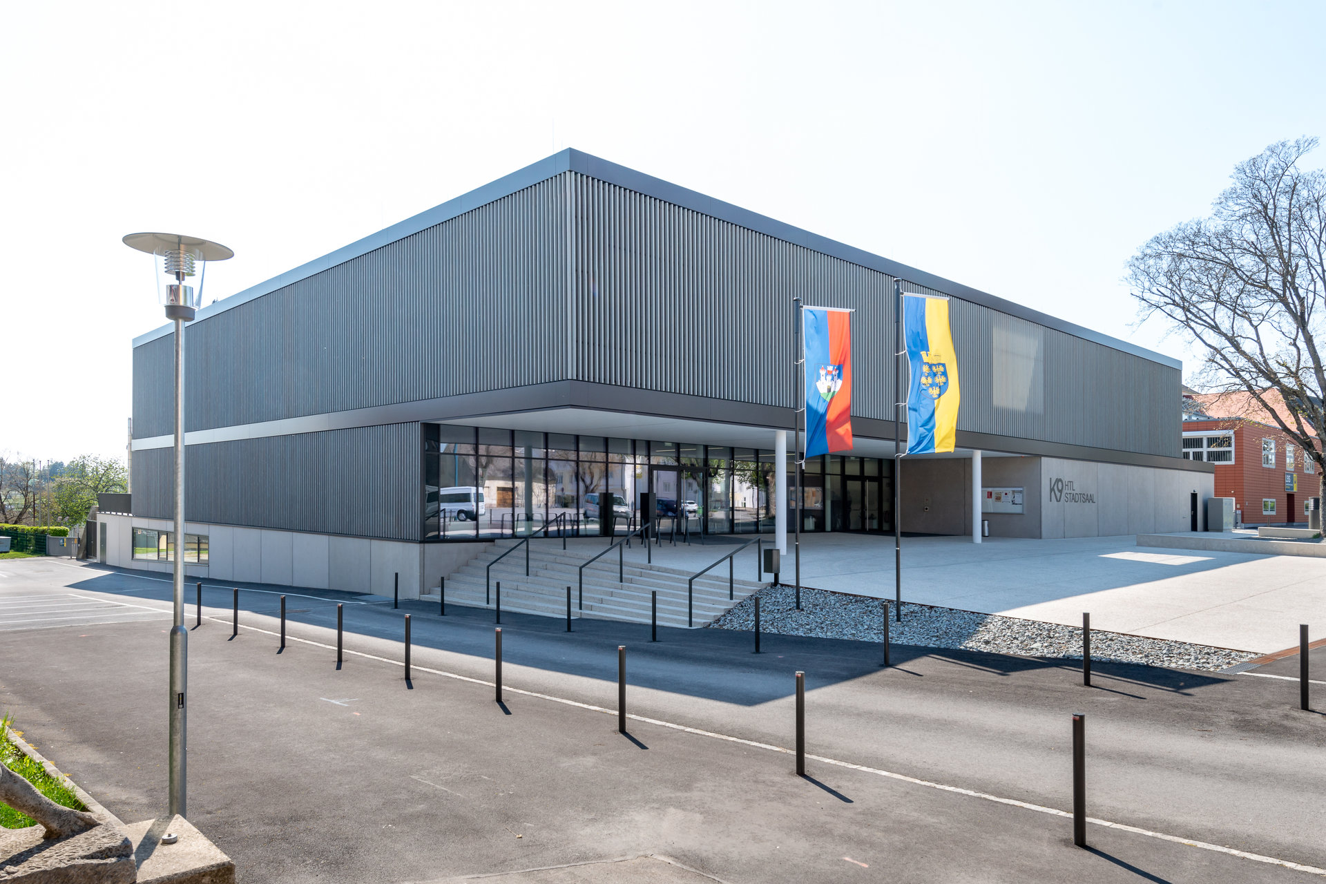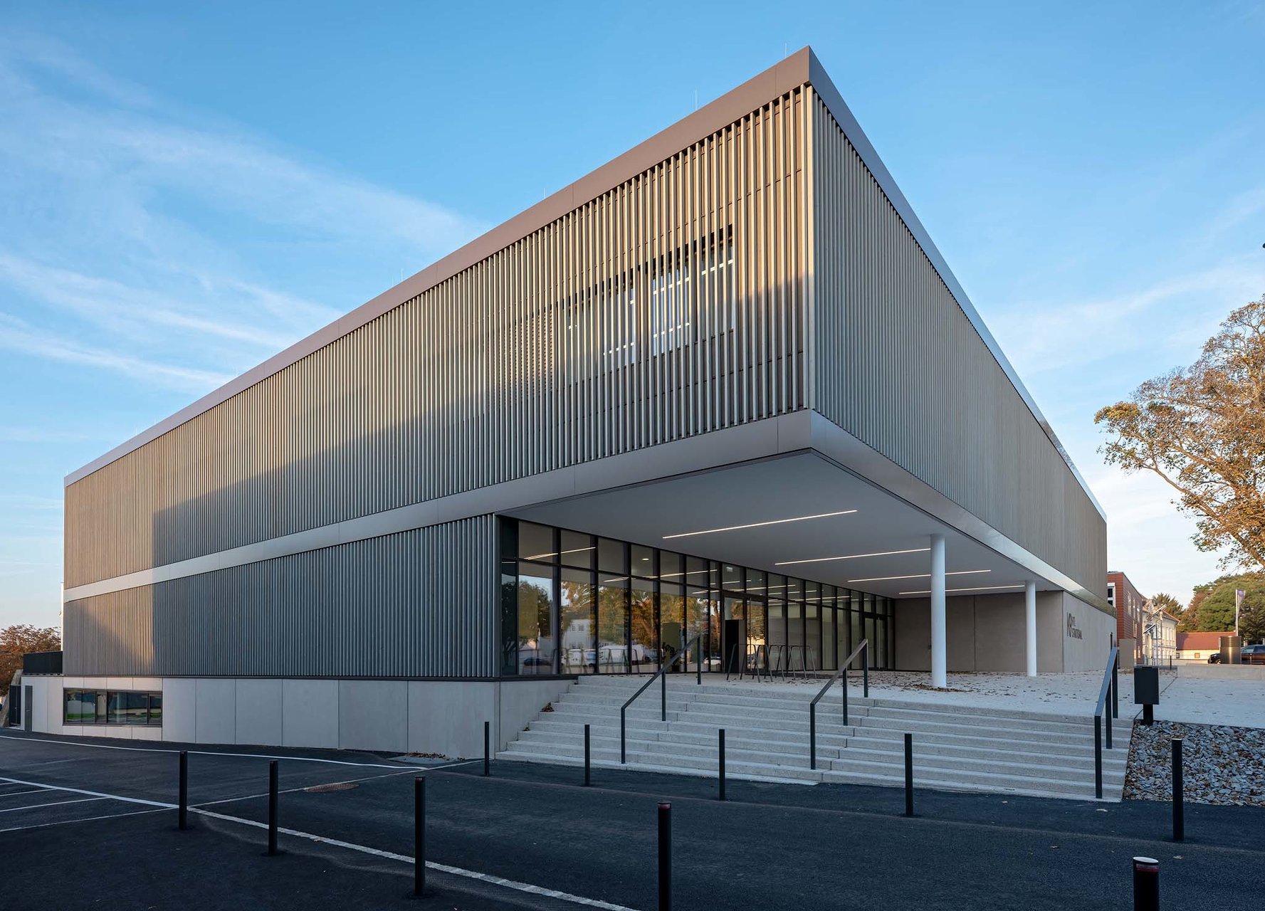 „K9“ vereint Kultur, Sport und Bildung unter einem Dach. K steht Kultur und Kommunikation, die Zahl 9 für die neun Ortsteile von Zistersdorf. Der städtebaulich überzeugende, platzbildende Baukörper mit seiner umlaufenden Lamellenfassade aus thermobehandelter Fichte (mit Vorvergrauungsanstrich) harmonisiert mit der Umgebung und bindet die mannigfaltigen Funktionen in seinem Inneren zu einem schlüssigen Ganzen zusammen. In besonders sorgfältiger Ausführungsqualität überzeugt die Architektur (EG: Beton, OG: Holzbau) in ihrer räumlichen Klarheit sowie in ihrer ebenso reduzierten wie präzisen Materialität. (Text: Jurytext Holzbaupreis Niederösterreich 2019)