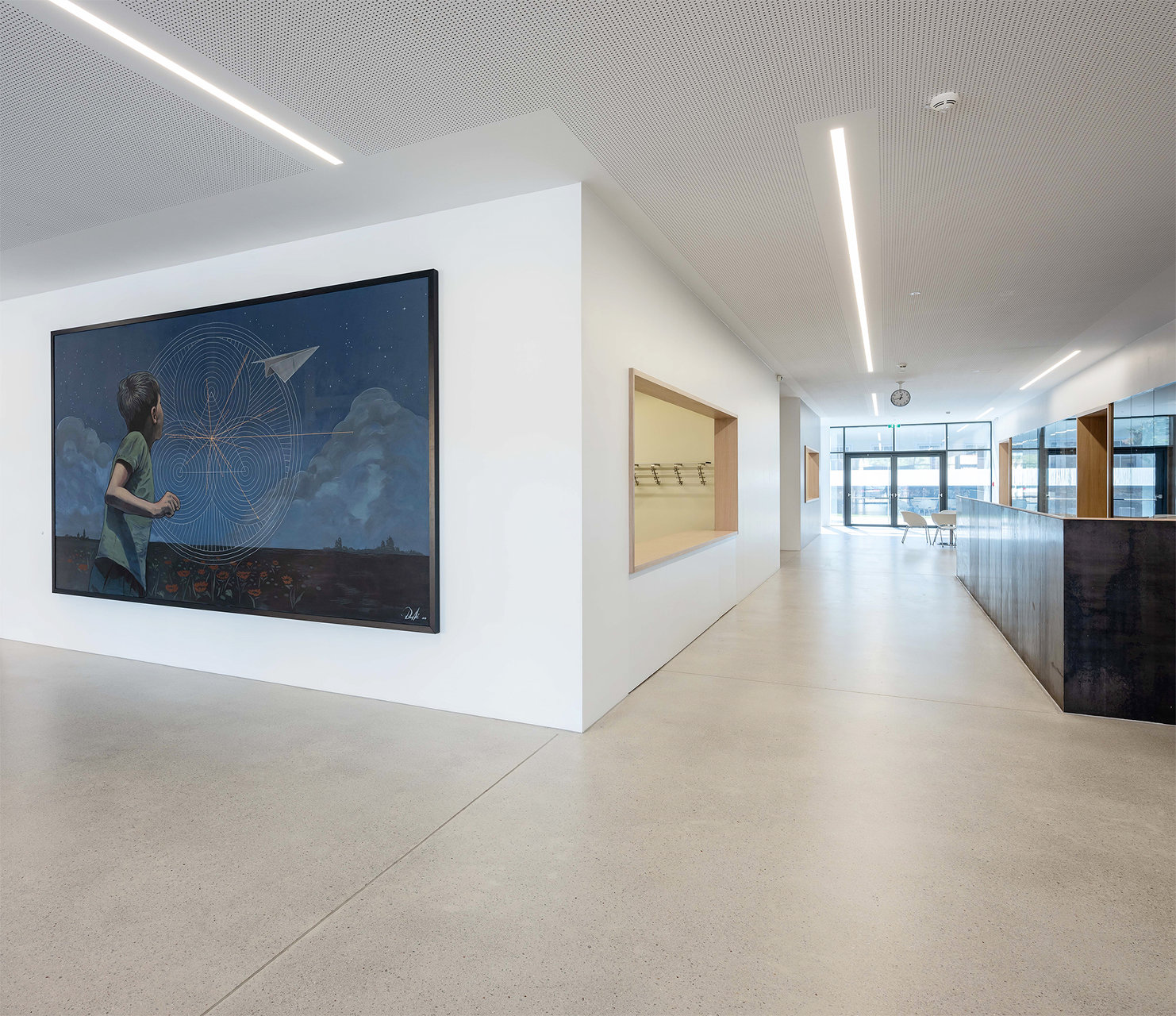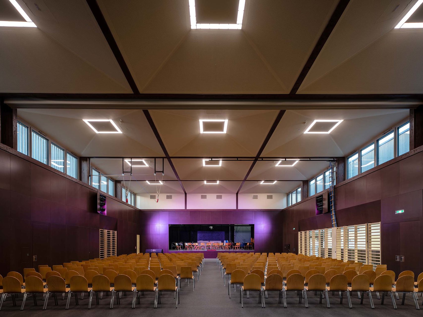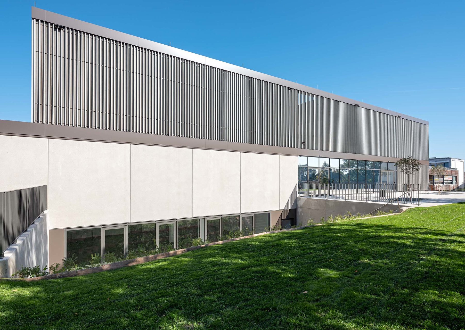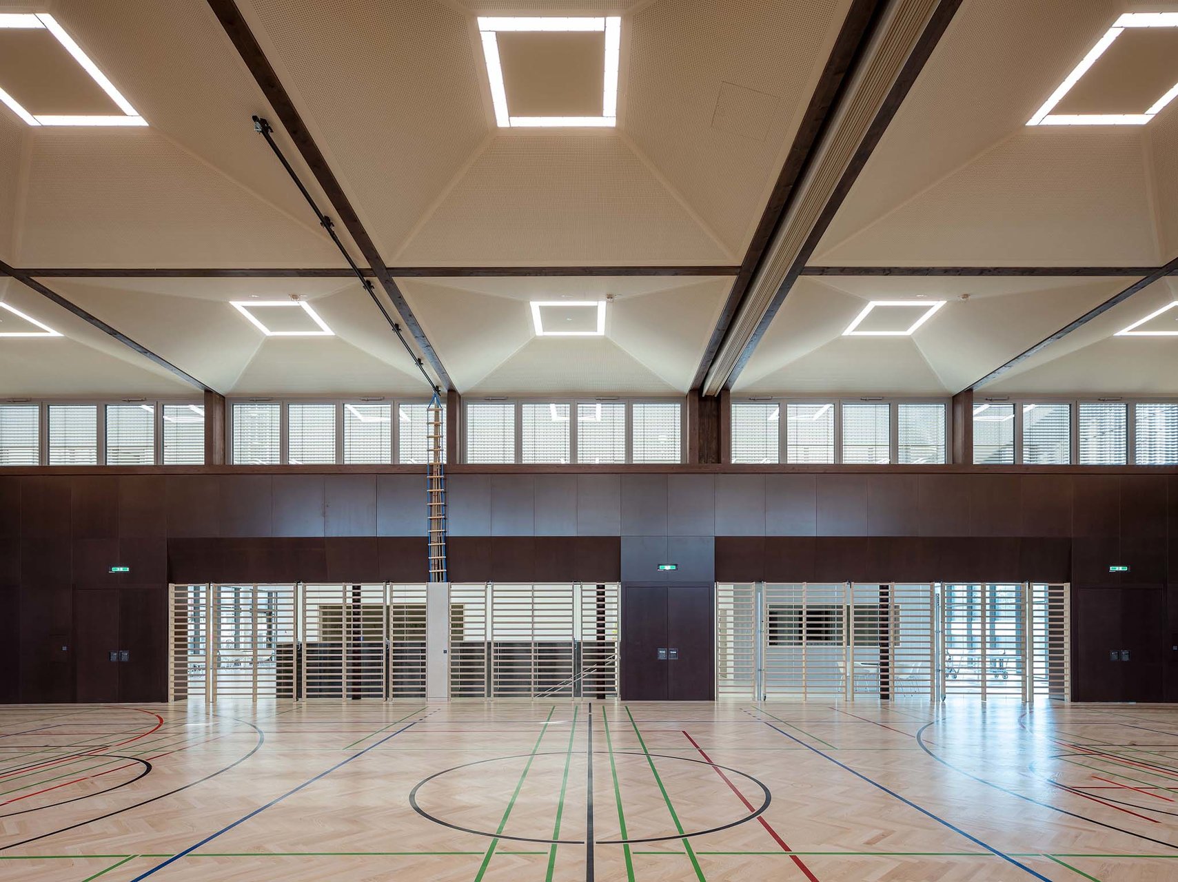 „K9“ vereint Kultur, Sport und Bildung unter einem Dach. K steht Kultur und Kommunikation, die Zahl 9 für die neun Ortsteile von Zistersdorf. Der städtebaulich überzeugende, platzbildende Baukörper mit seiner umlaufenden Lamellenfassade aus thermobehandelter Fichte (mit Vorvergrauungsanstrich) harmonisiert mit der Umgebung und bindet die mannigfaltigen Funktionen in seinem Inneren zu einem schlüssigen Ganzen zusammen. In besonders sorgfältiger Ausführungsqualität überzeugt die Architektur (EG: Beton, OG: Holzbau) in ihrer räumlichen Klarheit sowie in ihrer ebenso reduzierten wie präzisen Materialität. (Text: Jurytext Holzbaupreis Niederösterreich 2019)