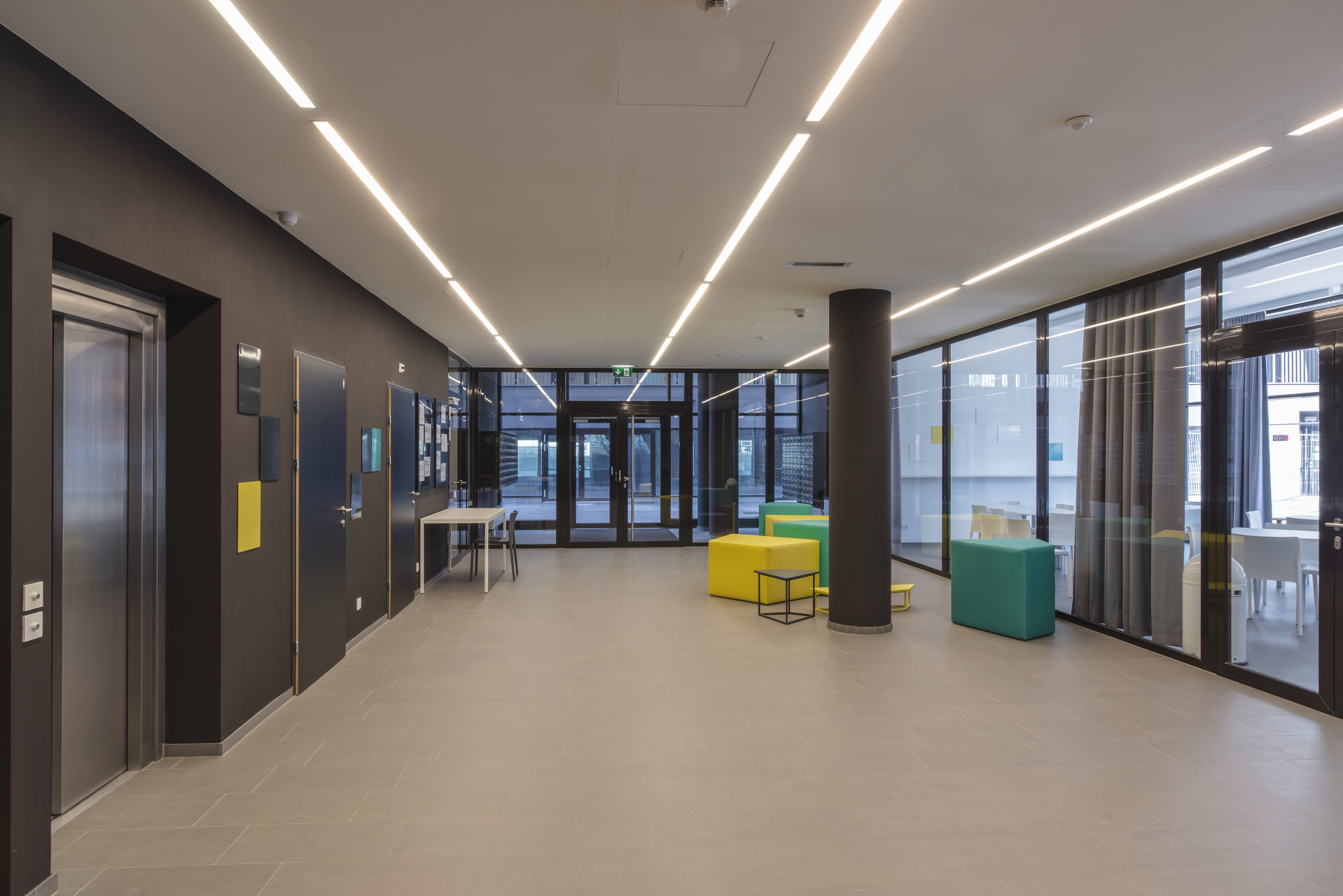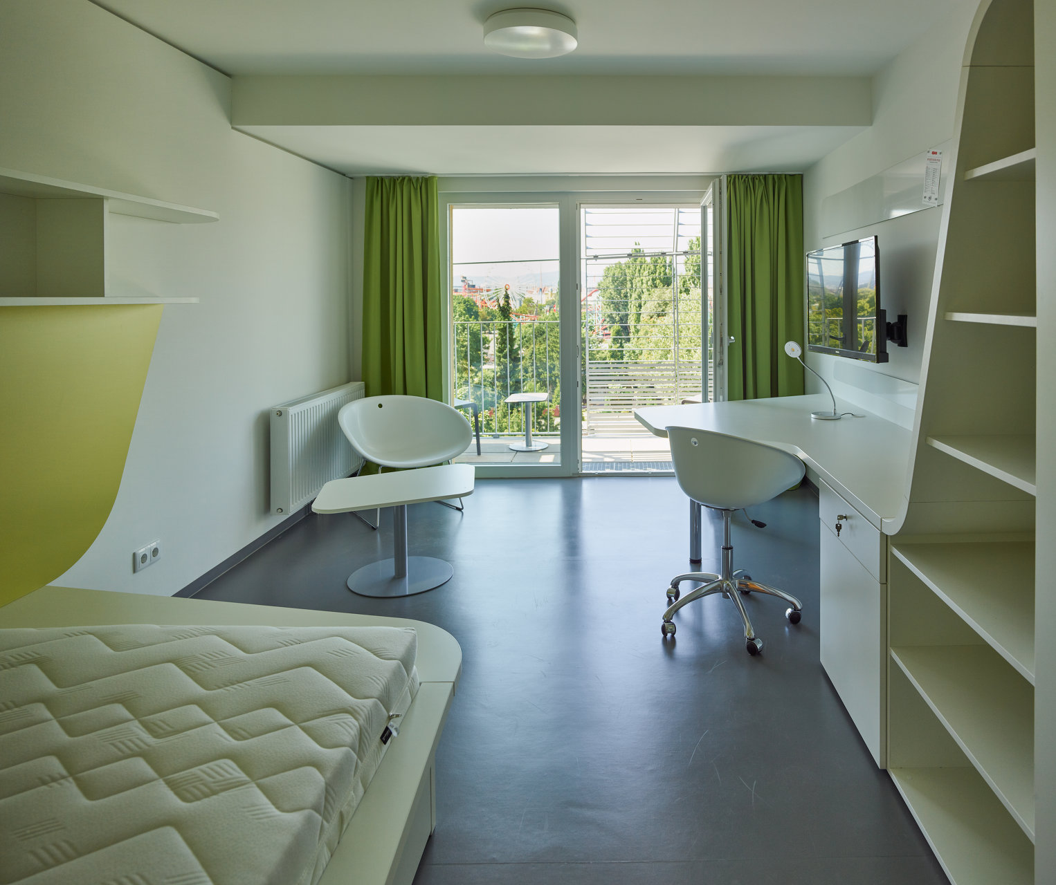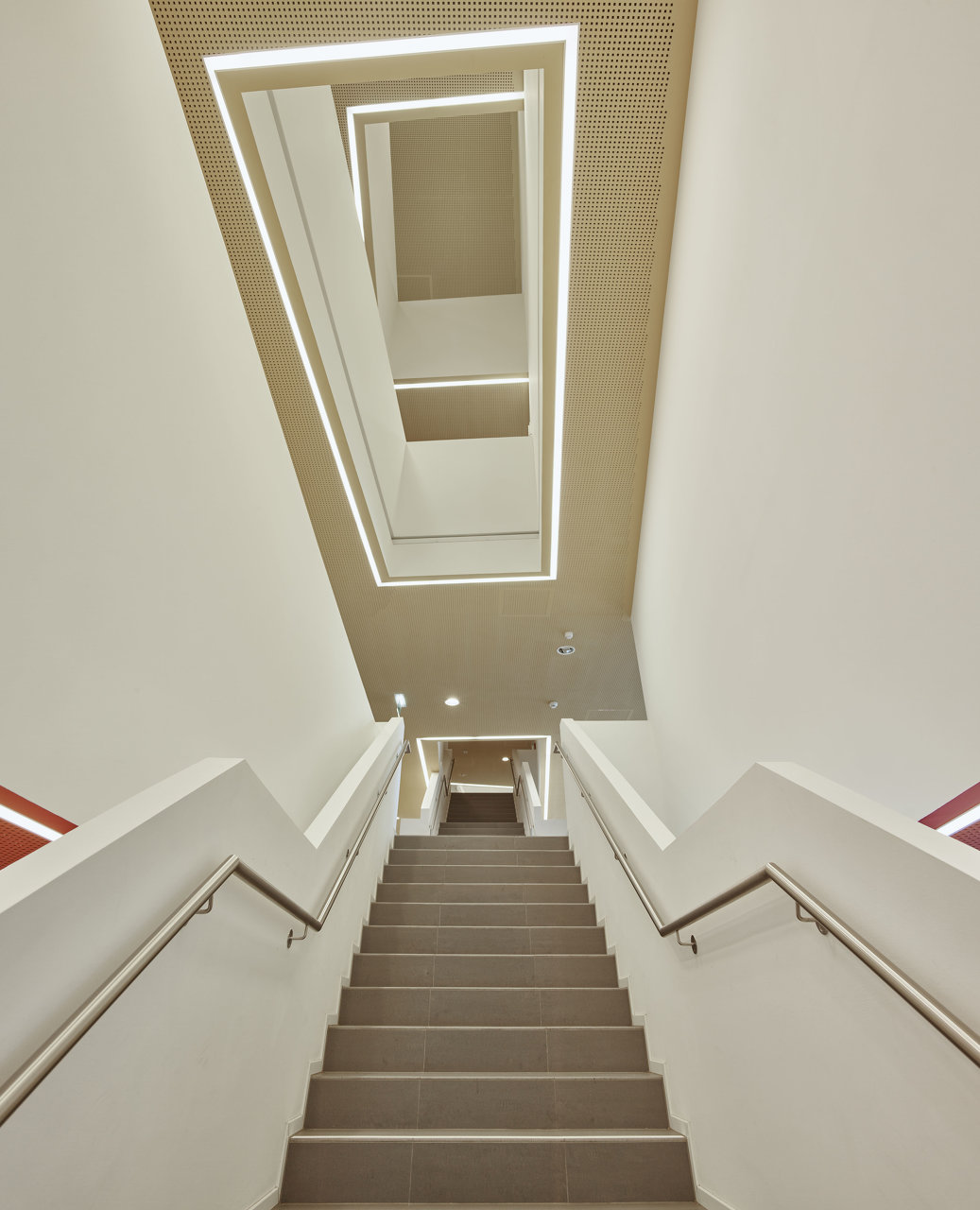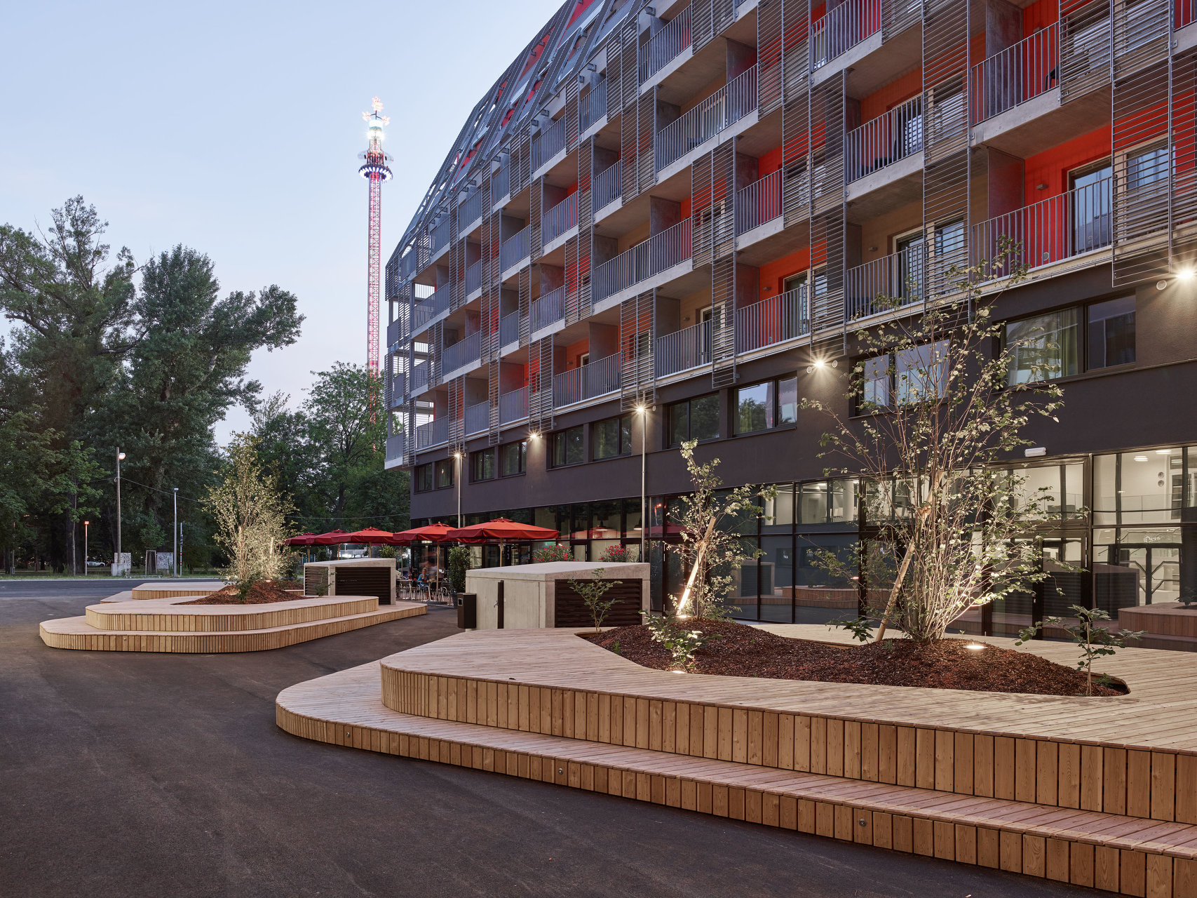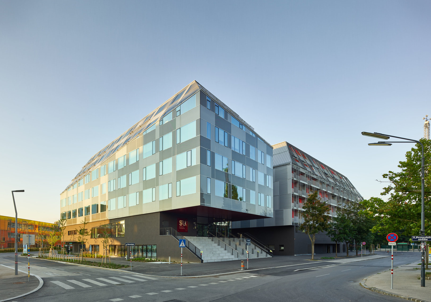 Der durch die Anordnung und Verformung der Baukörper entstandene Innenhof birgt ein besonders Potential für einen kommunikativen Aufenthaltsort aller drei Nutzungen. Mit dem Prater im Blickfeld wird der nach Süden ausgerichtete Hof des neuen Campus zum urbanen „Salon“. (Text: Architektin)