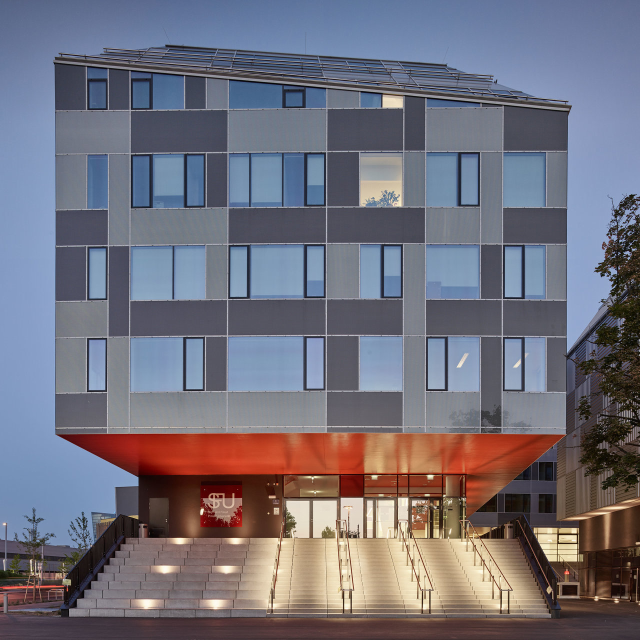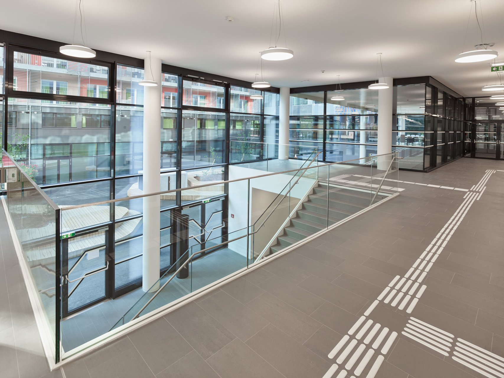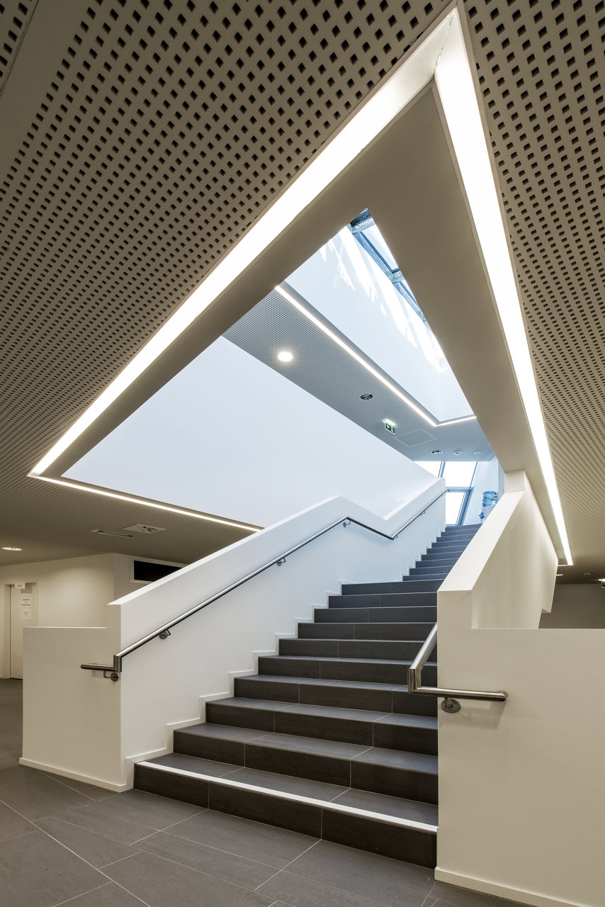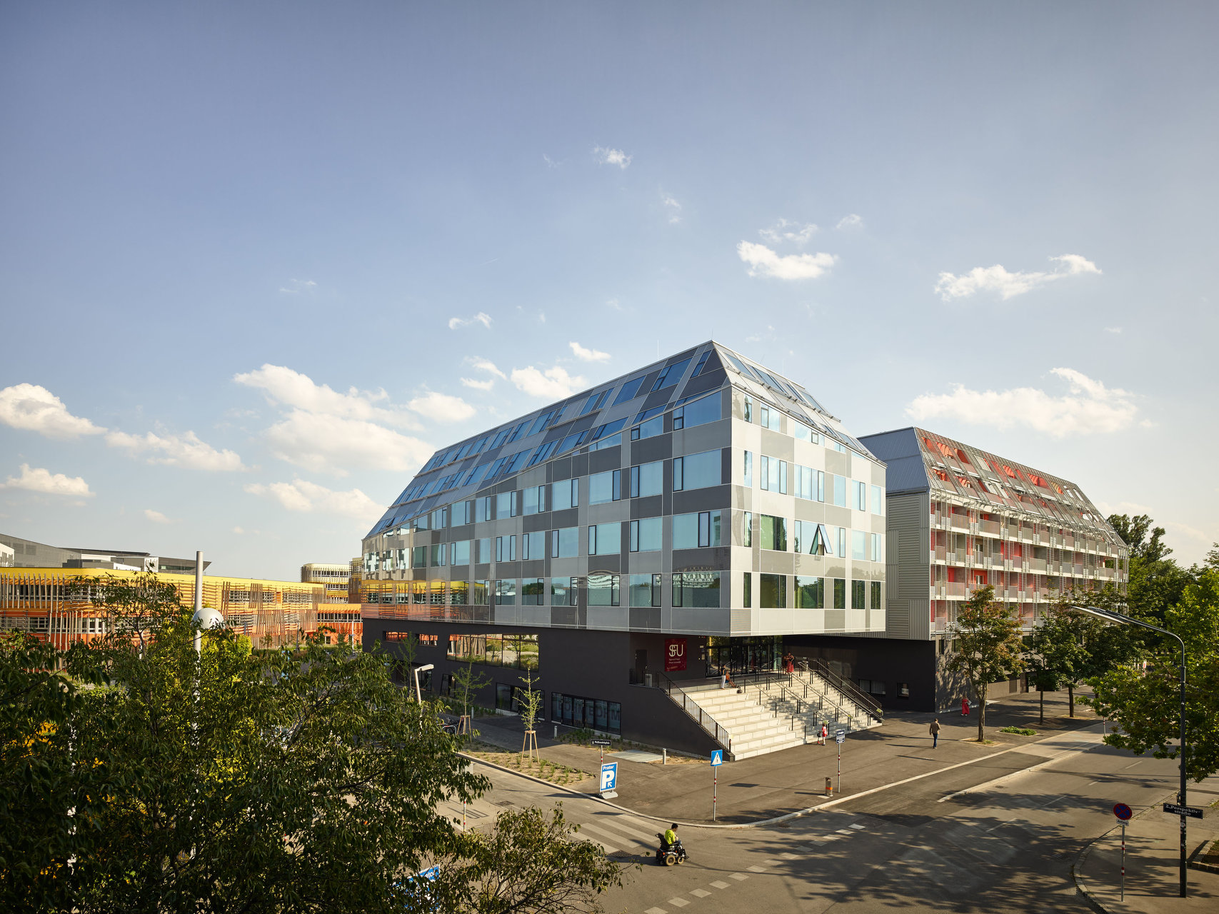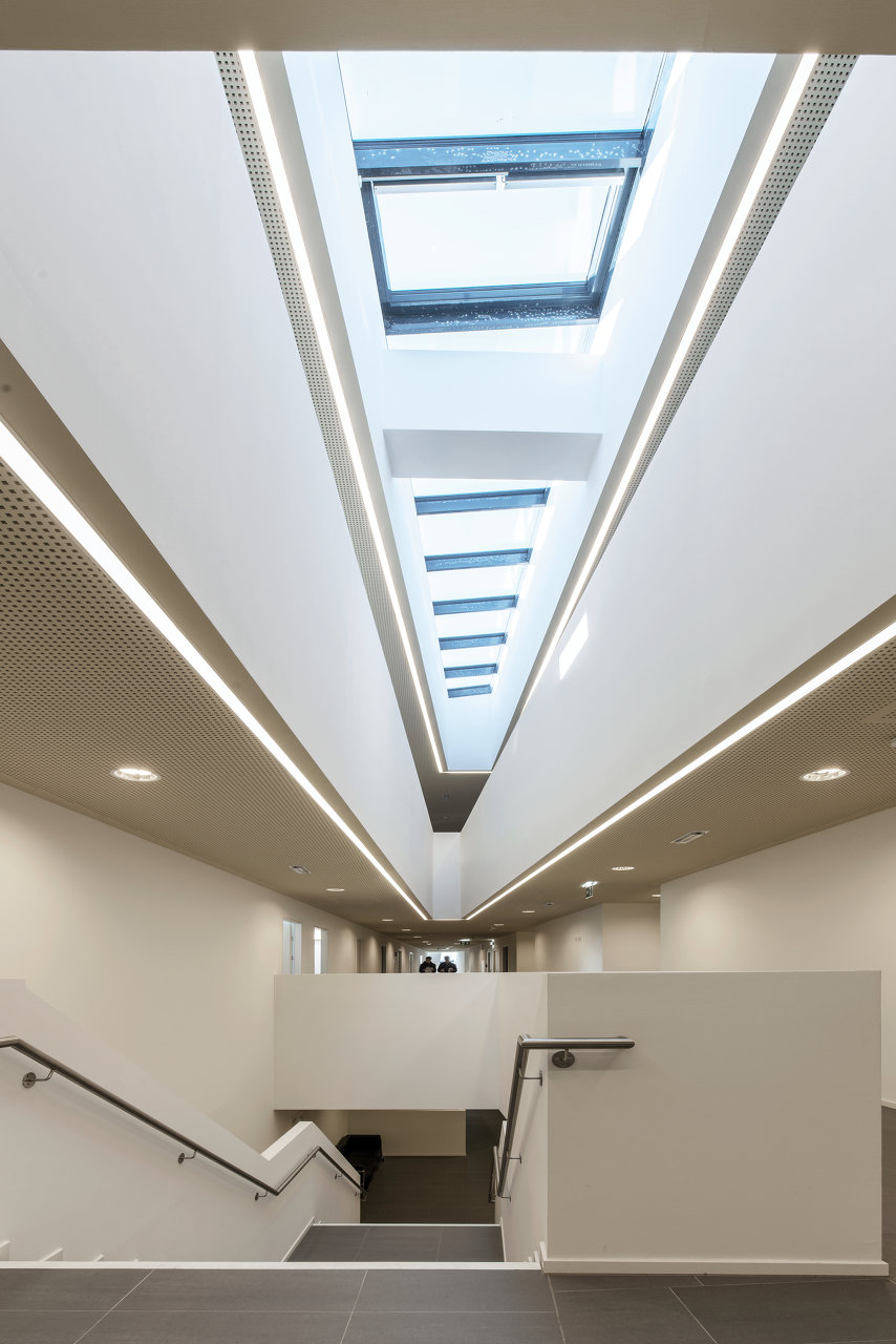 Stadträumlich hält die markante, schräg umlaufende Traufkante die drei Gebäudeteile zusammen. Gemeinsam ist den drei Bauten auch eine zweigeschossige Sockelzone, in die vielfältige Angebote für öffentliche und halböffentliche Nutzungen, sowohl im Innen- als auch im Außenraum integriert sind.