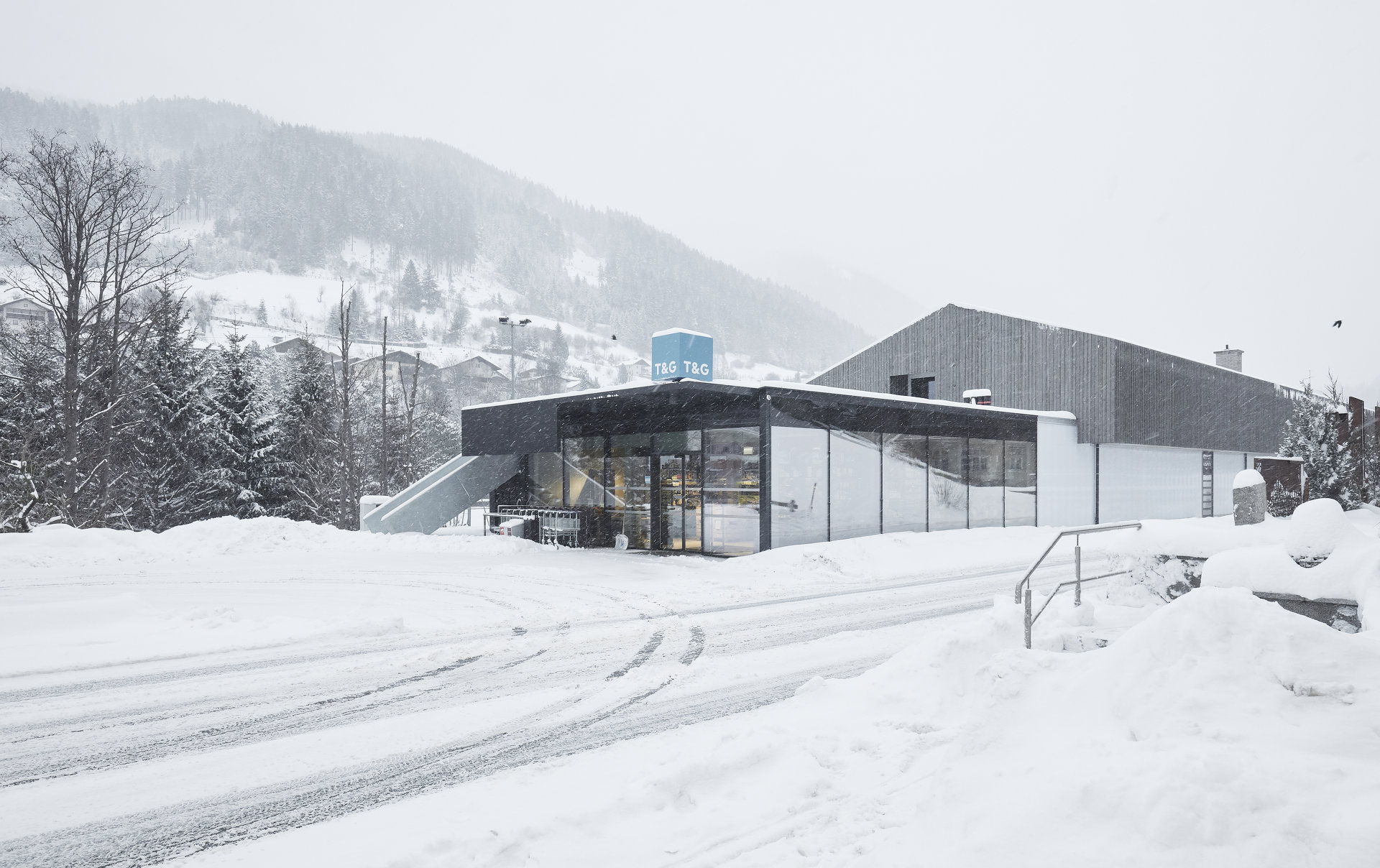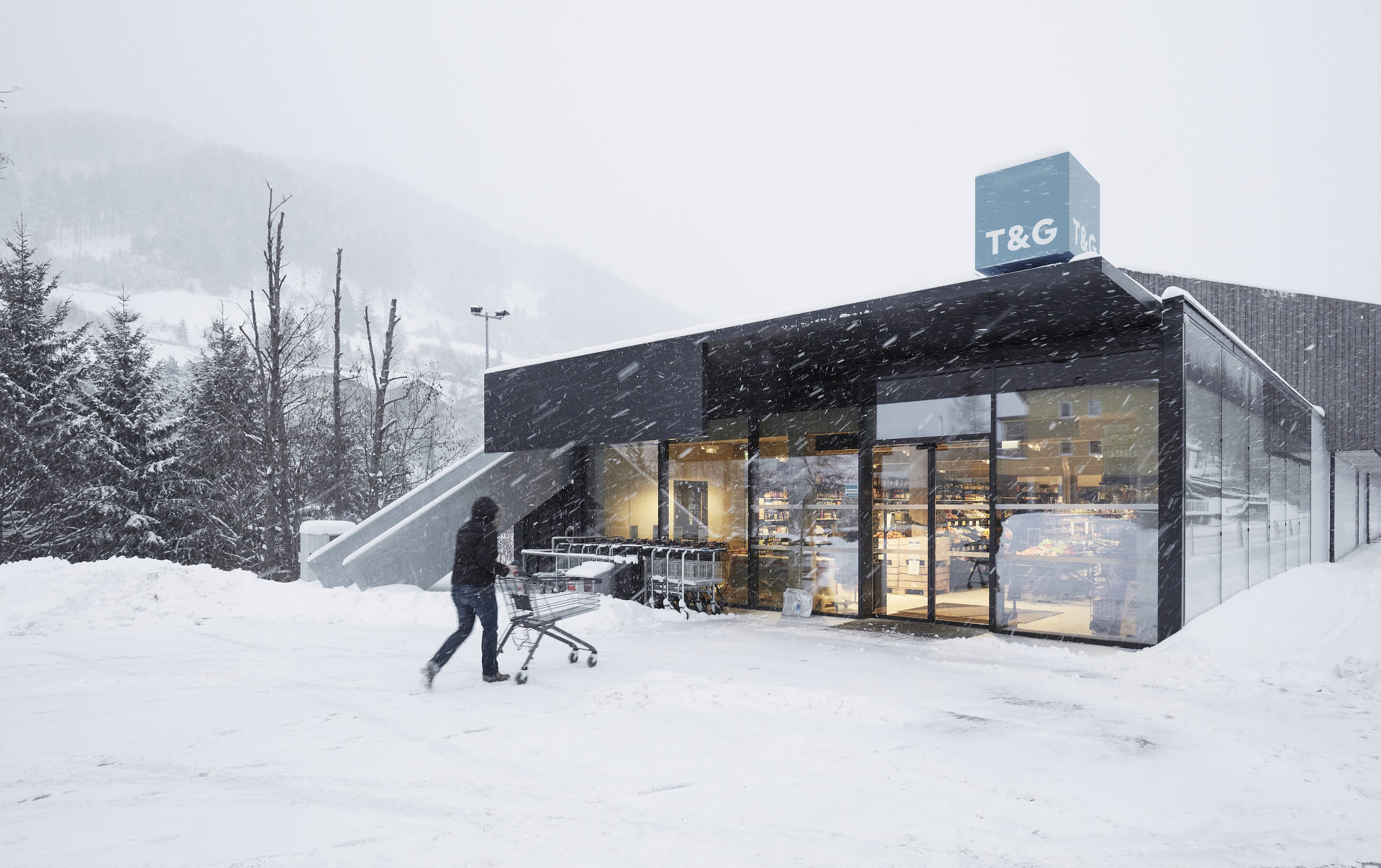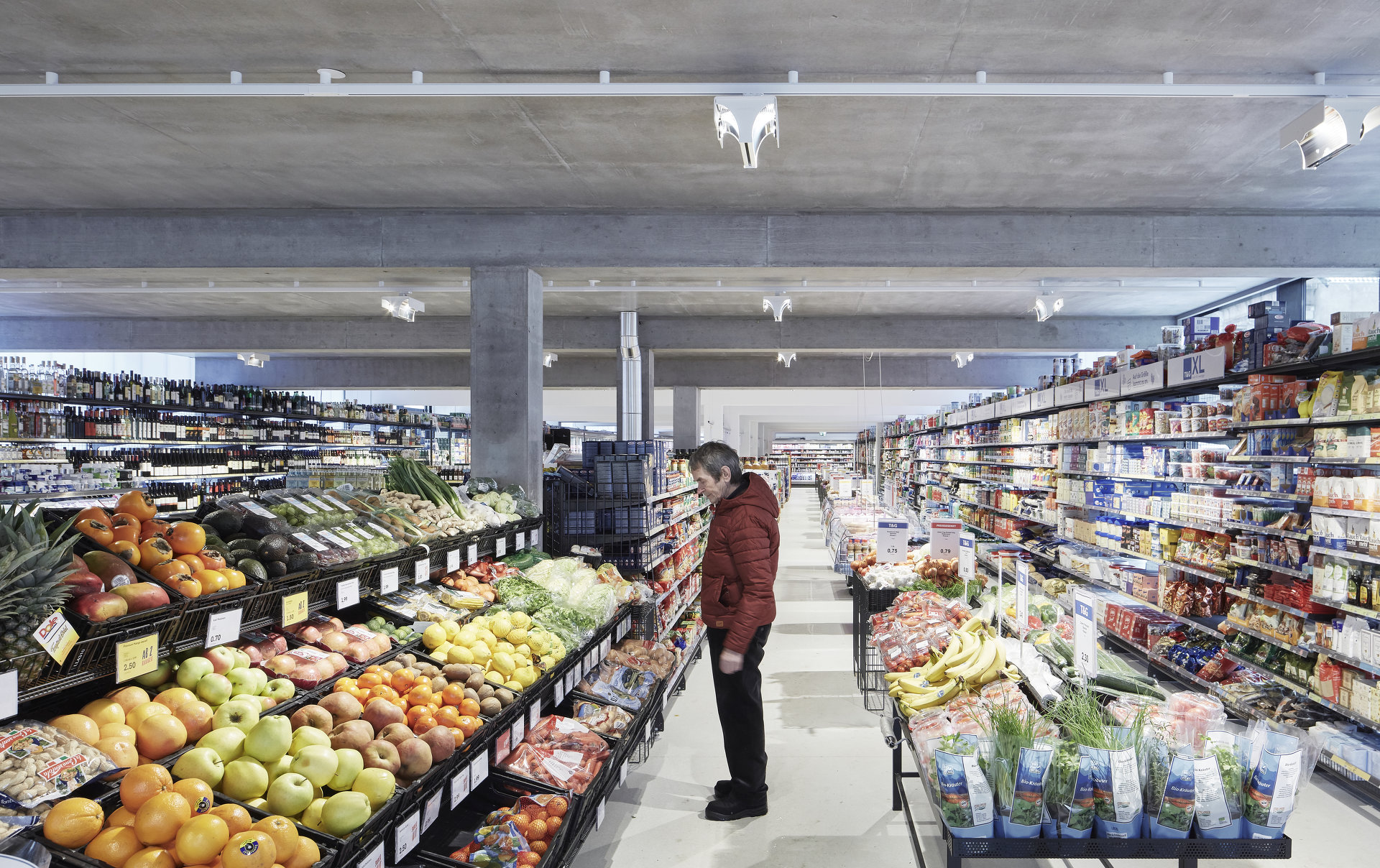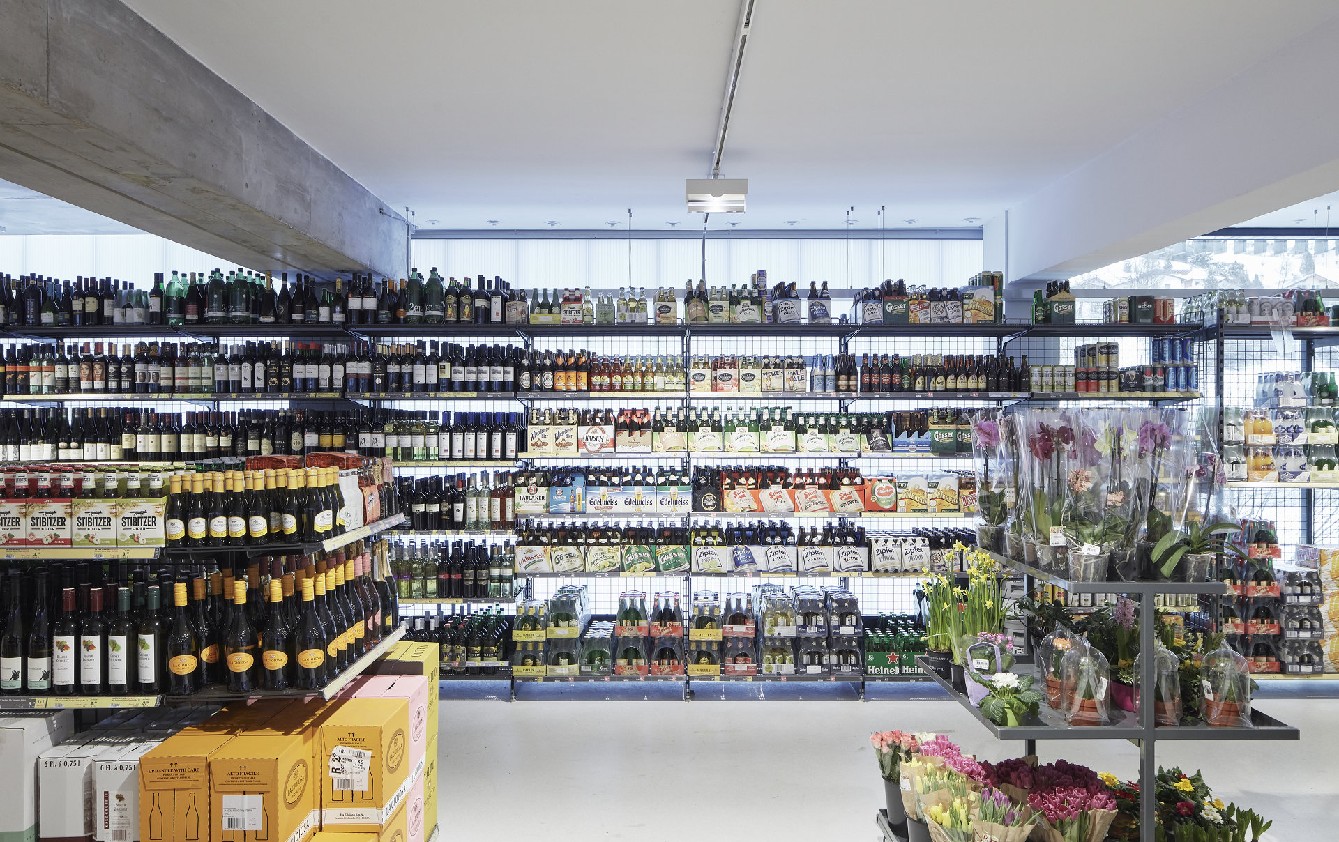 Der Supermarkt im Erdgeschoss wurde im bestehenden Gebäuderaster in Beton- und Holzbauweise erweitert und die Konstruktion innen auf Sicht belassen. Neubau wie Altbestand wurden mit einer thermisch aktiven Polycarbonat- und Glasfassade eingehüllt, bestehende Gebäudeöffnungen wurden so alle automatisch zu Fenstern. Für das durch viele Umbaumassnahmen gekennzeichnete Obergeschoss wurde ein „Kleid“ aus Holzlatten geschaffen und einfach darübergestülpt. Klare Aussenkonturen des Baukörpers erscheinen nun durch Reduktion auf das Wesentlich geometrisch einfach und schlicht. Die Hülle aus Holz formt das Gebäude als homogenen, einfachen Baukörper und die 70 m lange Gebäudeflucht entlang des Strassenraums erhält Wirkung. Das Obergeschoss erhielt eine zweite Erschliessung über das Dach des Supermarktes. Die gesamte Sanierung wurde als „Low budget Massnahme durchgeführt“, daher die Devise: KISS (keep it small & simple). (Text: Architektin)
