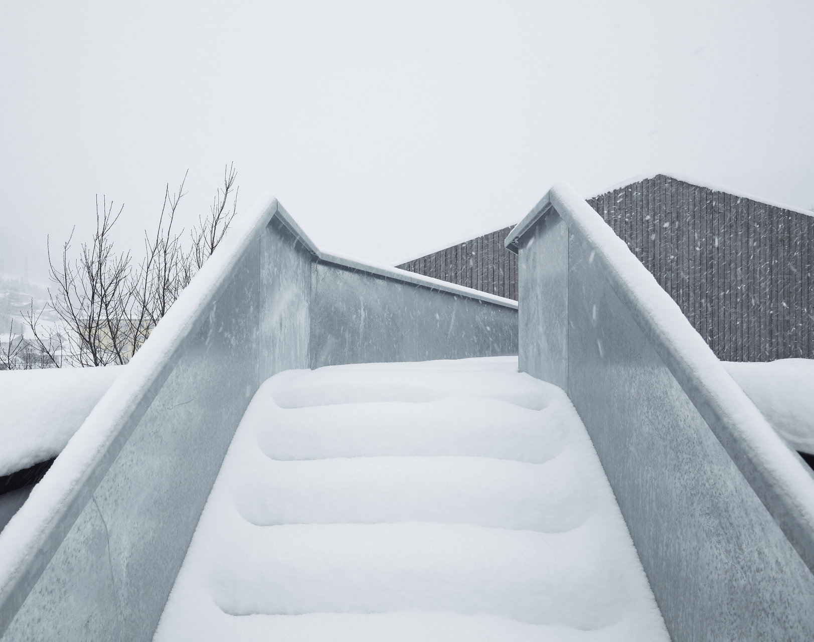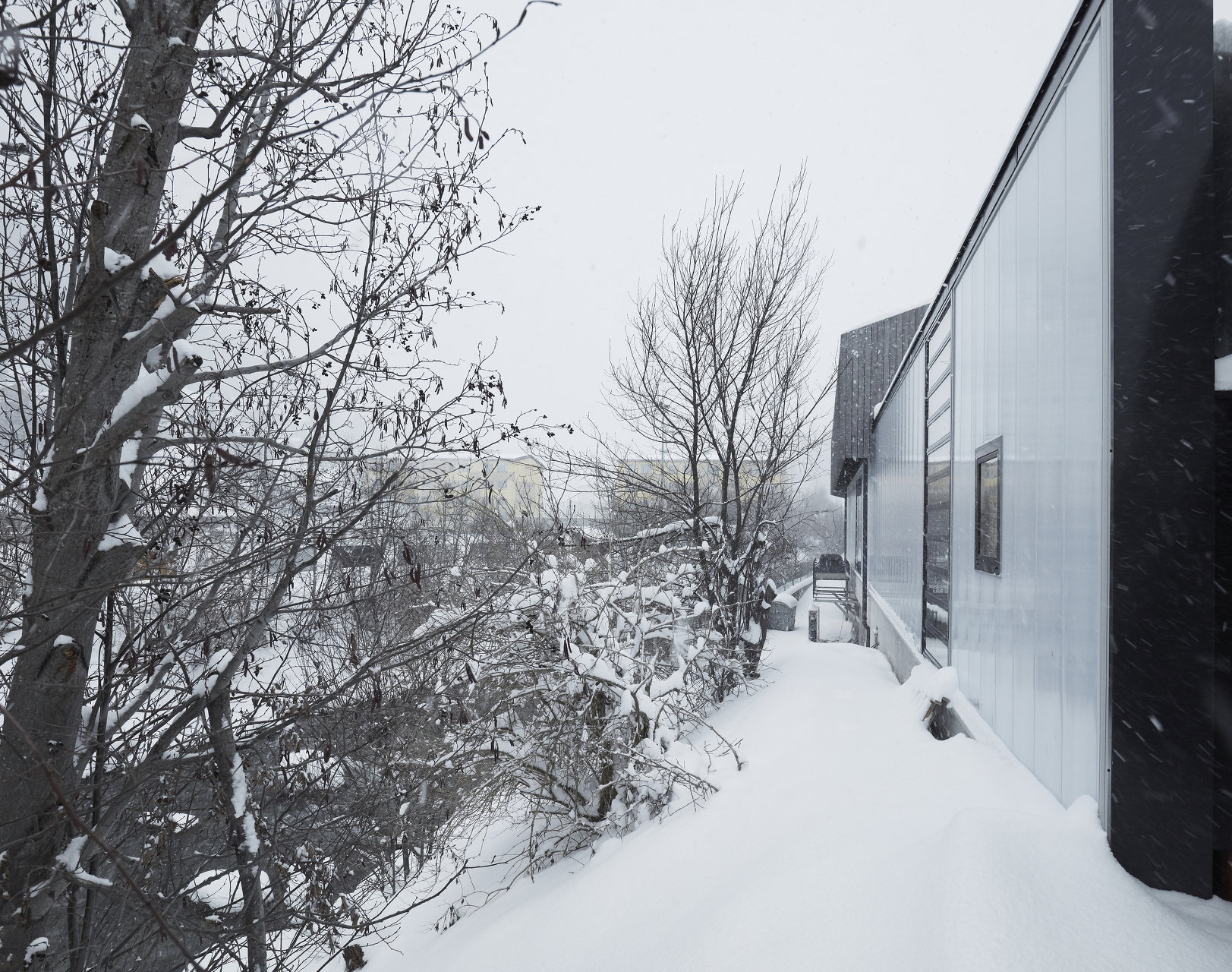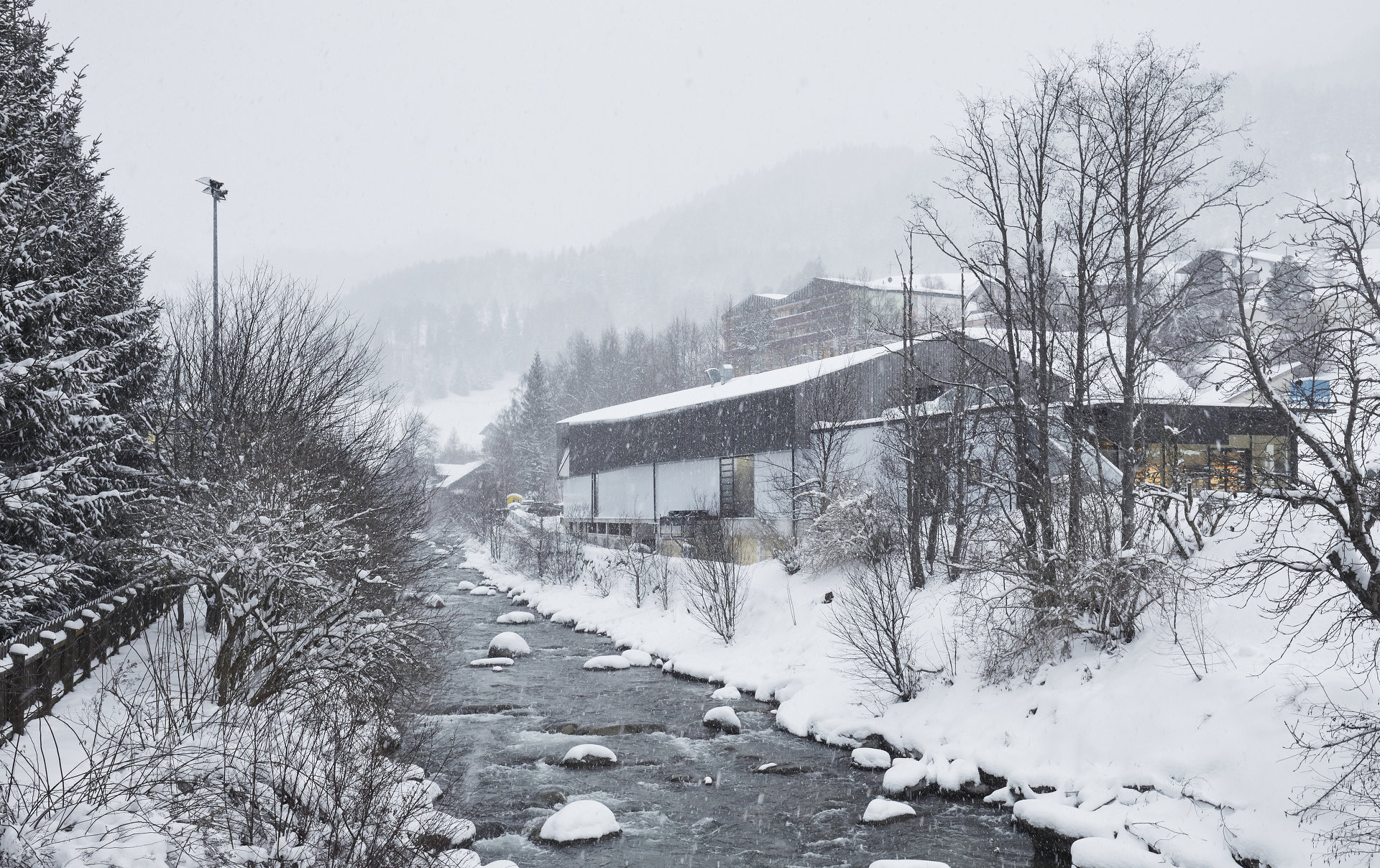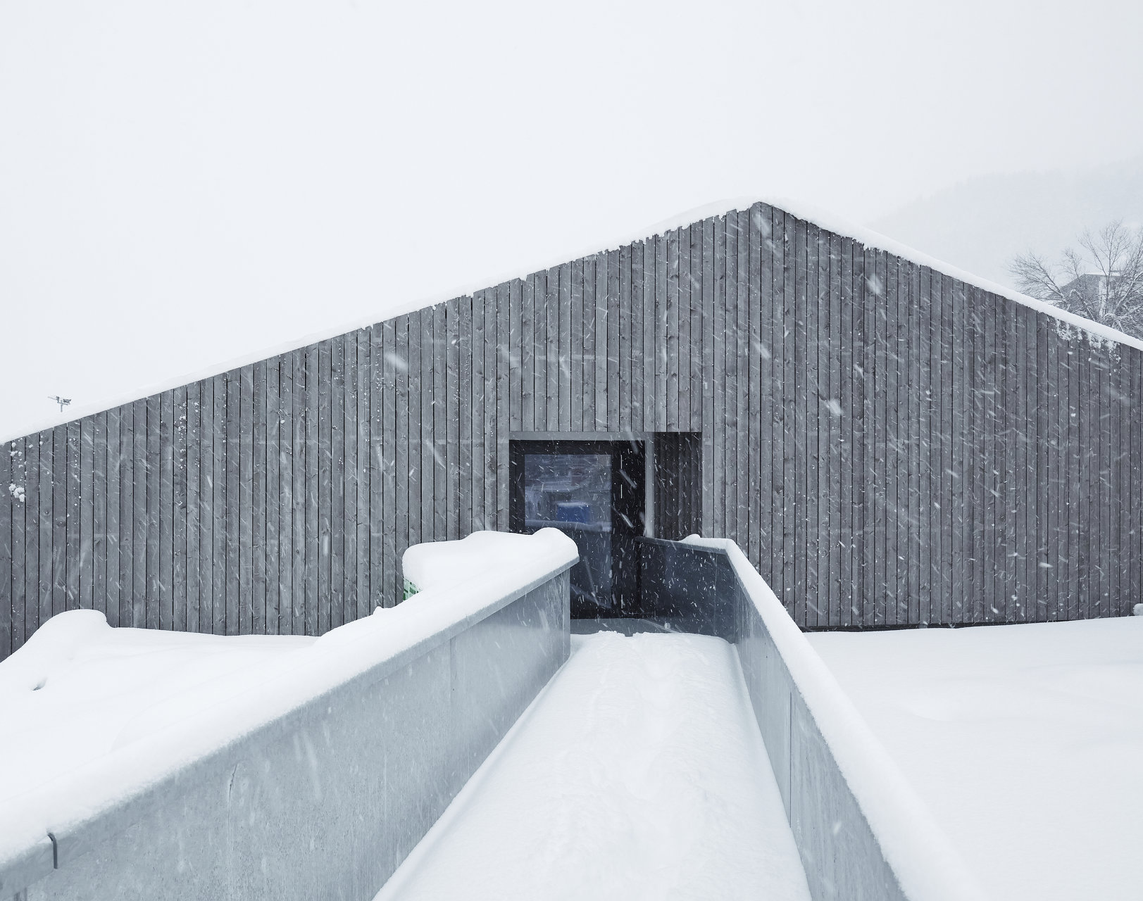 Der Supermarkt im Erdgeschoss wurde im bestehenden Gebäuderaster in Beton- und Holzbauweise erweitert und die Konstruktion innen auf Sicht belassen. Neubau wie Altbestand wurden mit einer thermisch aktiven Polycarbonat- und Glasfassade eingehüllt, bestehende Gebäudeöffnungen wurden so alle automatisch zu Fenstern. Für das durch viele Umbaumassnahmen gekennzeichnete Obergeschoss wurde ein „Kleid“ aus Holzlatten geschaffen und einfach darübergestülpt. Klare Aussenkonturen des Baukörpers erscheinen nun durch Reduktion auf das Wesentlich geometrisch einfach und schlicht. Die Hülle aus Holz formt das Gebäude als homogenen, einfachen Baukörper und die 70 m lange Gebäudeflucht entlang des Strassenraums erhält Wirkung. Das Obergeschoss erhielt eine zweite Erschliessung über das Dach des Supermarktes. Die gesamte Sanierung wurde als „Low budget Massnahme durchgeführt“, daher die Devise: KISS (keep it small & simple). (Text: Architektin)