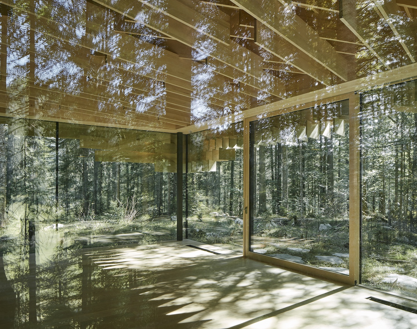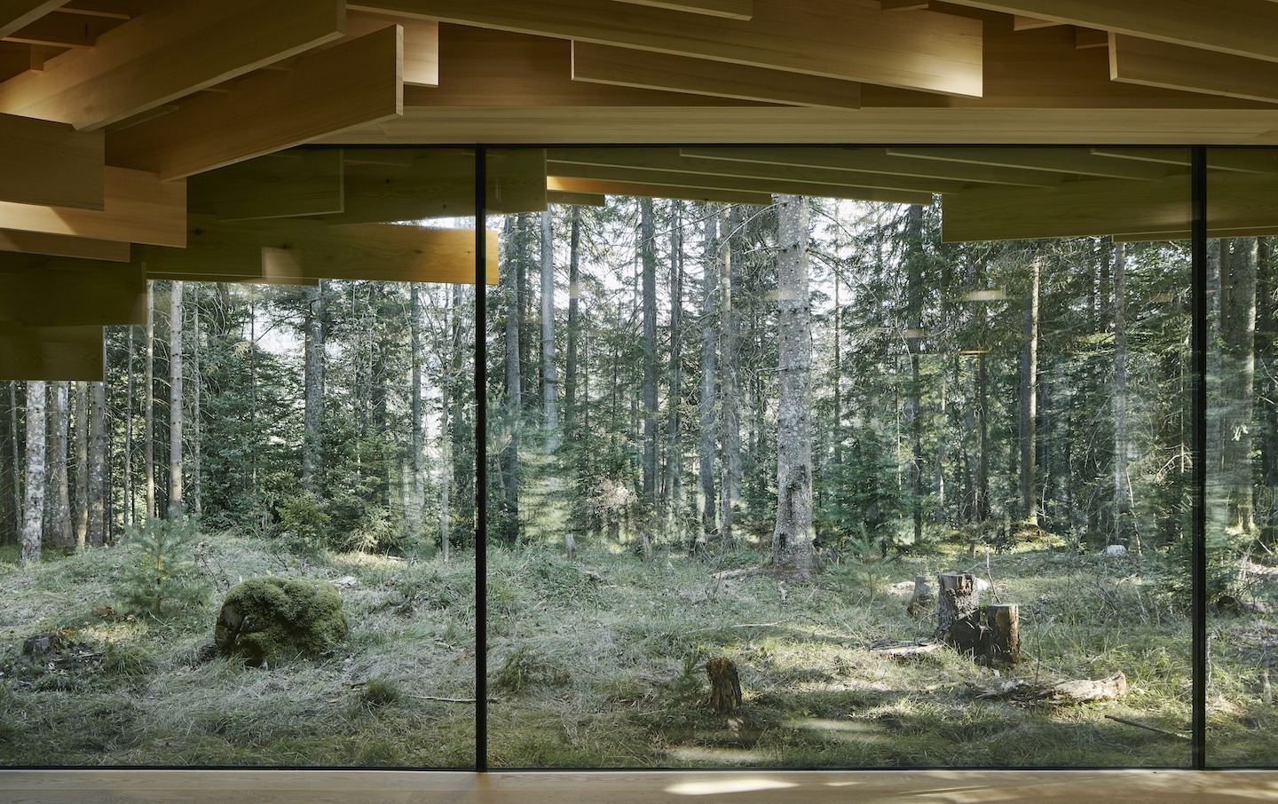 Der grosse Meditationsraum ist rahmenlos zum Wald hin verglast, das Dach scheint hier zu schweben. Eine grosse Schiebetür verbindet das Innere mit dem Wald, der