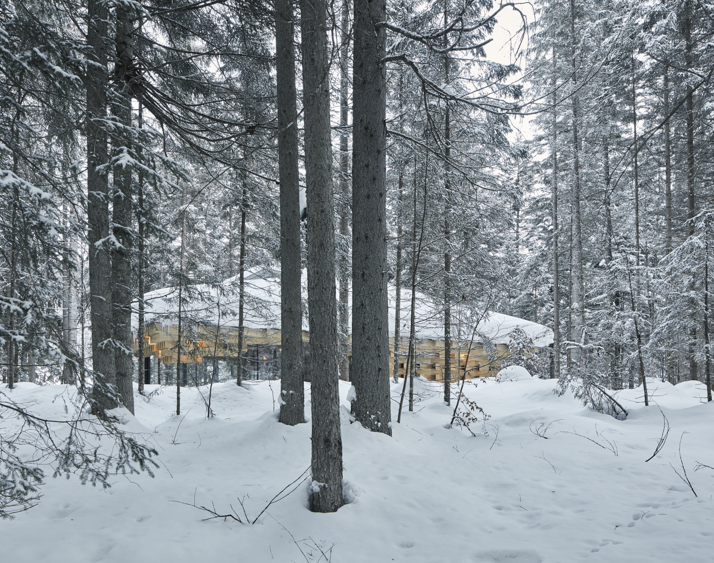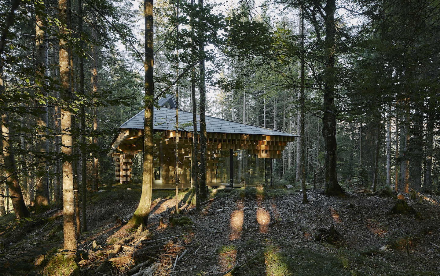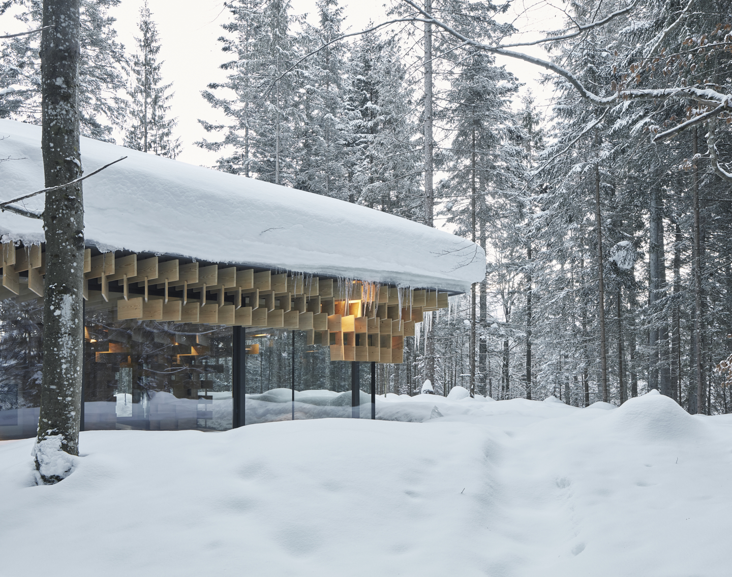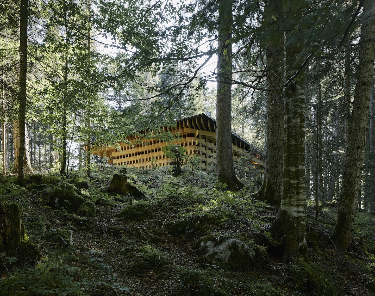 Mit einer Grundfläche von 18 x 8 Meter ist der Solitärkörper auf eine Waldlichtung zwischen die Bäume fast wie gezaubert worden.