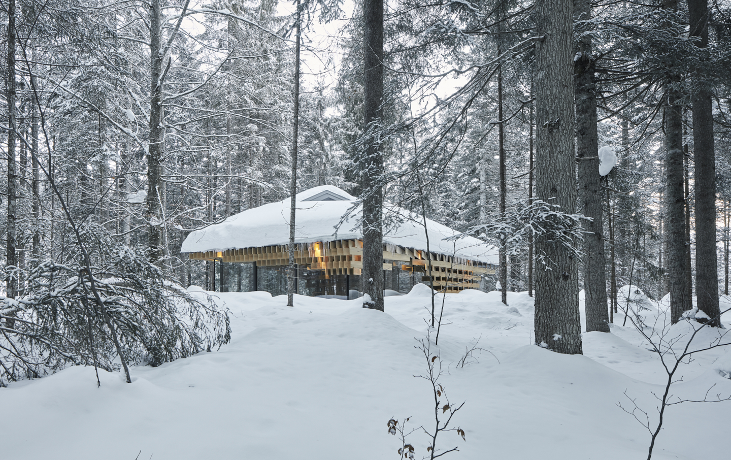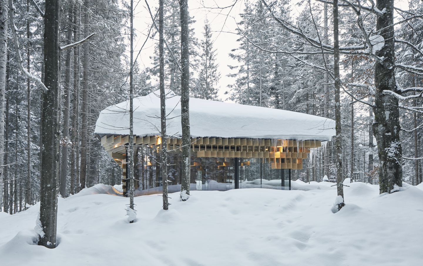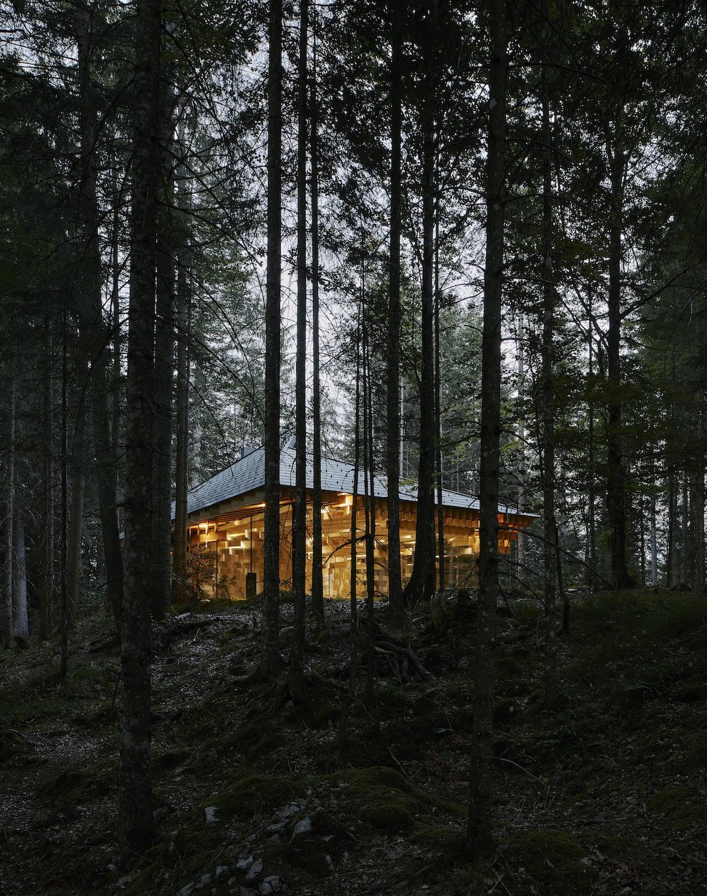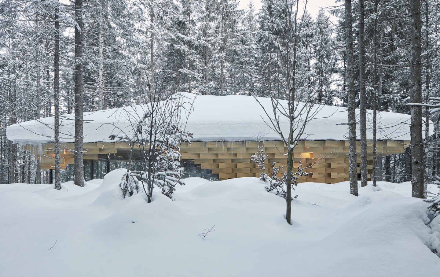 Mit einer Grundfläche von 18 x 8 Meter ist der Solitärkörper auf eine Waldlichtung zwischen die Bäume fast wie gezaubert worden.
