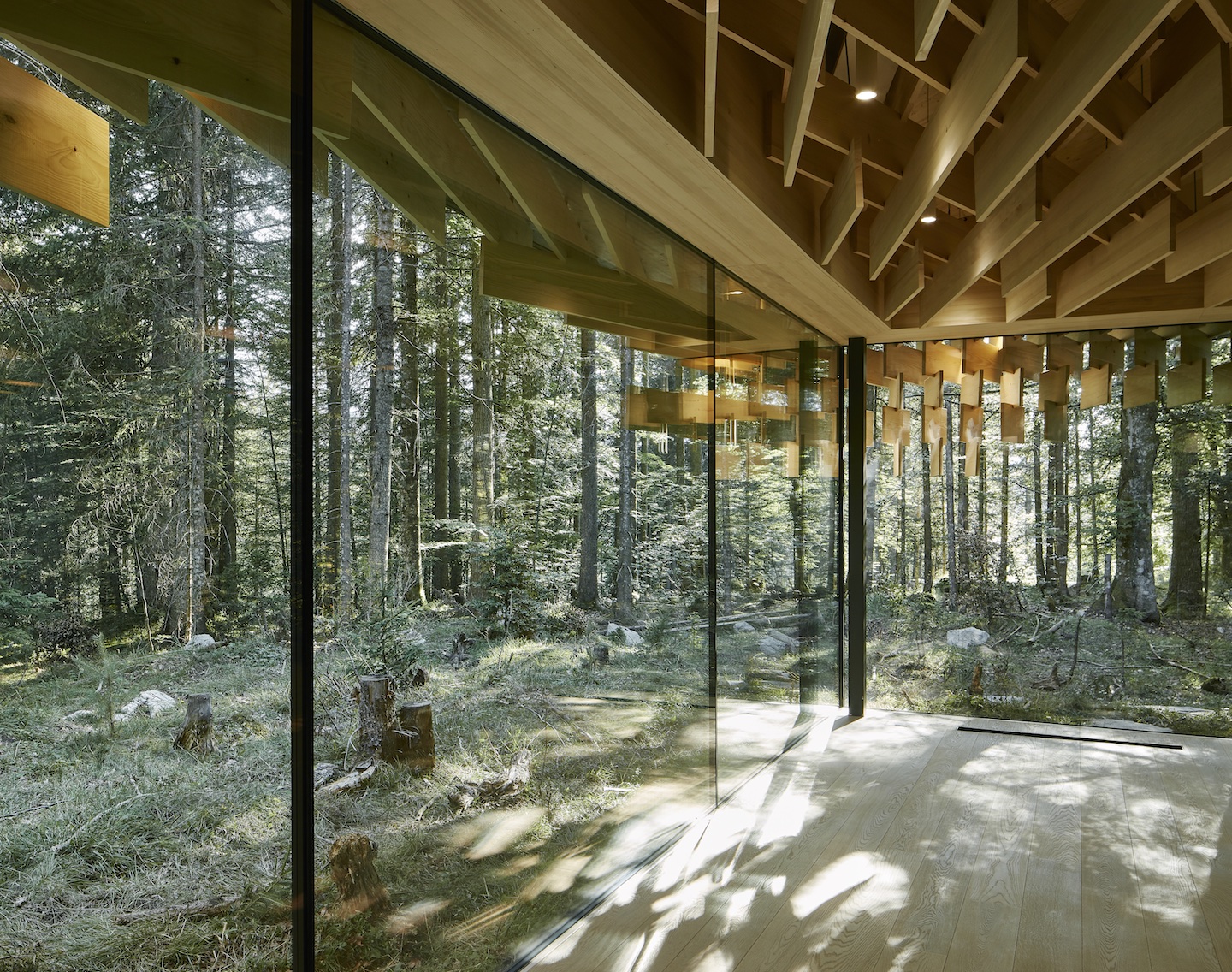 Meditiert wird in der gebauten Umgebung von ca. 1.600 aufgefalteten und in 20 vertikalen Reihen diagonal angeordneten Tannenbrettern. Die Brettschlichtungen folgen einem Rythmus: kurz und eng gefaltet schützen sie den Besucher, ähnlich verschränkter Hände. Die Öffnung zur Waldlichtung erfolgt sanft durch längere und fliessend angeordnete Bretter, welche sich in transparente, rahmenlose Glasflächen auflösen. Das Innere des Gebäudes spiegelt die Aussenschlichtung der Hölzer wieder, der innere Raster ist exakt gleich dem Äusseren. Der Holhraum des aufgefalteten Daches ist gefüllt mit abhängten, dem Diagonalraster folgenden Tannenbrettern. Dieses Holzvolumen gibt dem Raum mit seinen Glaswänden die akustische Dämpfung.