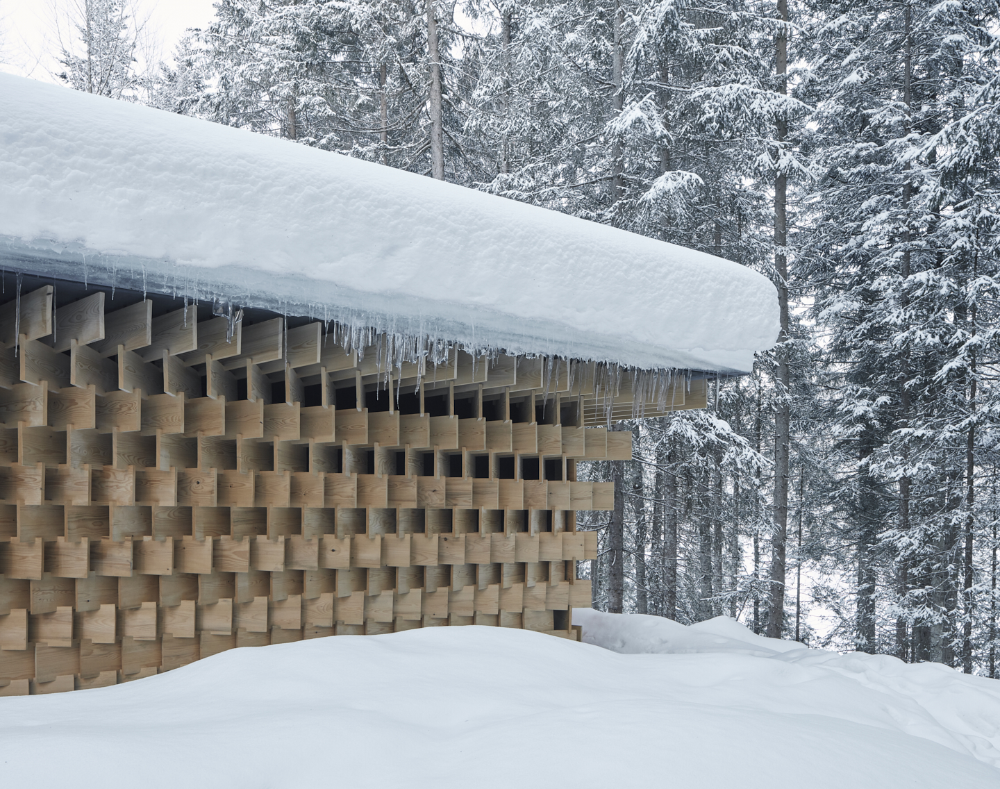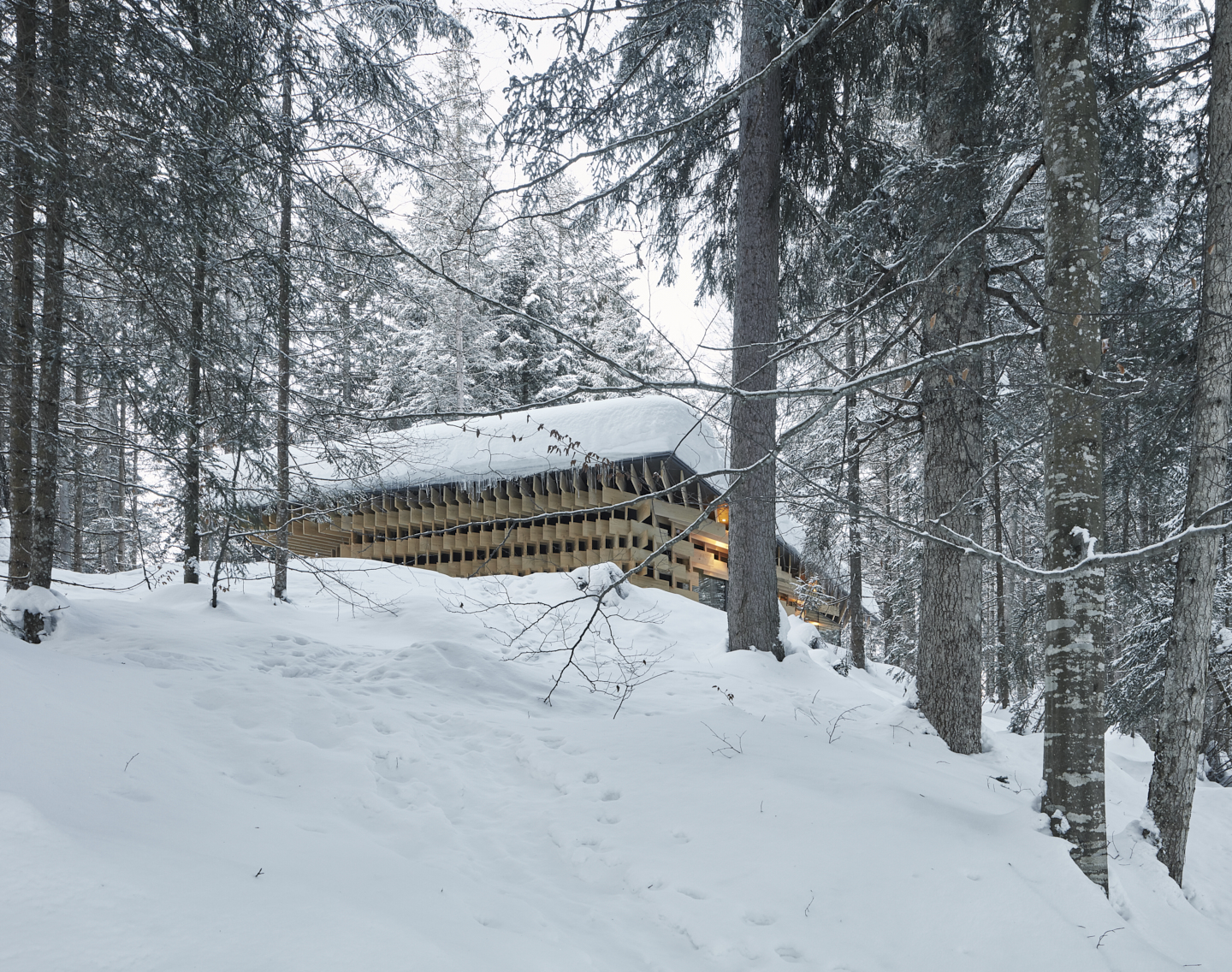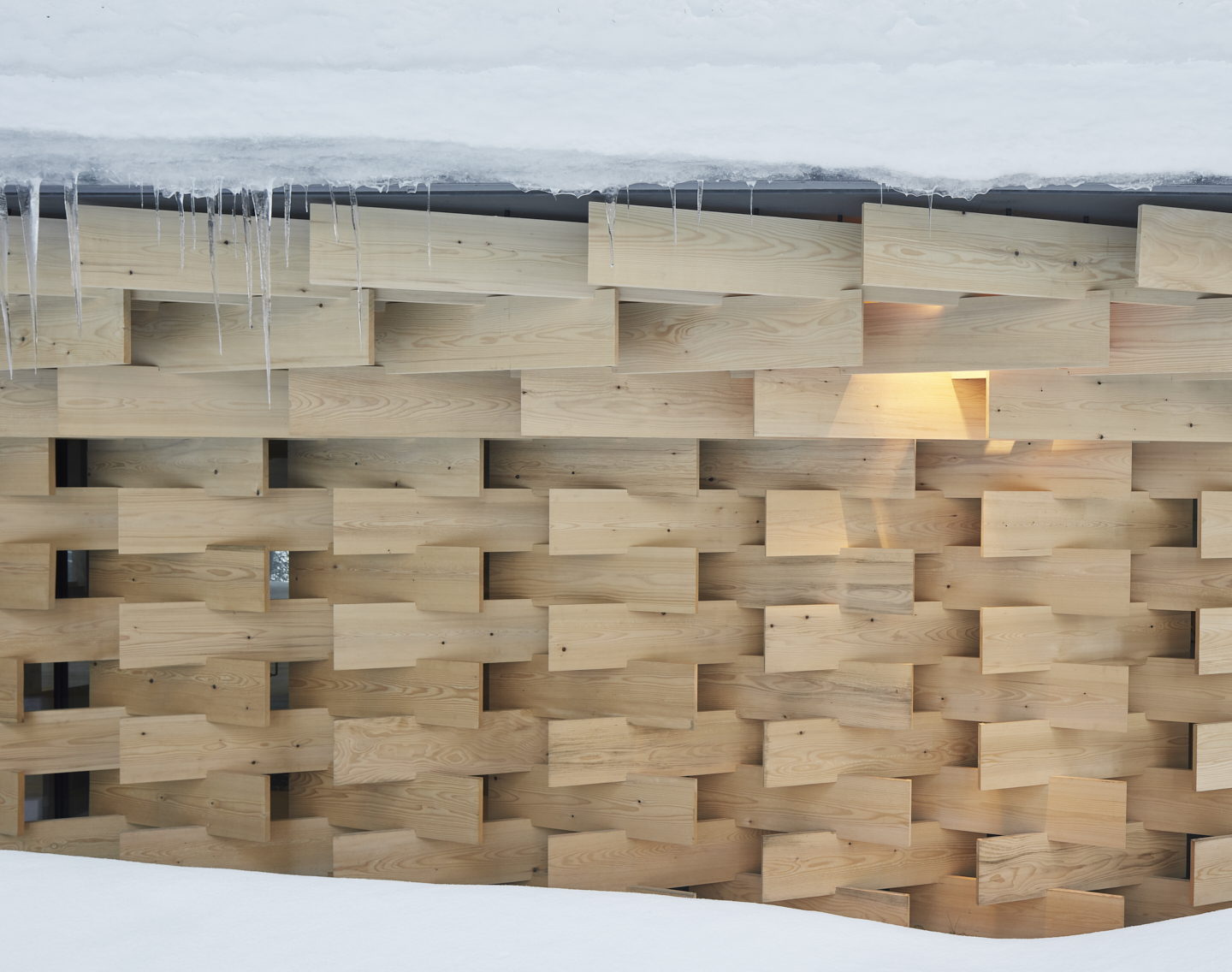 Das Gebäude wirkt für den zu Fuss Ankommenden wie eine geschlossene, hölzerne Schutzhülle. Kurze, sich steil auffaltende Holzbretter bilden eine dichte, schützenden Hülle um die Fassade. Die Brettschlichtungen werden länger und loser und das Gebäude gewinnt an Transparenz.