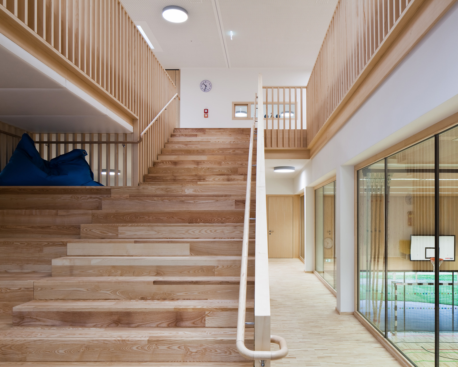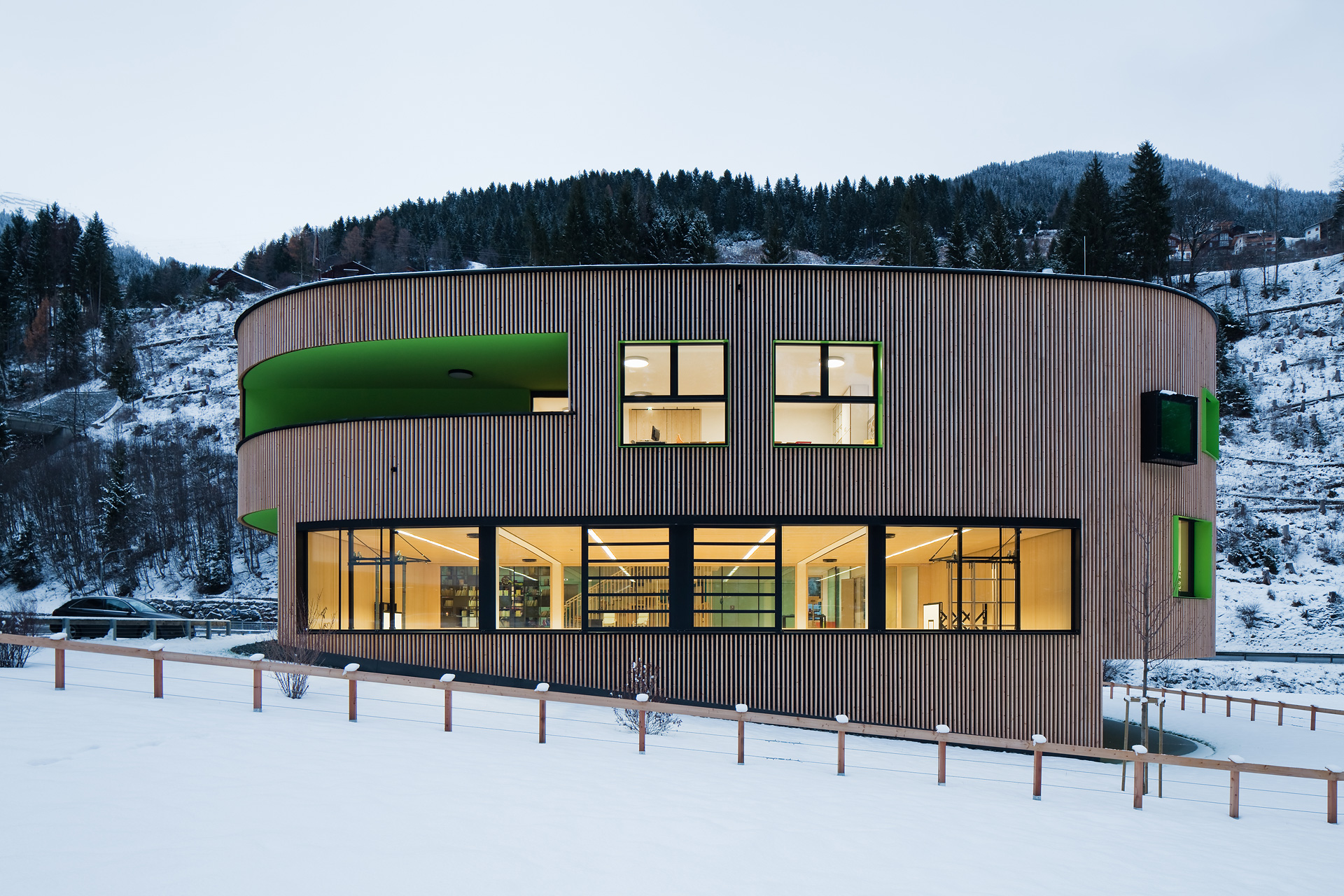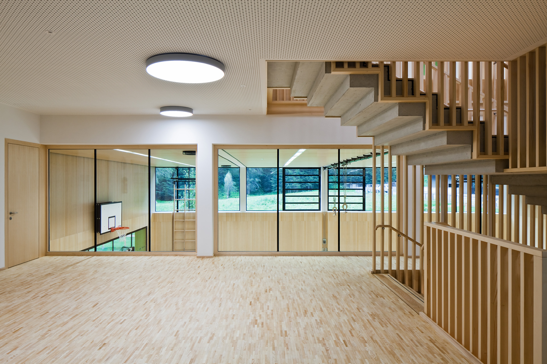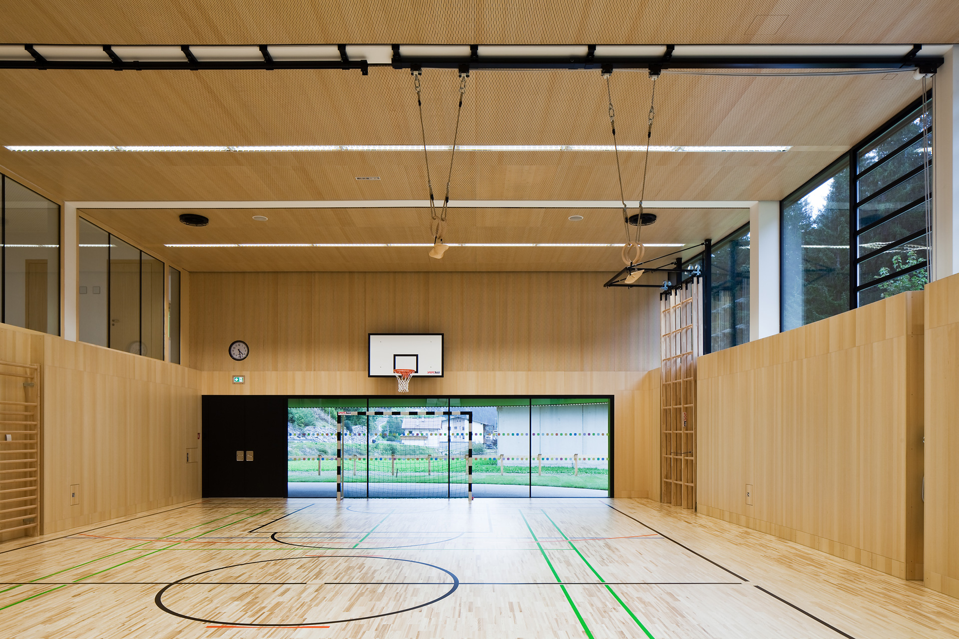 Im Gebäudeinneren herrscht ein offener fließender Charakter vor, der über alle Geschoße mit Blickbezügen die Flächen verbindet. Hier ist Raum für vielfältige Nutzungen und zeitgemäße Pädagogik, innerhalb der vernetzten Cluster. So spannt sich das räumliche Angebot vom integrierten Turnsaal im Untergeschoß bis in die zentrale Lernlandschaft unter dem Dach. Neben der Schulnutzung sind durch variable Raumabtrennungen auch sonstige Veranstaltungen in einem flexibel bespielbaren Haus möglich. Zusätzlich verbinden Bezüge ins Freie die neue Volksschule mit dem Tal und dem großartigen alpinen Landschaftsraum. (Text: Architekten, bearbeitet)