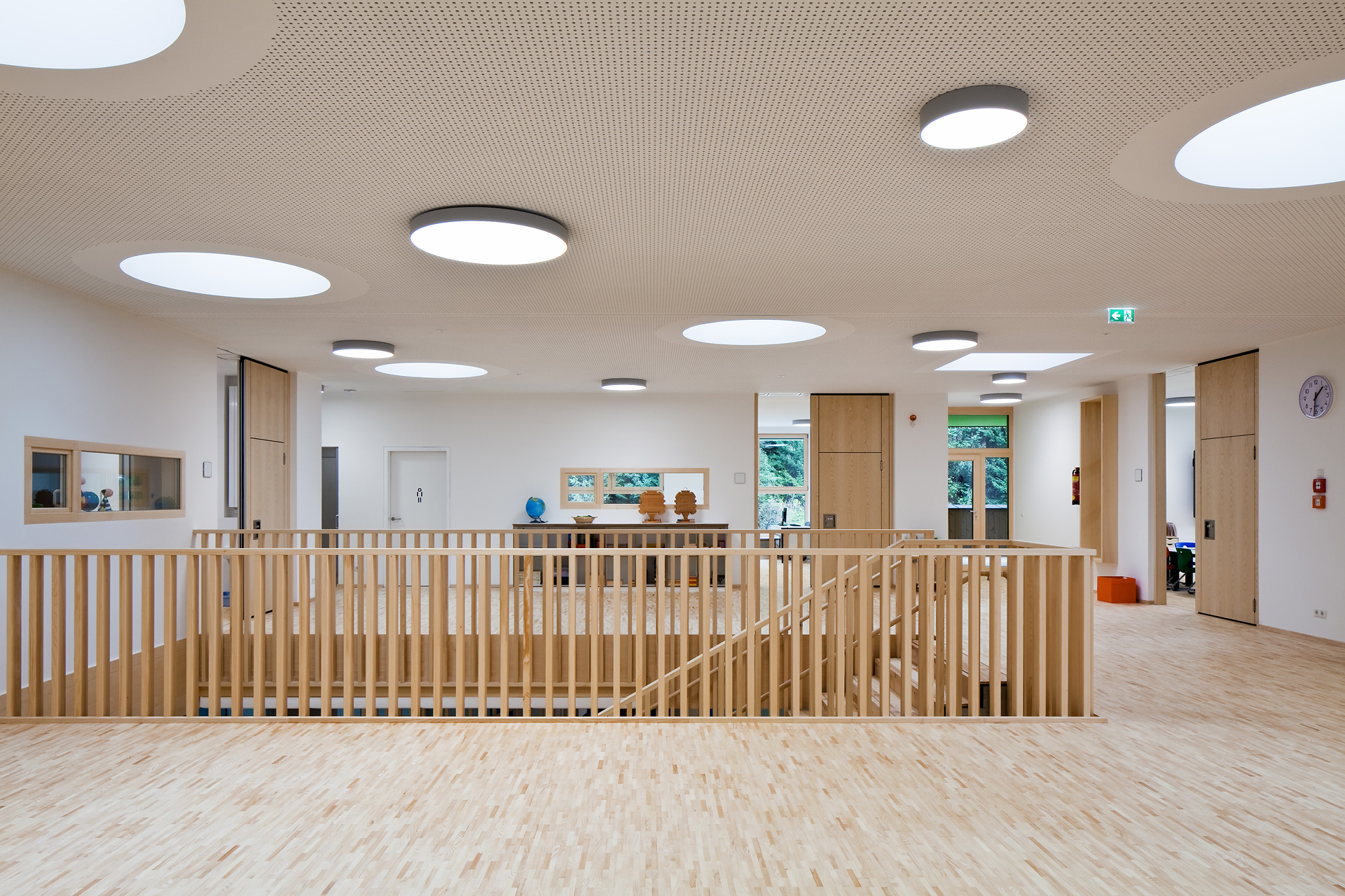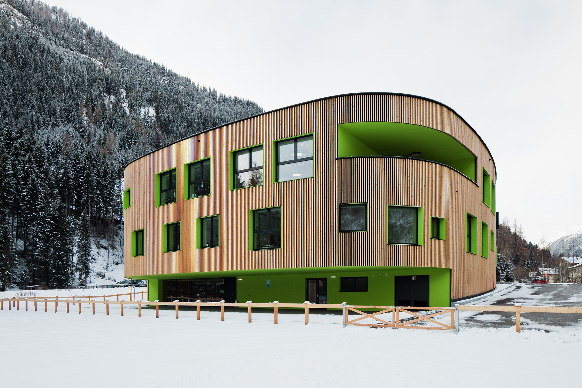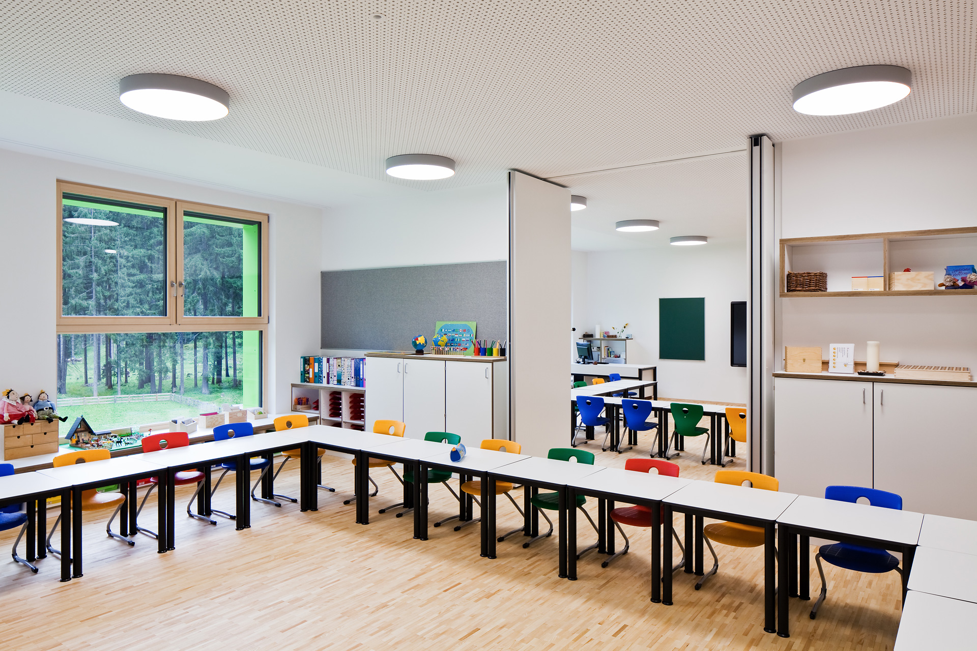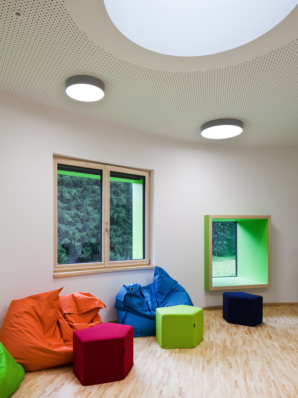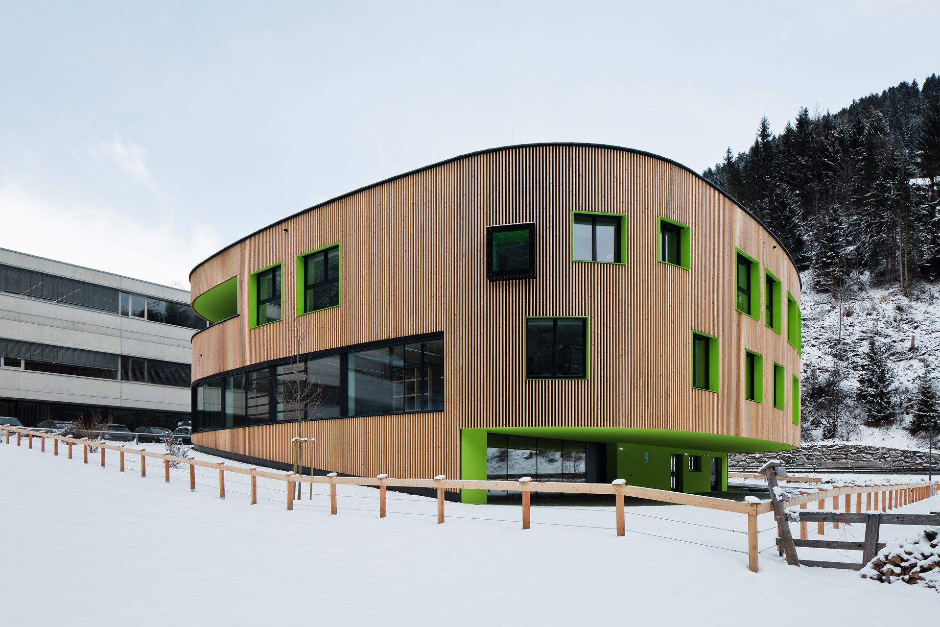 Im Gebäudeinneren herrscht ein offener fließender Charakter vor, der über alle Geschoße mit Blickbezügen die Flächen verbindet. Hier ist Raum für vielfältige Nutzungen und zeitgemäße Pädagogik, innerhalb der vernetzten Cluster. So spannt sich das räumliche Angebot vom integrierten Turnsaal im Untergeschoß bis in die zentrale Lernlandschaft unter dem Dach. Neben der Schulnutzung sind durch variable Raumabtrennungen auch sonstige Veranstaltungen in einem flexibel bespielbaren Haus möglich. Zusätzlich verbinden Bezüge ins Freie die neue Volksschule mit dem Tal und dem großartigen alpinen Landschaftsraum. (Text: Architekten, bearbeitet)
