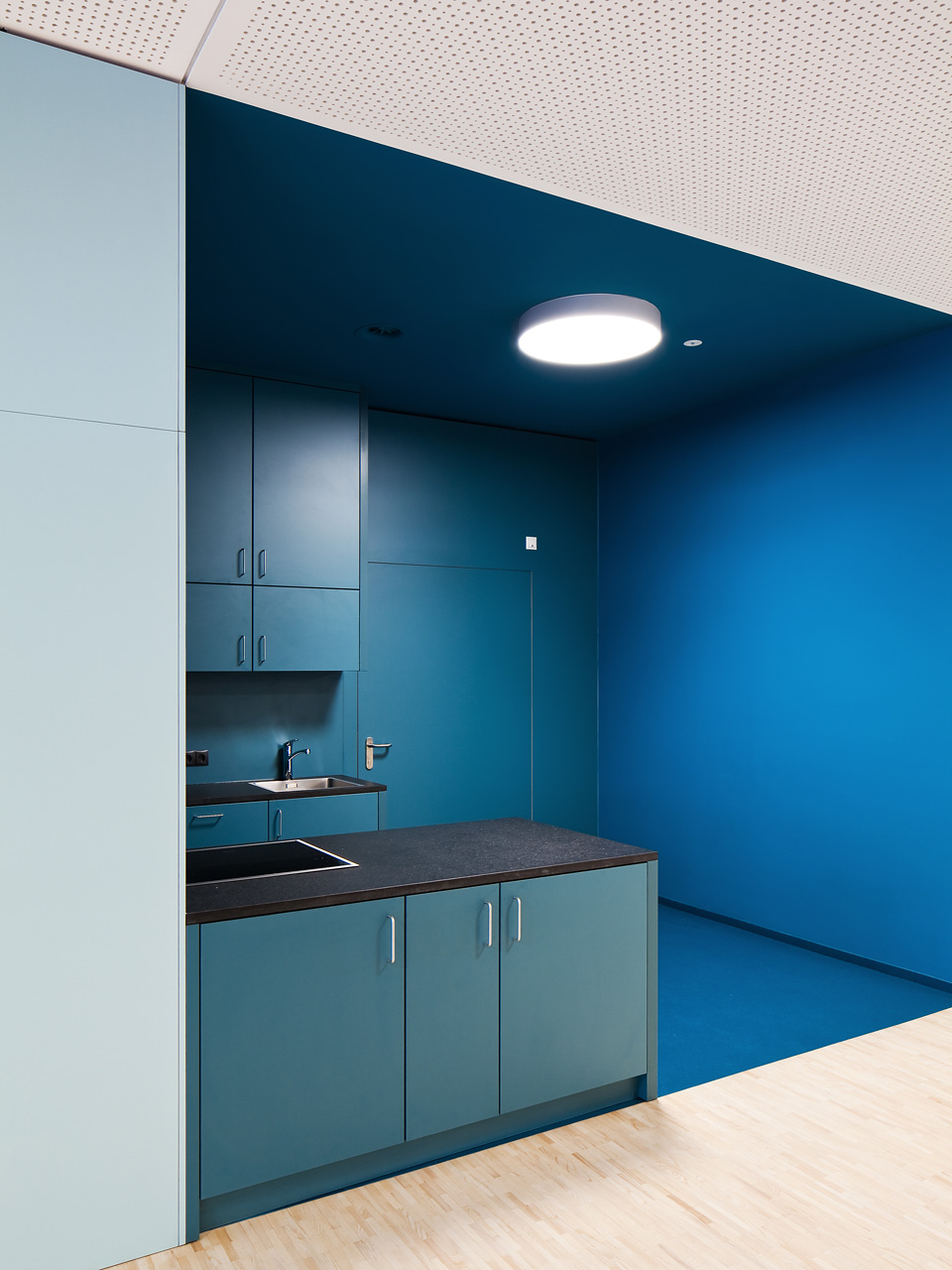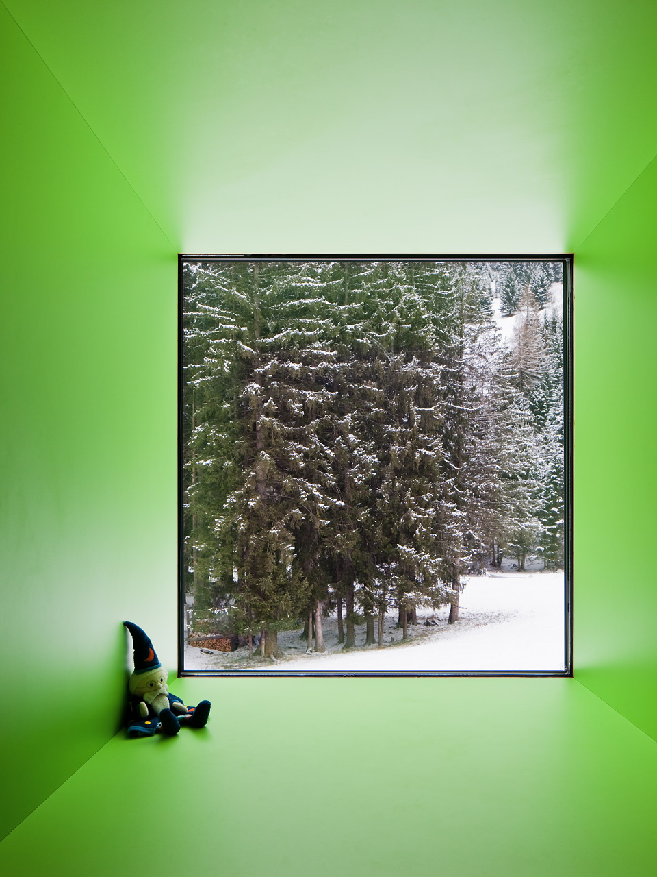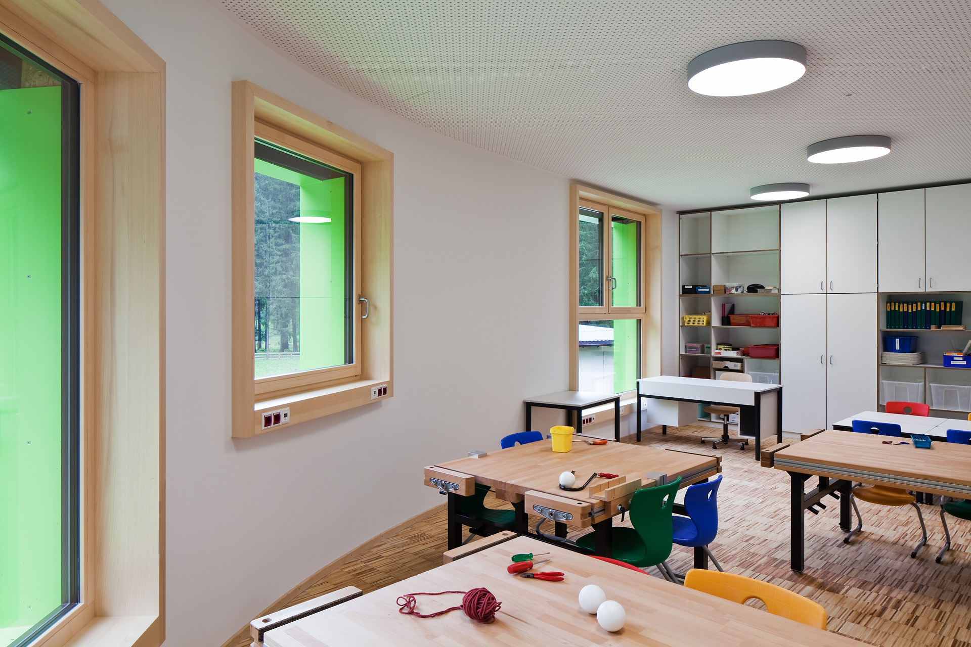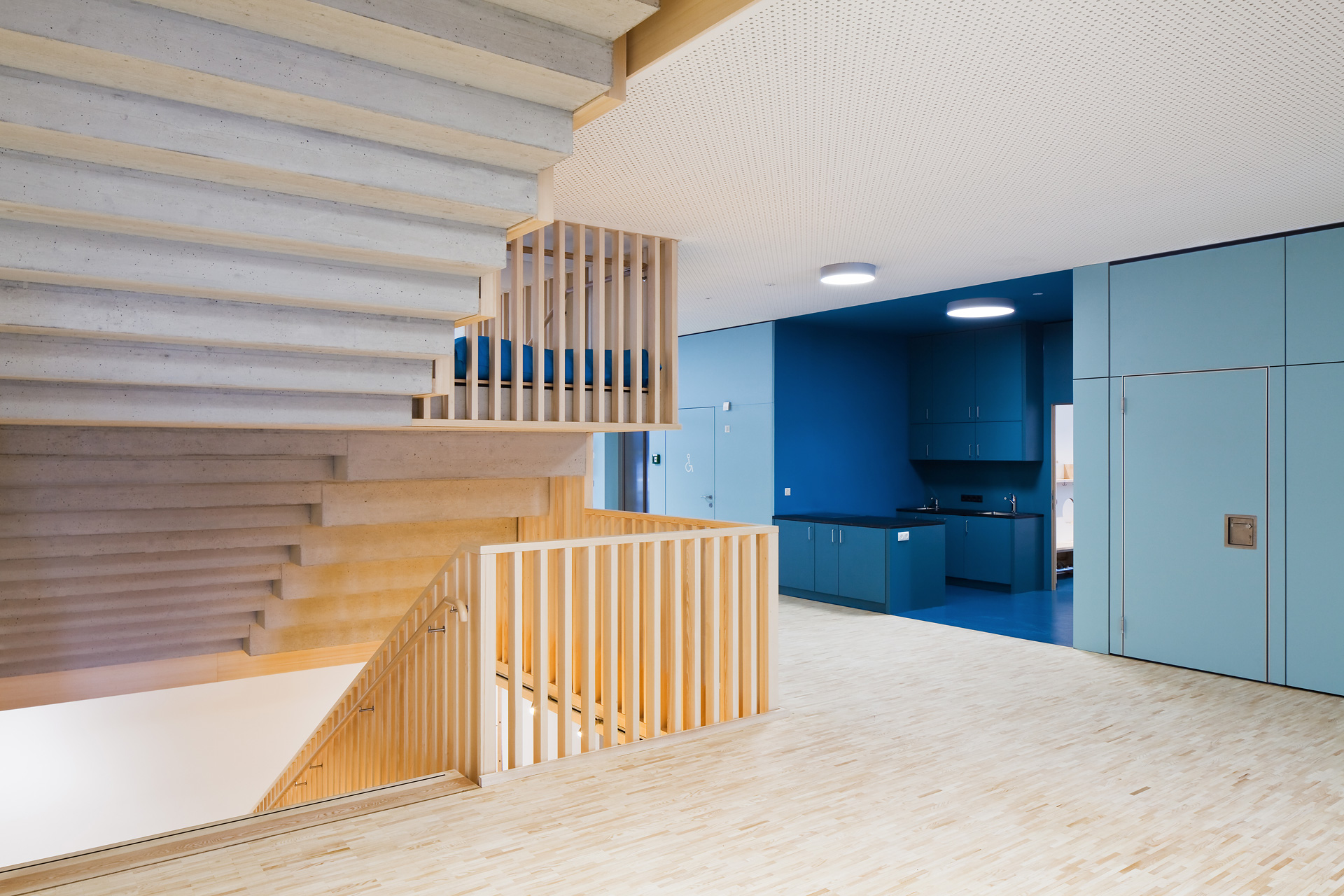 Im Gebäudeinneren herrscht ein offener fließender Charakter vor, der über alle Geschoße mit Blickbezügen die Flächen verbindet. Hier ist Raum für vielfältige Nutzungen und zeitgemäße Pädagogik, innerhalb der vernetzten Cluster. So spannt sich das räumliche Angebot vom integrierten Turnsaal im Untergeschoß bis in die zentrale Lernlandschaft unter dem Dach. Neben der Schulnutzung sind durch variable Raumabtrennungen auch sonstige Veranstaltungen in einem flexibel bespielbaren Haus möglich. Zusätzlich verbinden Bezüge ins Freie die neue Volksschule mit dem Tal und dem großartigen alpinen Landschaftsraum. (Text: Architekten, bearbeitet)