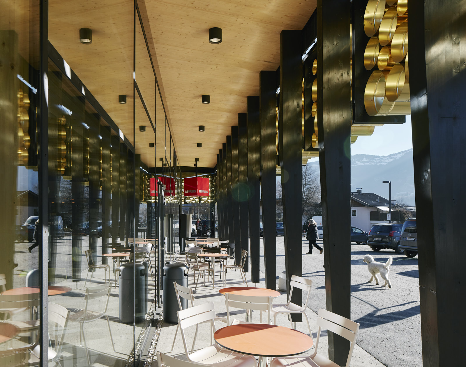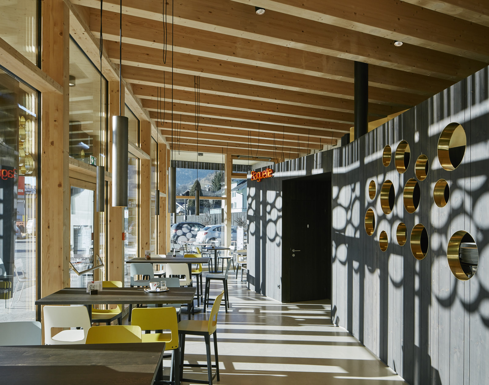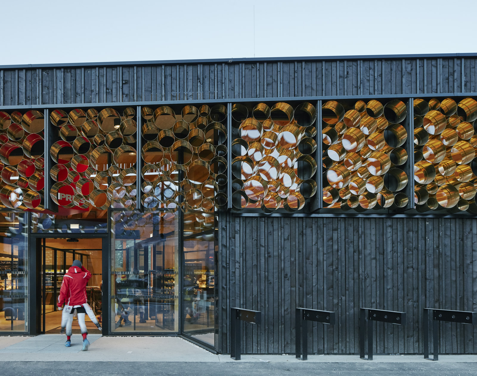 Die dunkel lasierte Holzfassade kontrastiert das Lichtspiel der Sonne an den goldig schimmernden Zylindern und lässt die Holzkonstruktion auch in den Außenraum hinein wirken. (Text: Architekt:innen)